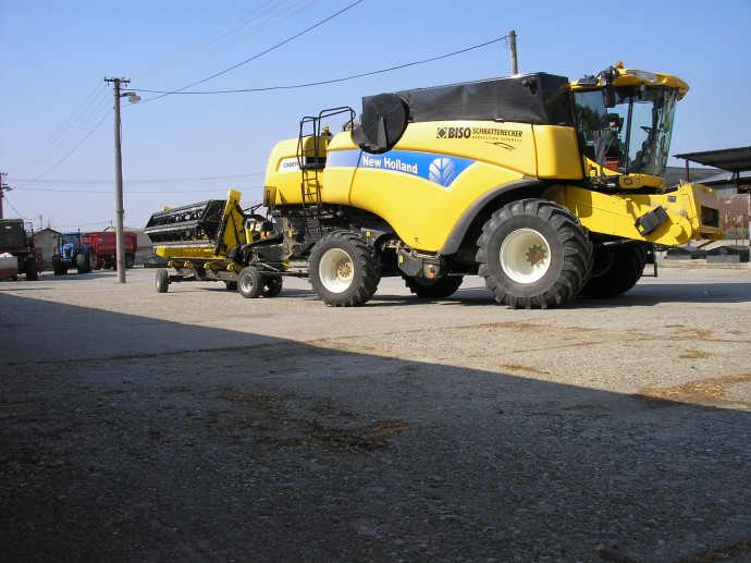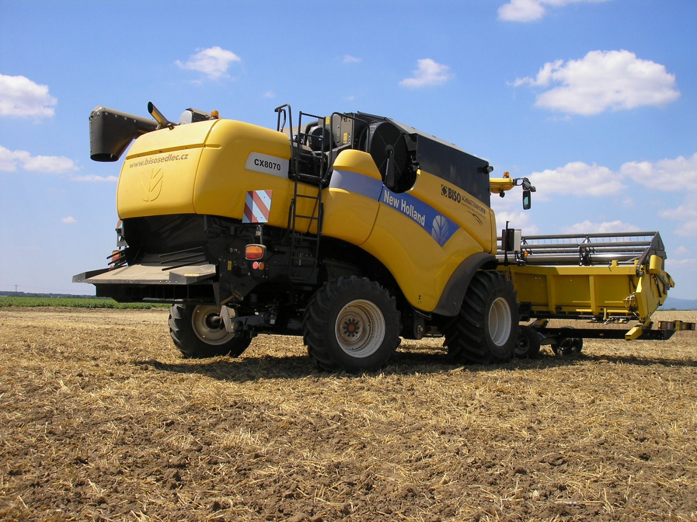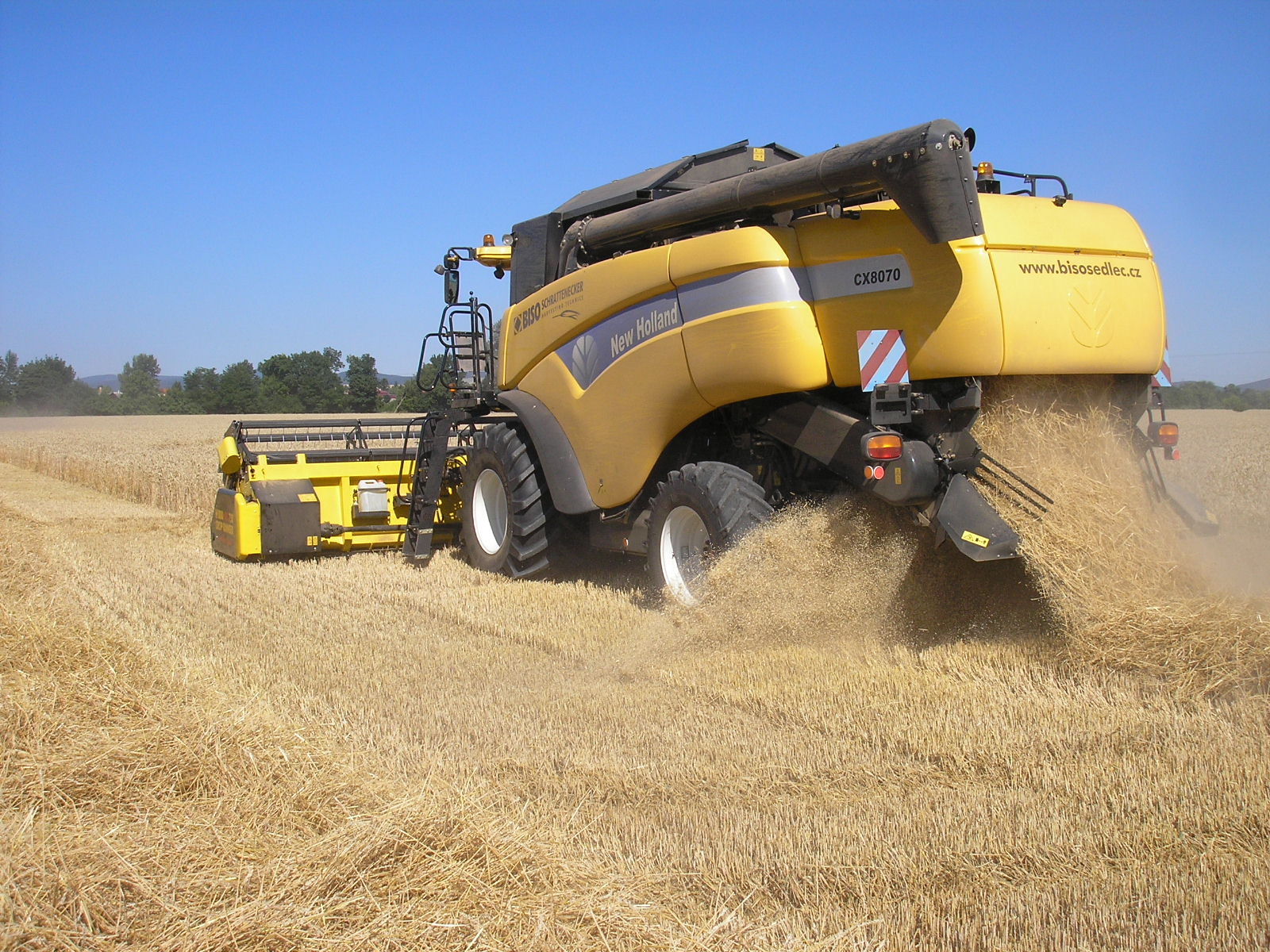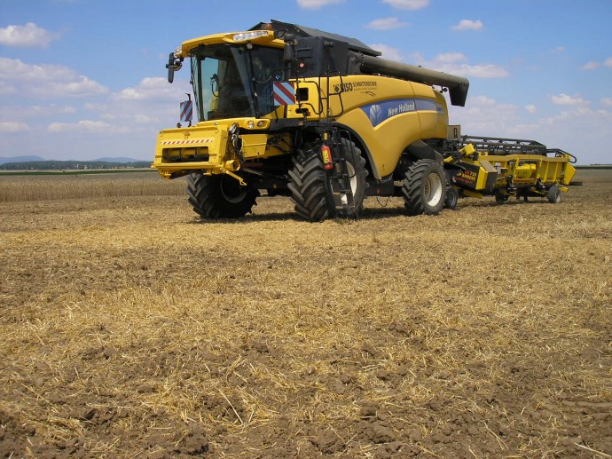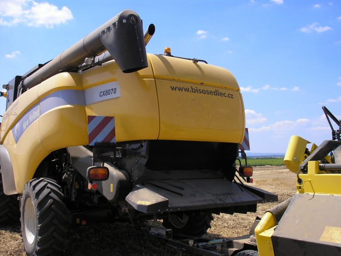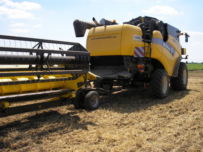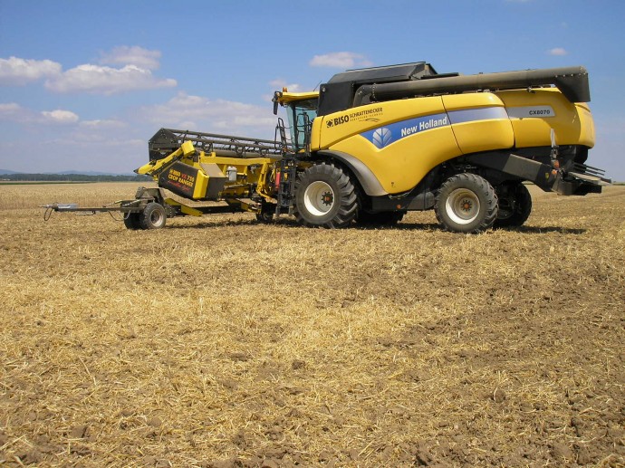 Eslovaquia y República Checa en 2013. New Holland CX8070SL equipada con cabezal BISO CropRanger VX750 TrendLineLight con cuchillas verticales accionadas eléctricamente (2ET) y carro de transporte BISO Profi.