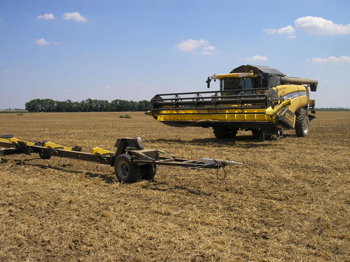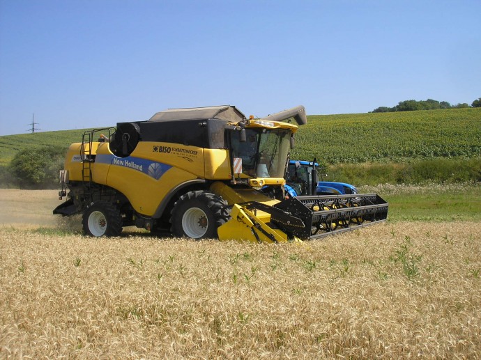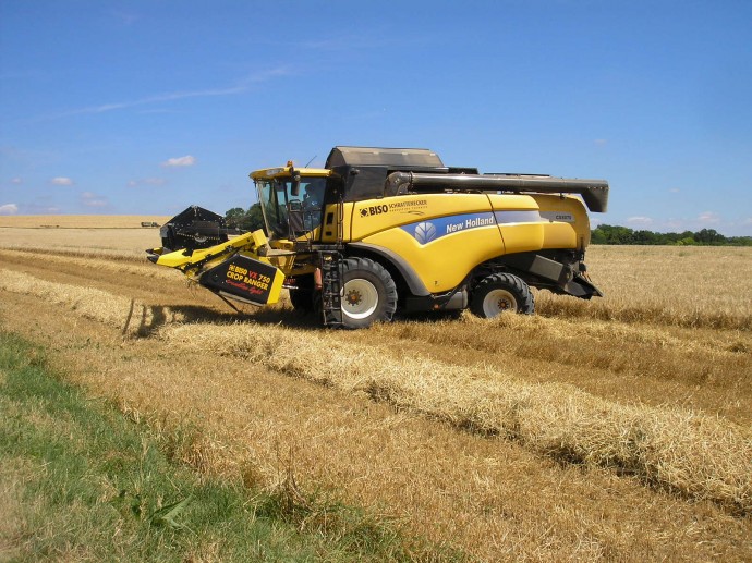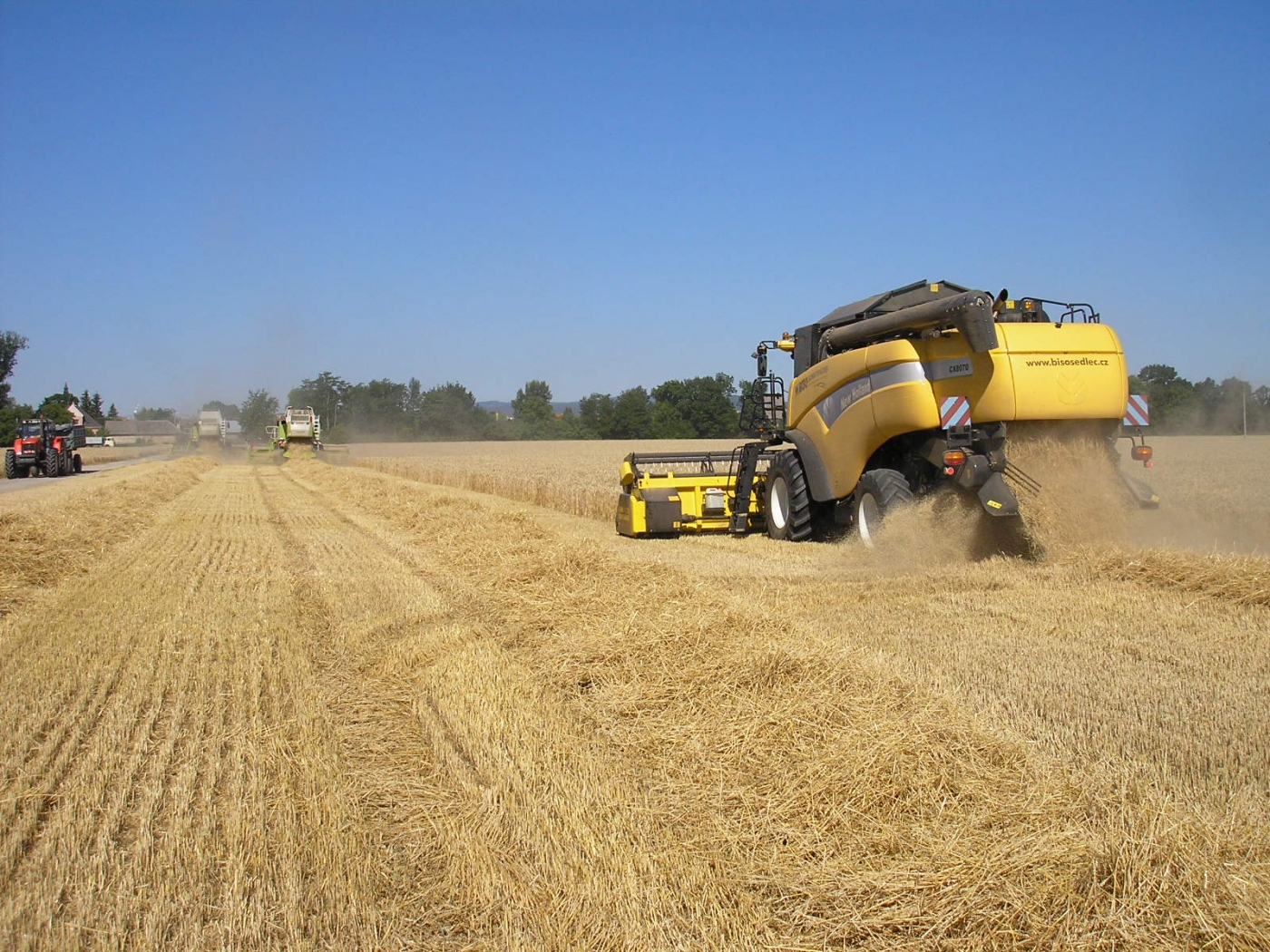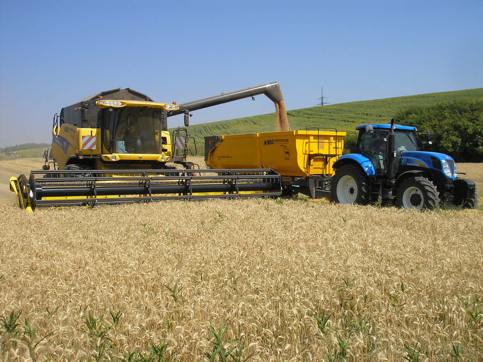 Eslovaquia y República Checa en 2013. New Holland CX8070SL equipada con cabezal BISO CropRanger VX750 TrendLineLight con cuchillas verticales accionadas eléctricamente (2ET) y carro de transporte BISO Profi.