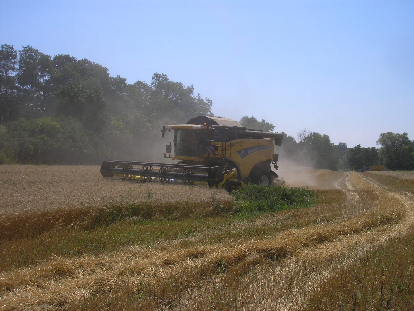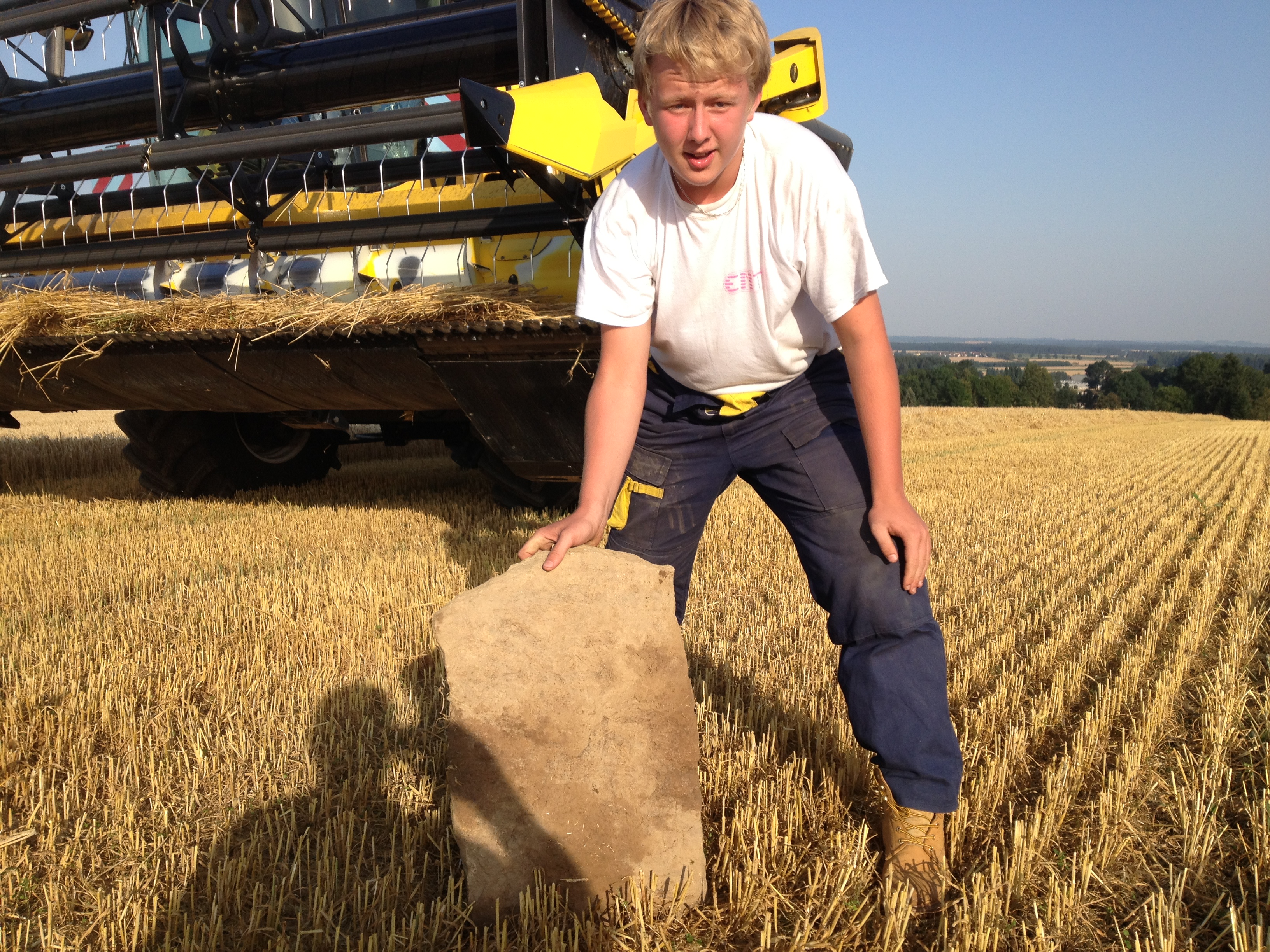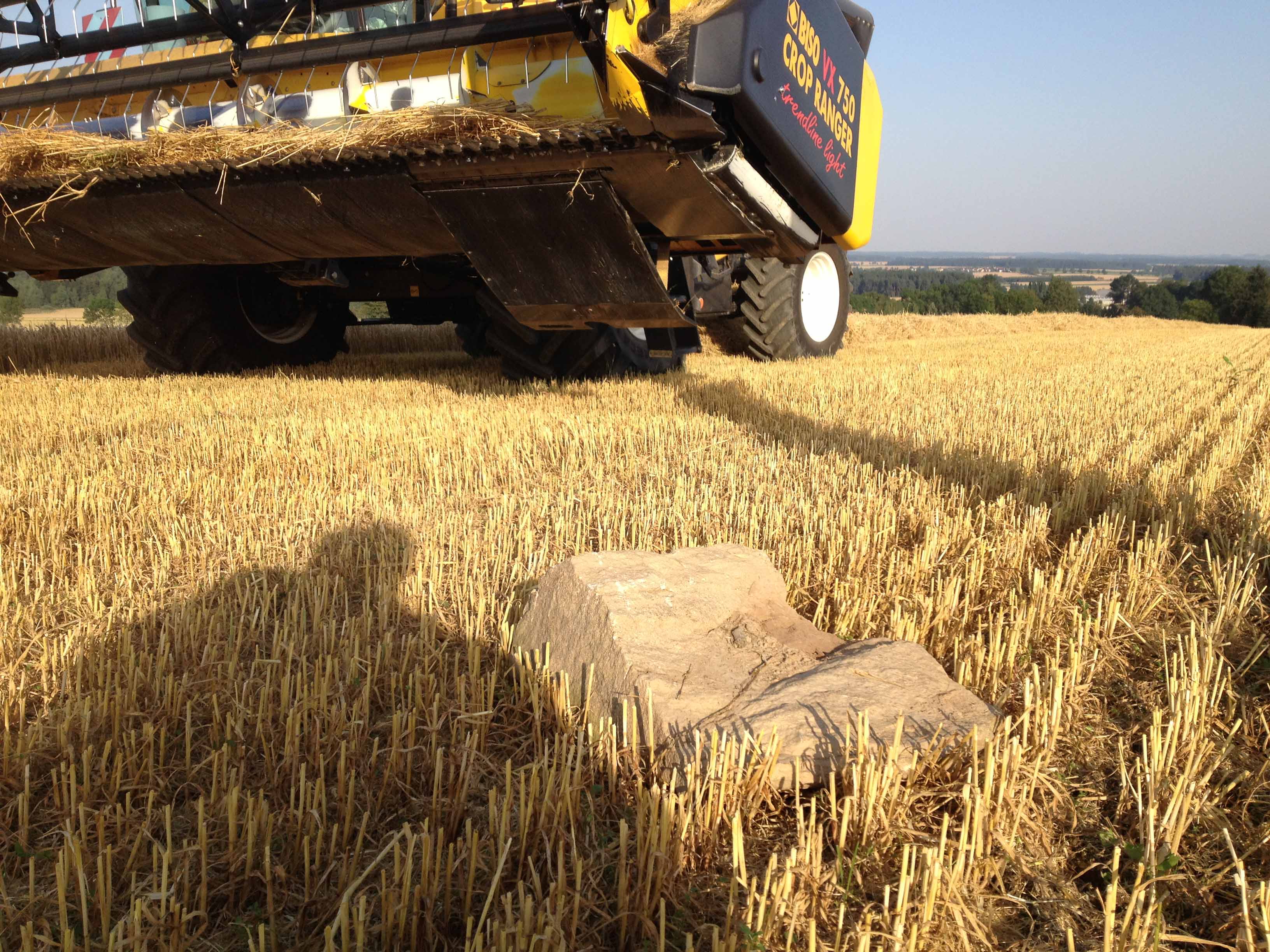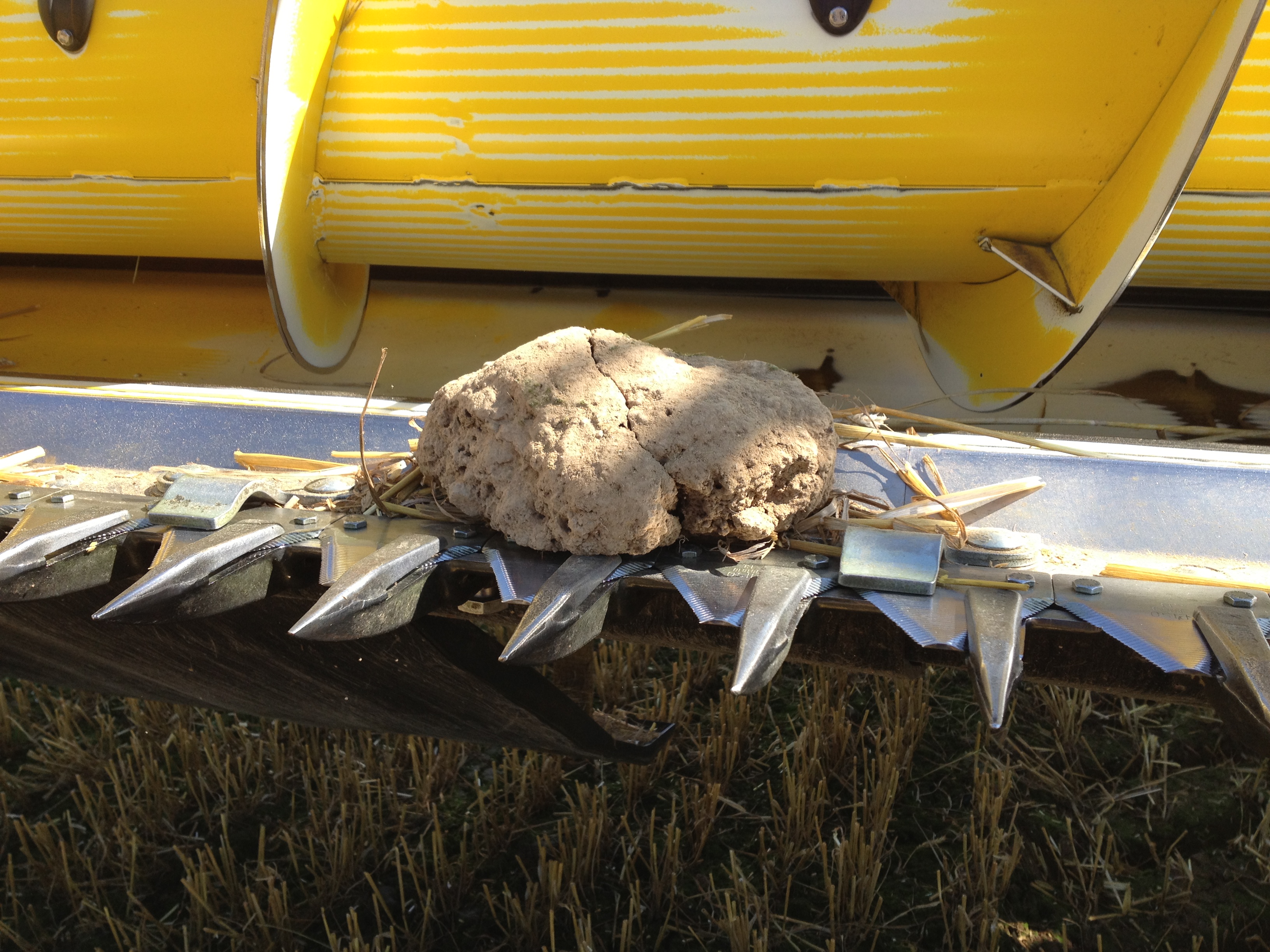 Mire el pequeño bulto detrás de la cuchilla. Funciona como protección anti-piedras. La foto muestra una situación realista en el campo en la que la cosechadora debe detenerse ya que una piedra se encuentra en el espacio entre la cuchilla y la trampa. El perfil y la altura son el resultado de muchos años de experiencia. Esta es una compensación entre protección y flujo de material.