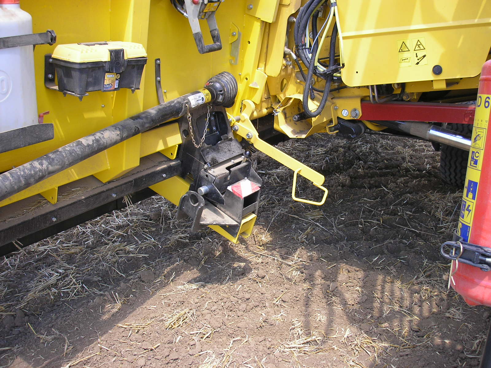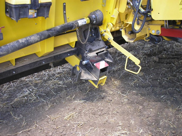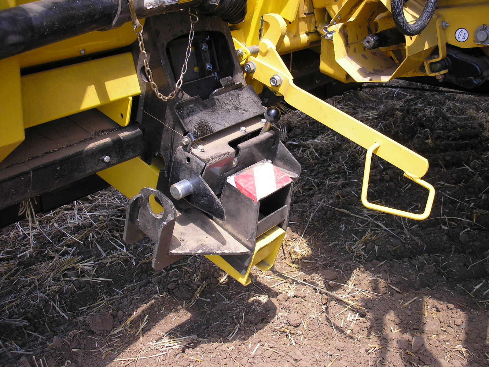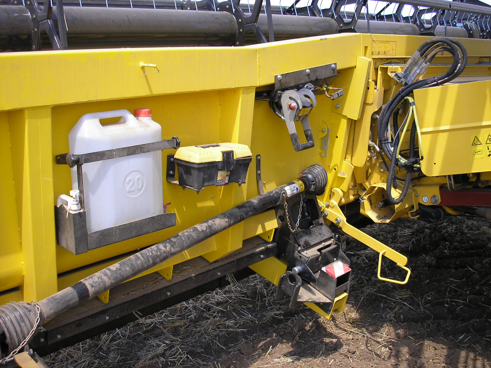 Las conexiones de la barra de corte y la cosechadora son las mismas para las cosechadoras New Holland y Case-IH. Para fijar la barra a la cosechadora es necesario asegurar el acoplamiento de la barra mediante la palanca amarilla, se insertan el eje cardán y el conector eléctrico y el acoplamiento rápido hidráulico CNH. Sobre esta barra también debemos conectar los dos conectores de las líneas eléctricas que van a las lamas laterales eléctricas (cables amarillos).