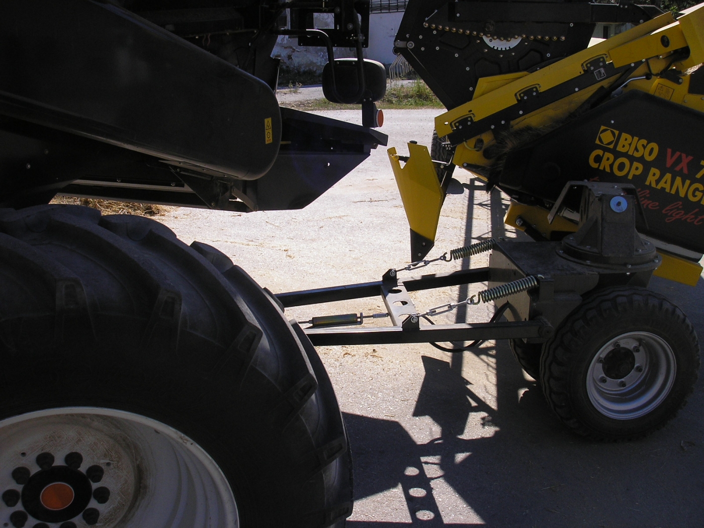 El eje delantero del carro Profi y la nueva carcasa para los divisores (para la cosecha de colza). Es posible levantar el timon a una posición vertical y fijarla para ahorrar espacio dentro de la nave durante el almacenamiento invernal. El carro Profi sigue la cosechadora gracias al sistema de dirección en el eje delantero.