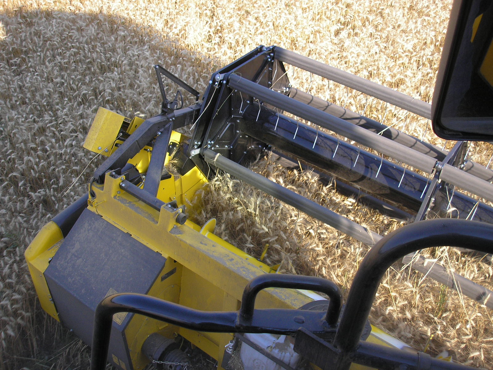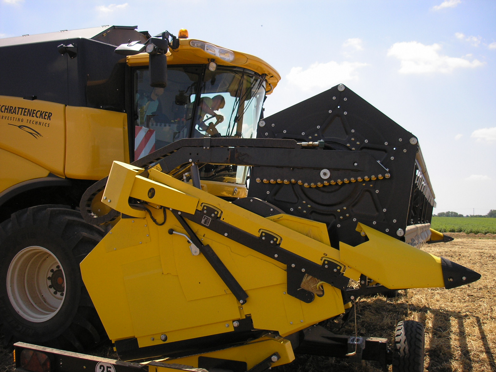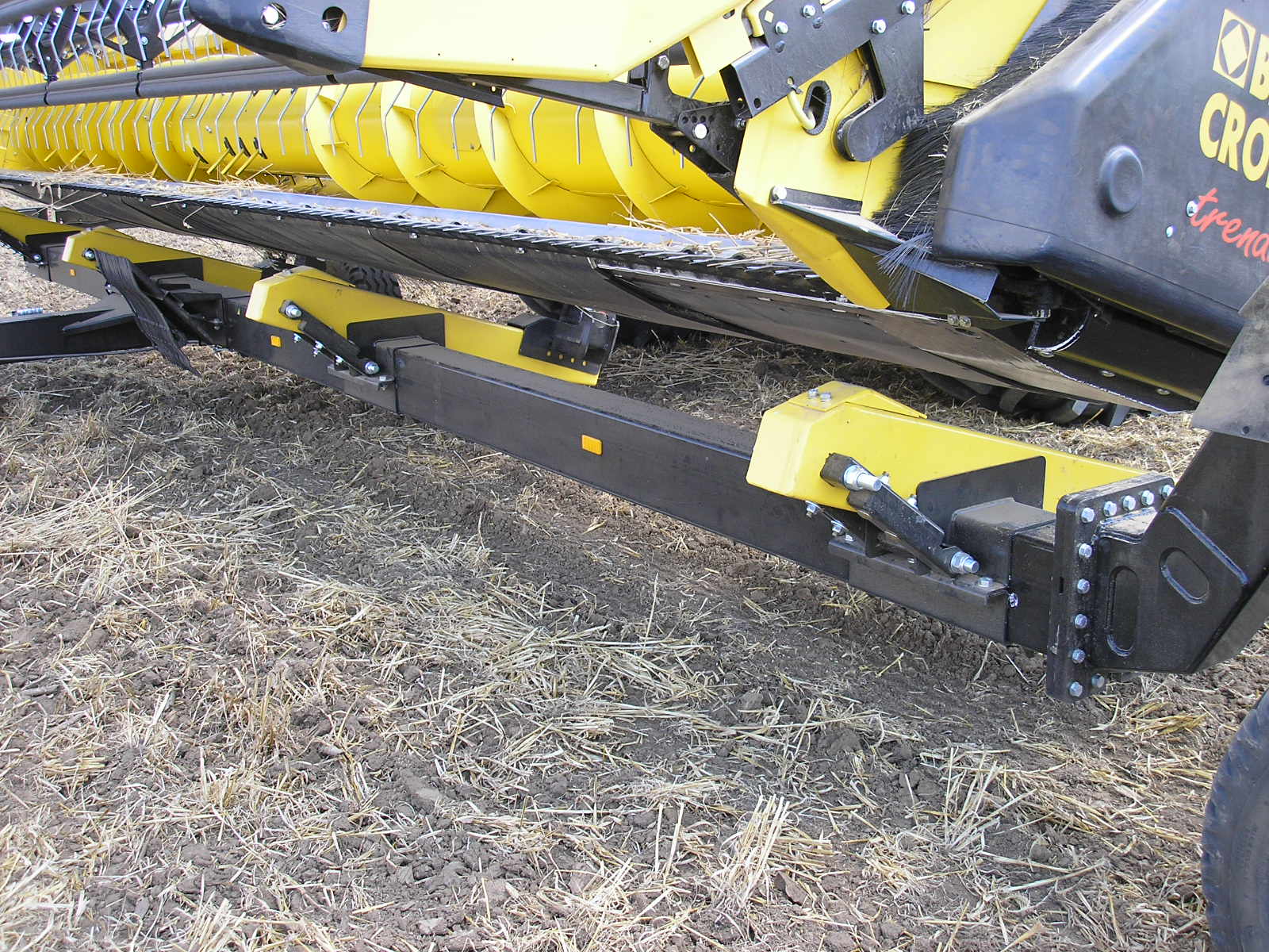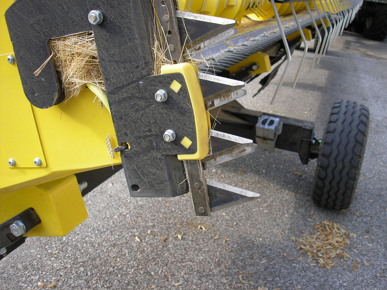 Esto cabezal tiene estrellas del molinete metálicas. Algunos cabezales están equipados con las estrellas de plástico más modernas (como los cabezales Ultralight). En la parte delantera izquierda del brazo del molinete se puede ver la línea de rodillos amarillos típica del CropRanger. Los rodillos protegen el molinete de posibles colisiones con la cuchilla de corte levantándola al actuar sobre la plataforma vario. Es un sistema mecánico simple y confiable.