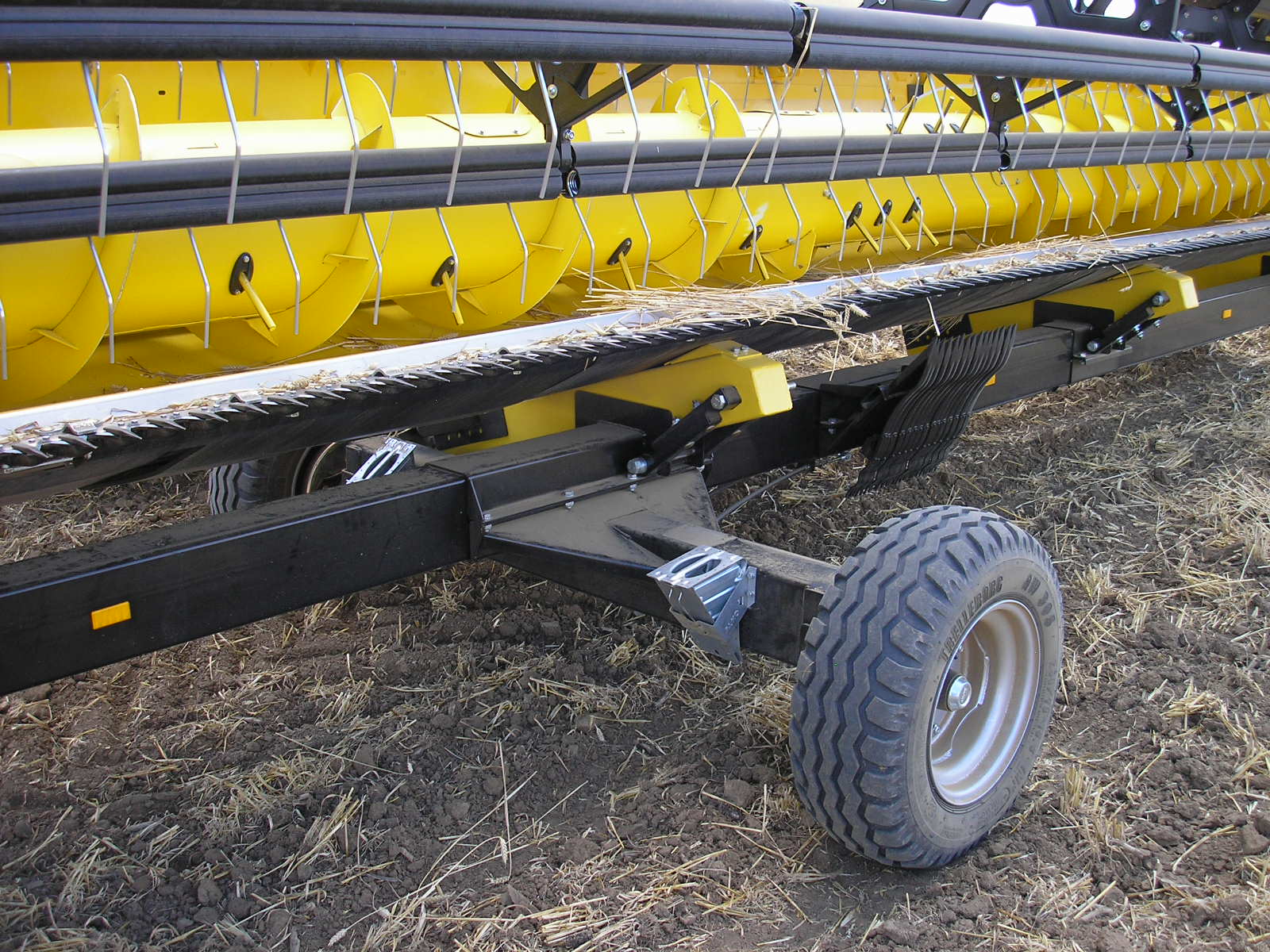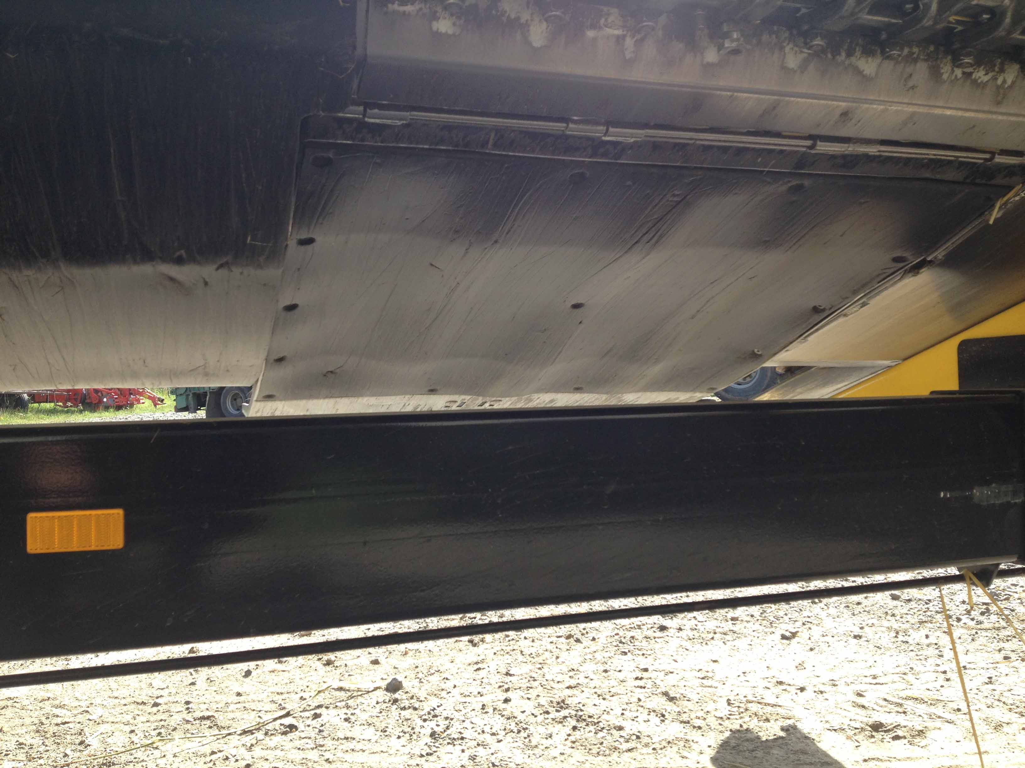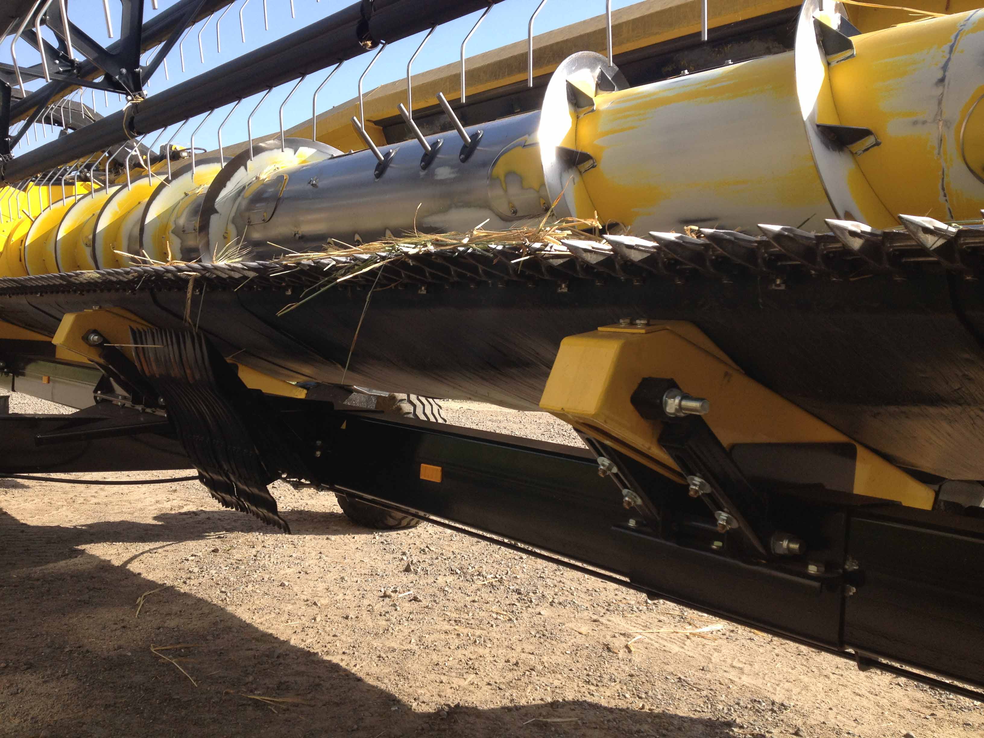 En esta imagen, está claro que el cabezal tiene dos patines de ajuste de suelo grandes. Antes de cargar el cabezal en el remolque se recomienda limpiar los patines en la parte superior para quitar la tierra seca y las piedras y luego bloquearlos en la posición superior. No todas los maquileros hacen esto bajo su propio riesgo.