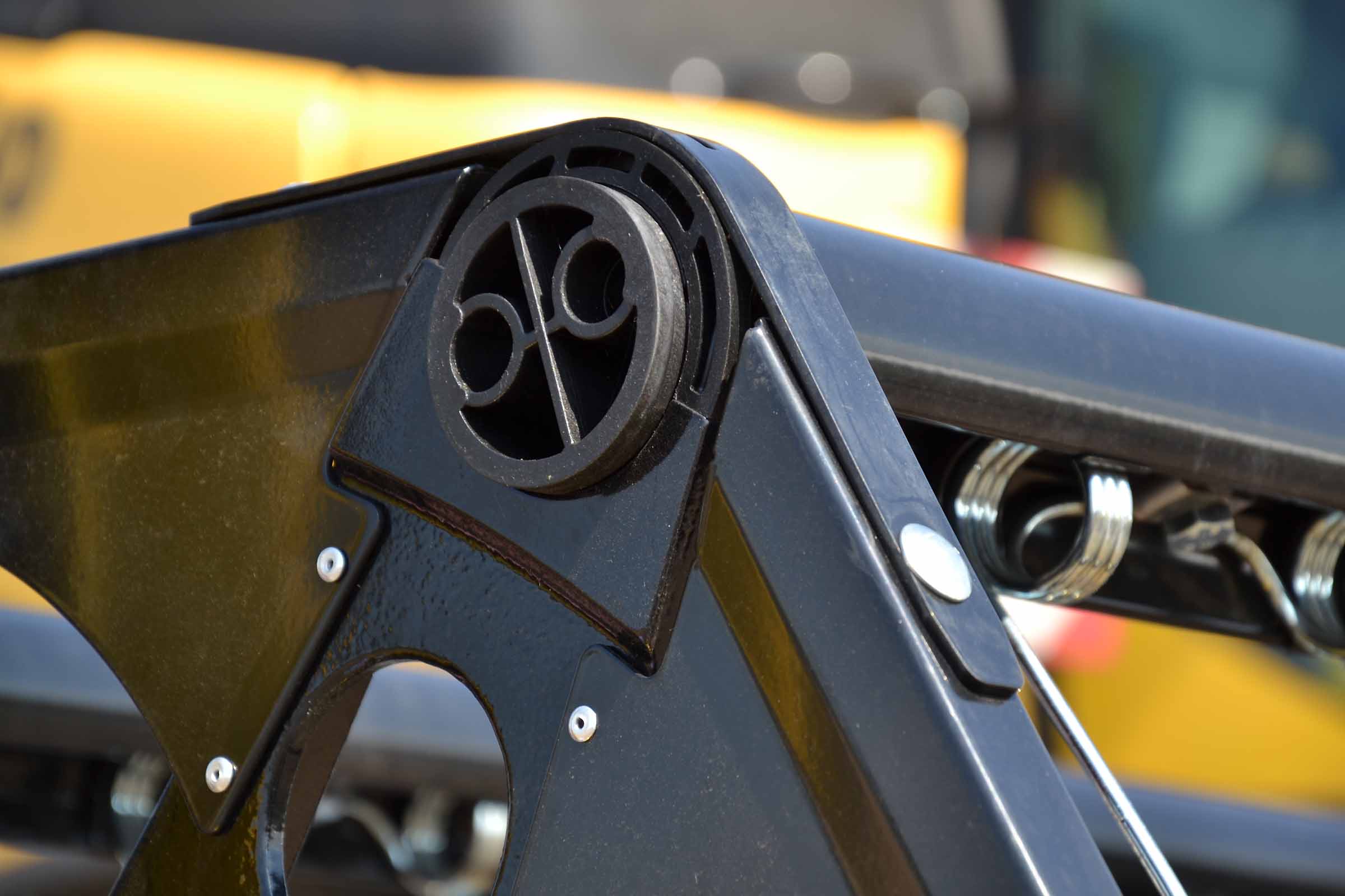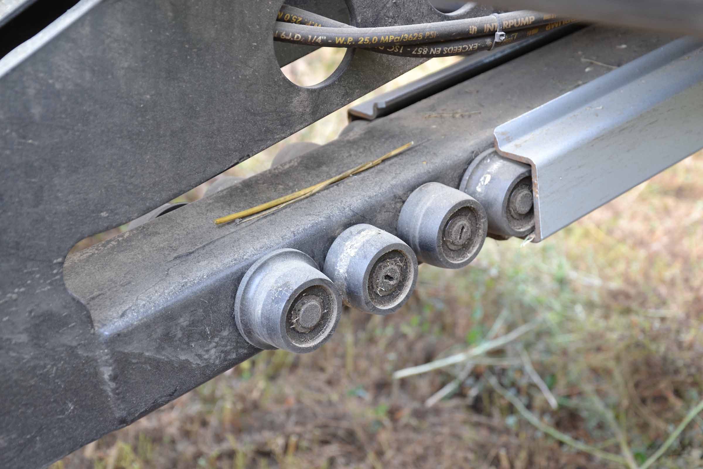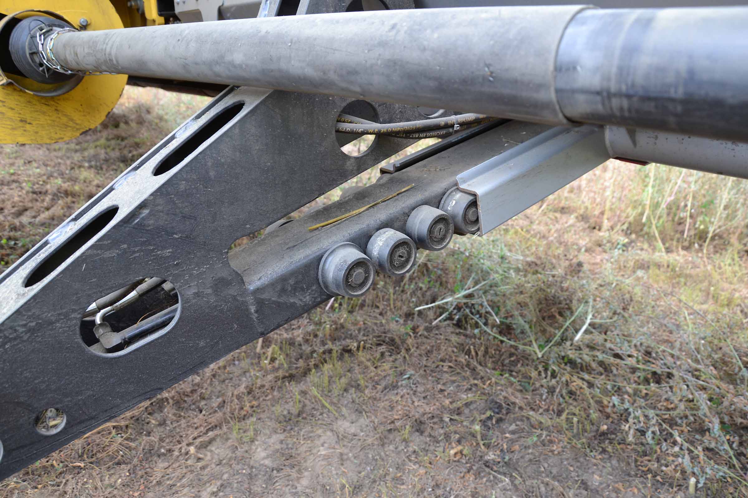 Le moteur hydraulique du rabatteur est positionné sur le côté droite à l'intérieur du tube central dans une position protégée. La photographie montre le détail du support mobile à l'intérieur duquel glissent les tuyaux hydrauliques.