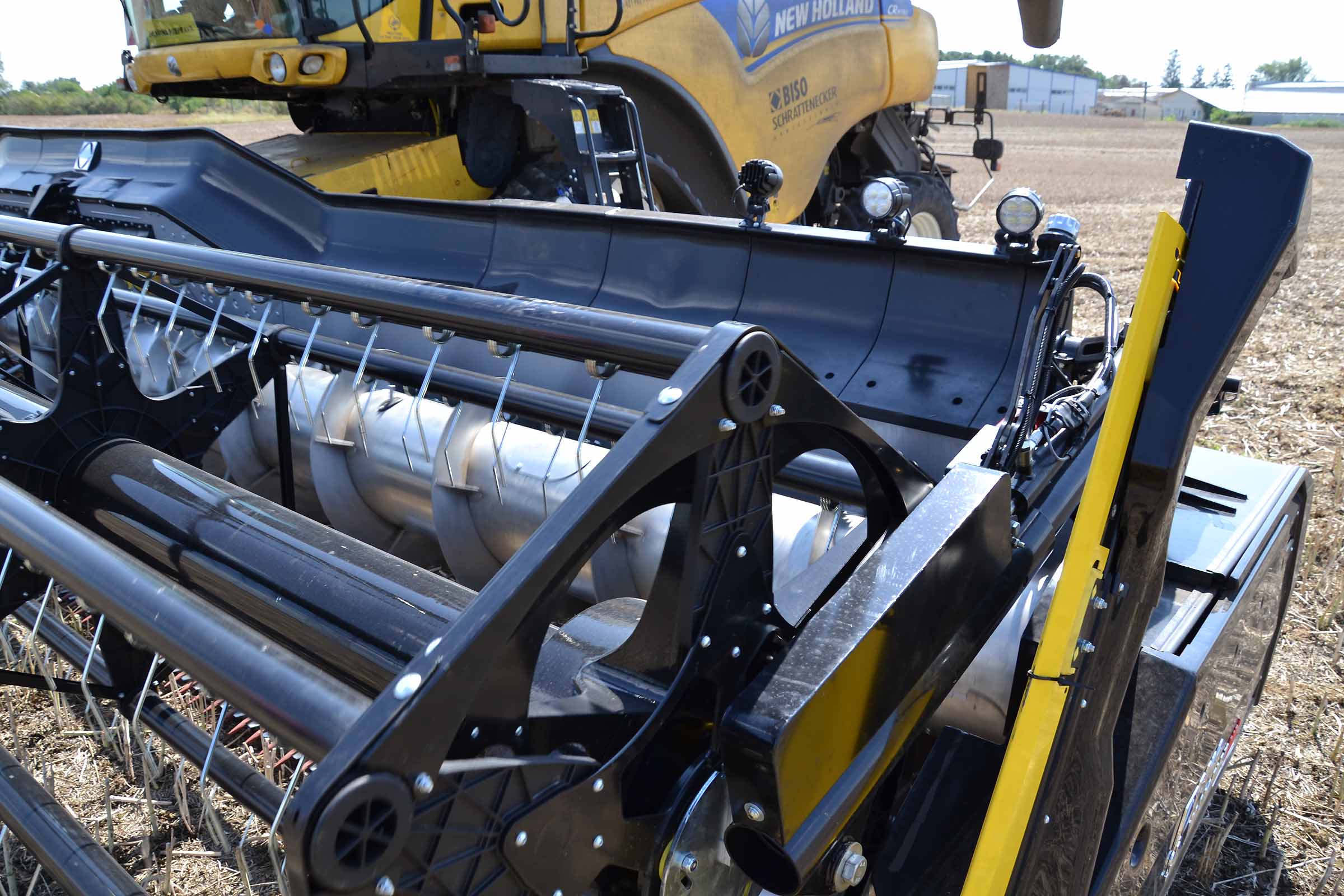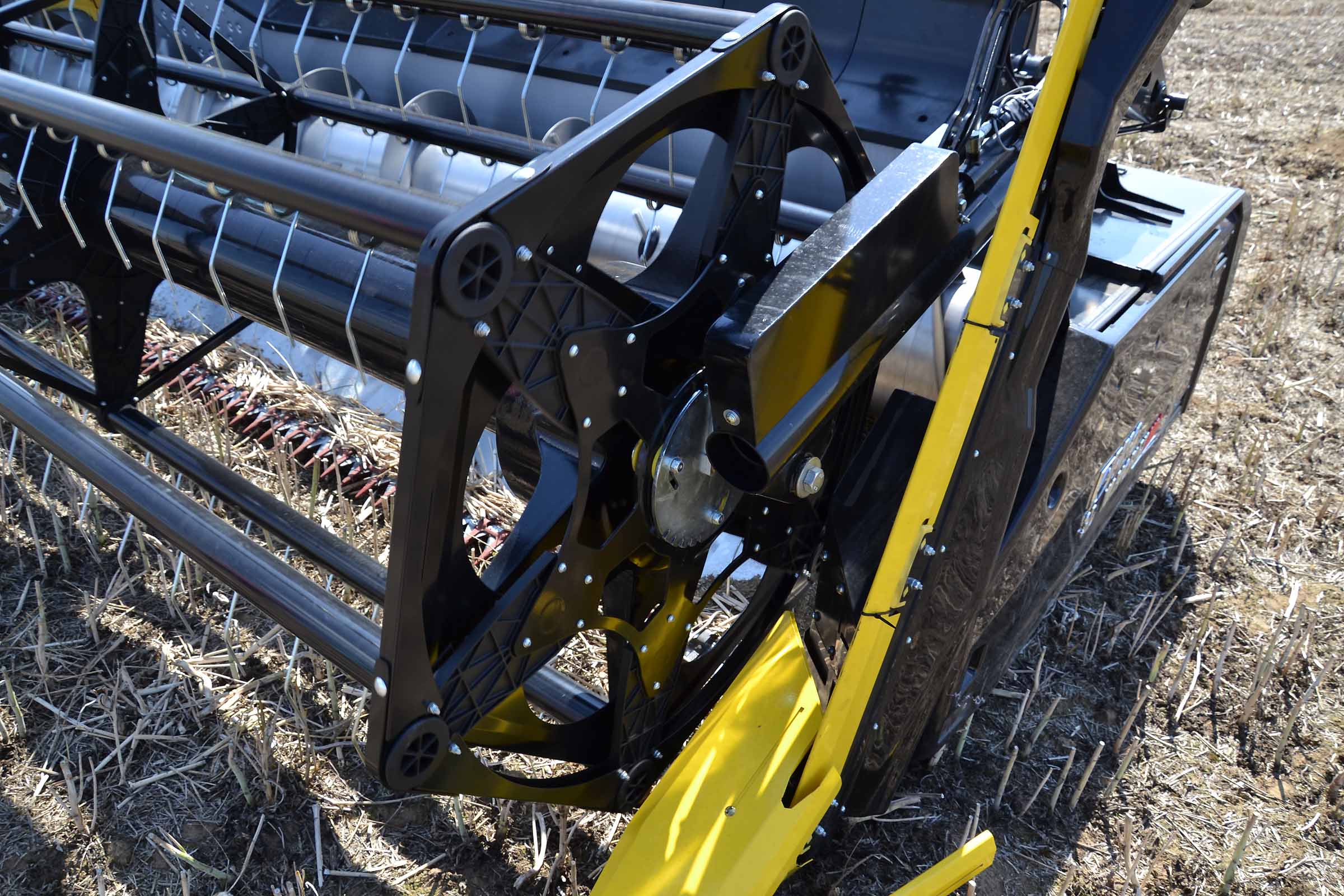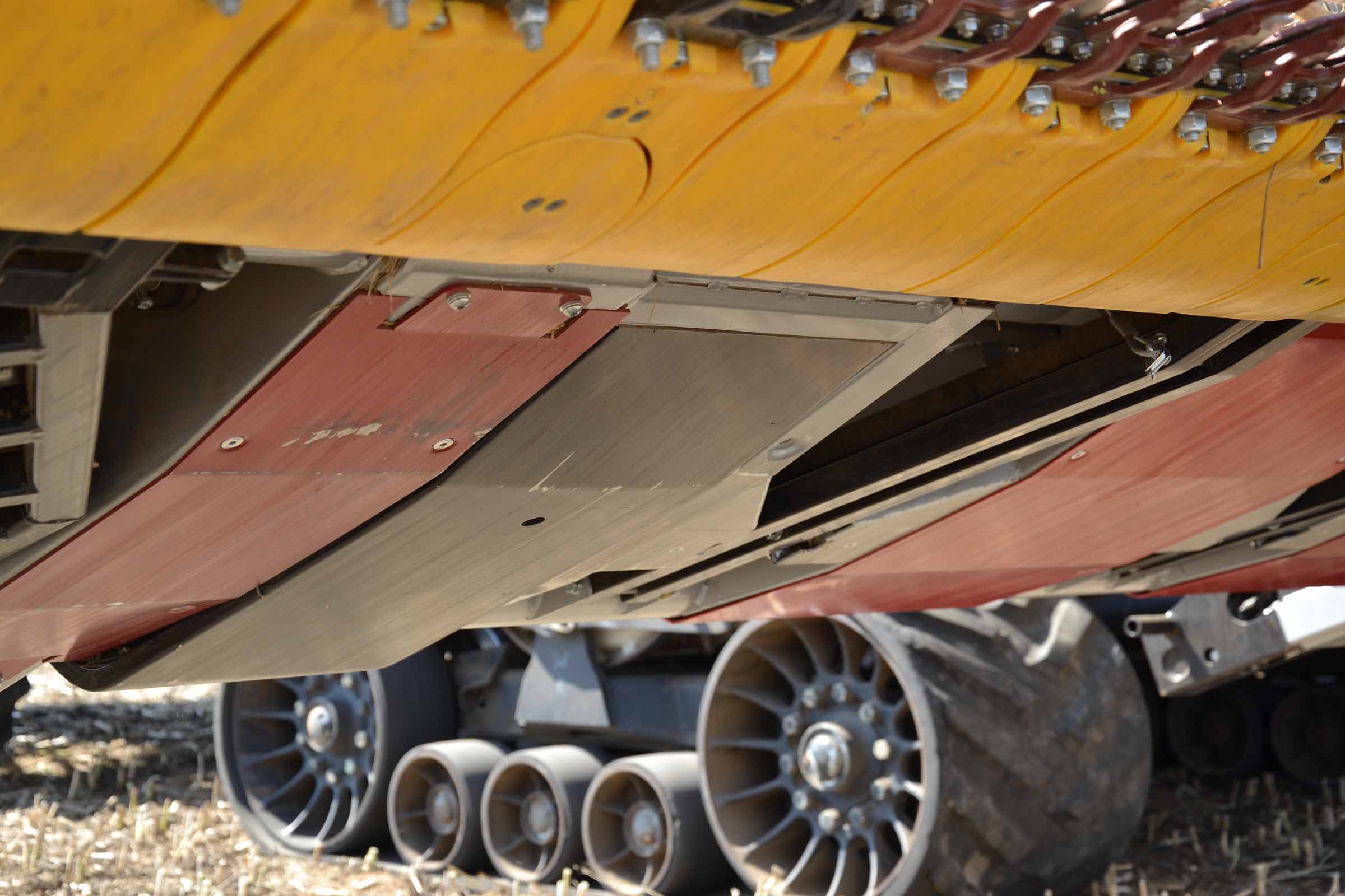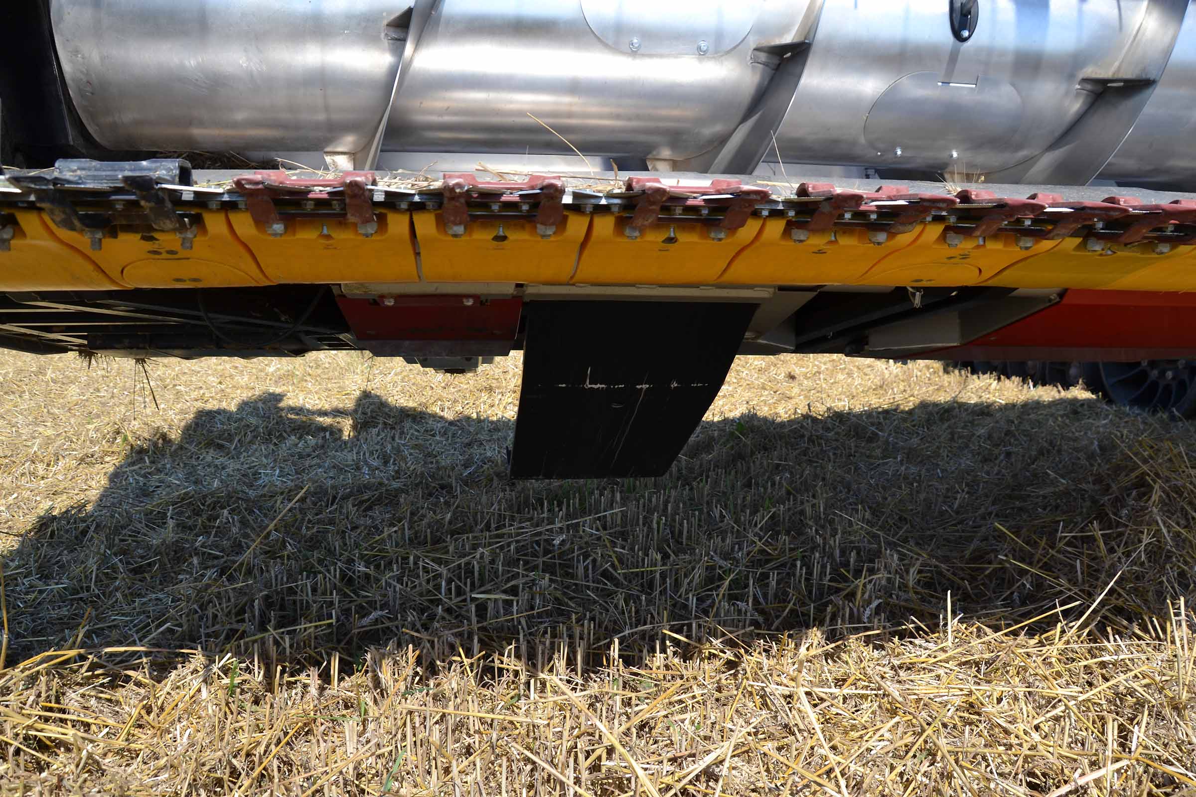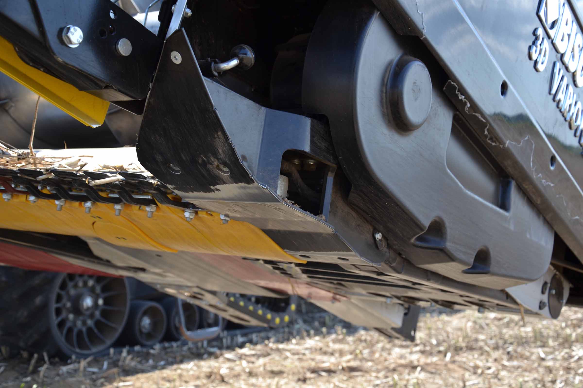 Sur cette photo, vous pouvez voir le patin intérieur gauche surélevé. Cela signifie que la barre de coupe est en mode flexible ou en mode STATIONNEMENT. Le patin jaune gauche placé immédiatement derrière la lame de coupe intègre le capteur de pression, élément clé du système flexible BISO.