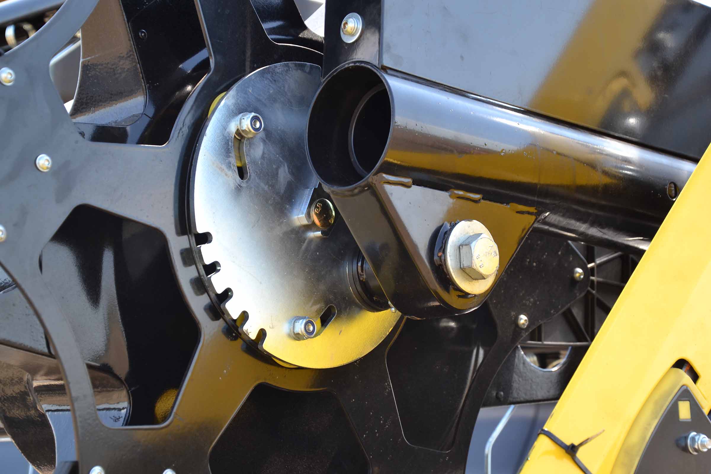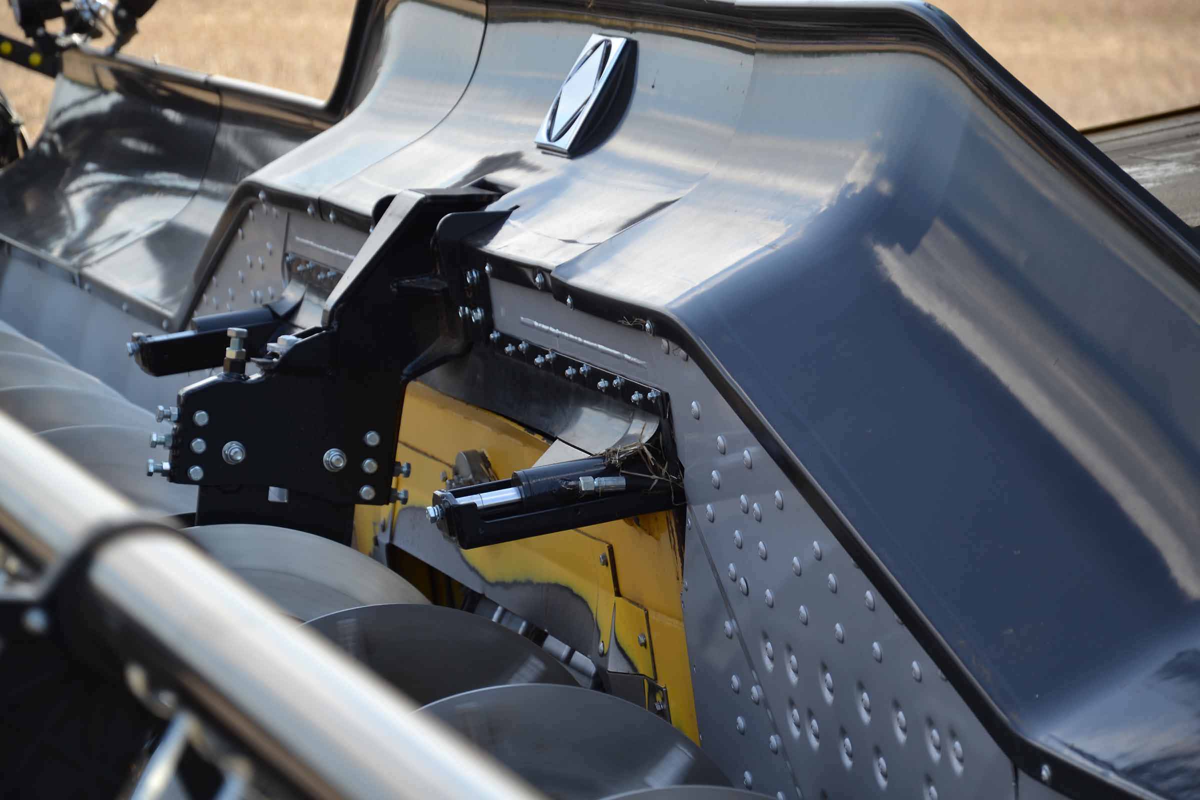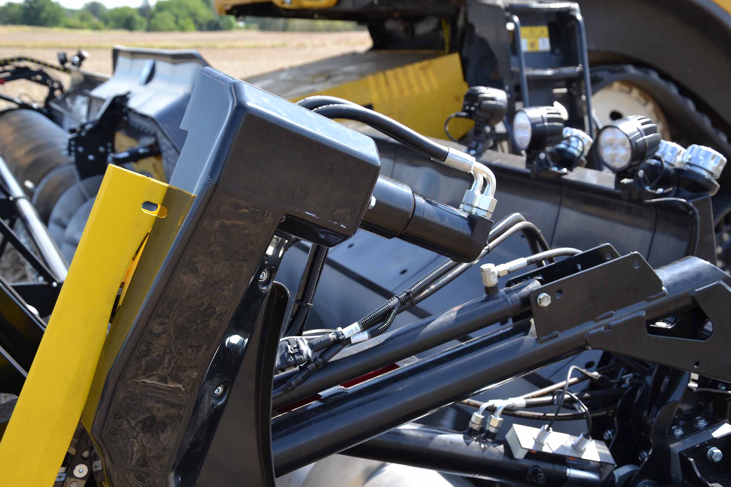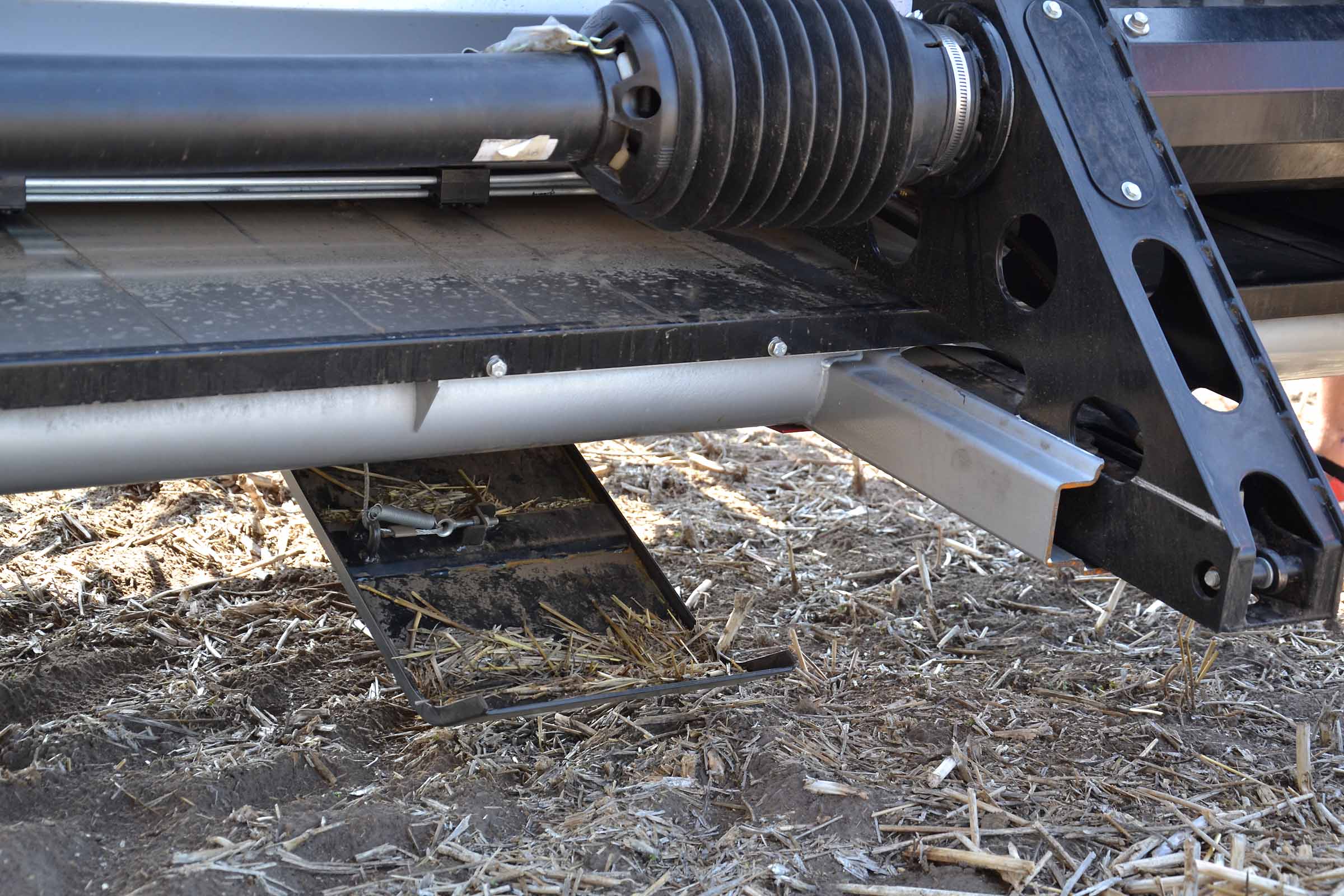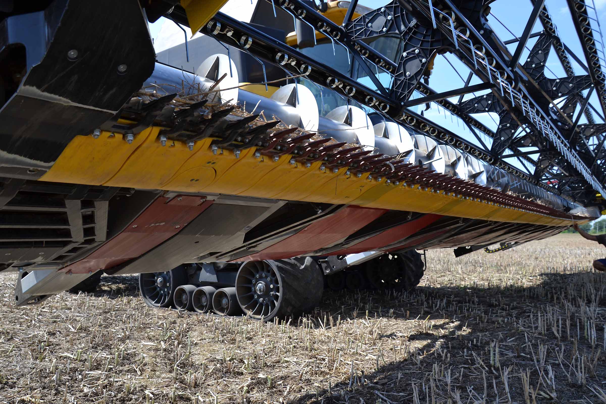 Sur cette photo, vous pouvez voir le patin intérieur gauche surélevé. Cela signifie que la barre de coupe est en mode flexible ou en mode STATIONNEMENT. Le patin jaune gauche placé immédiatement derrière la lame de coupe intègre le capteur de pression, élément clé du système flexible BISO.