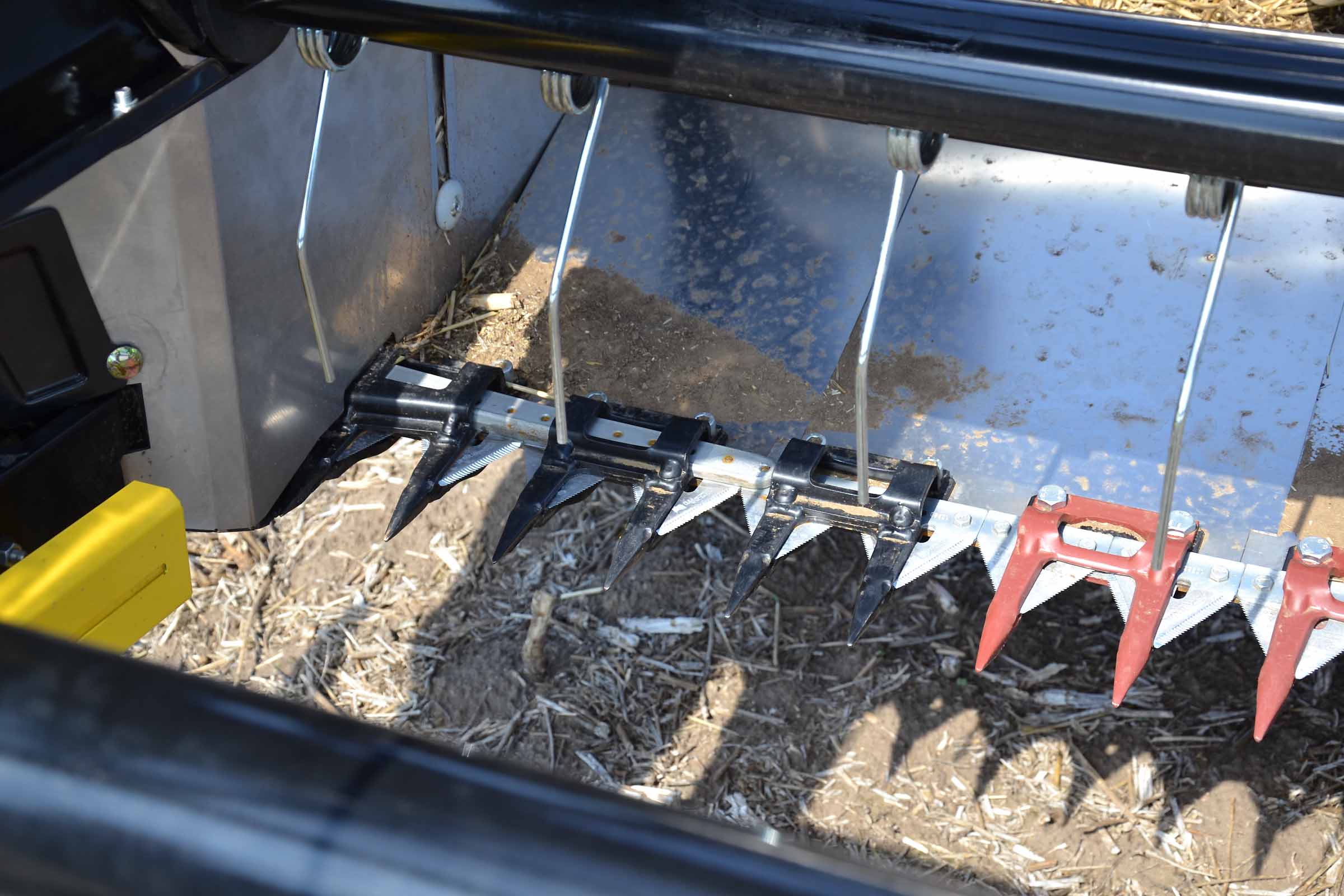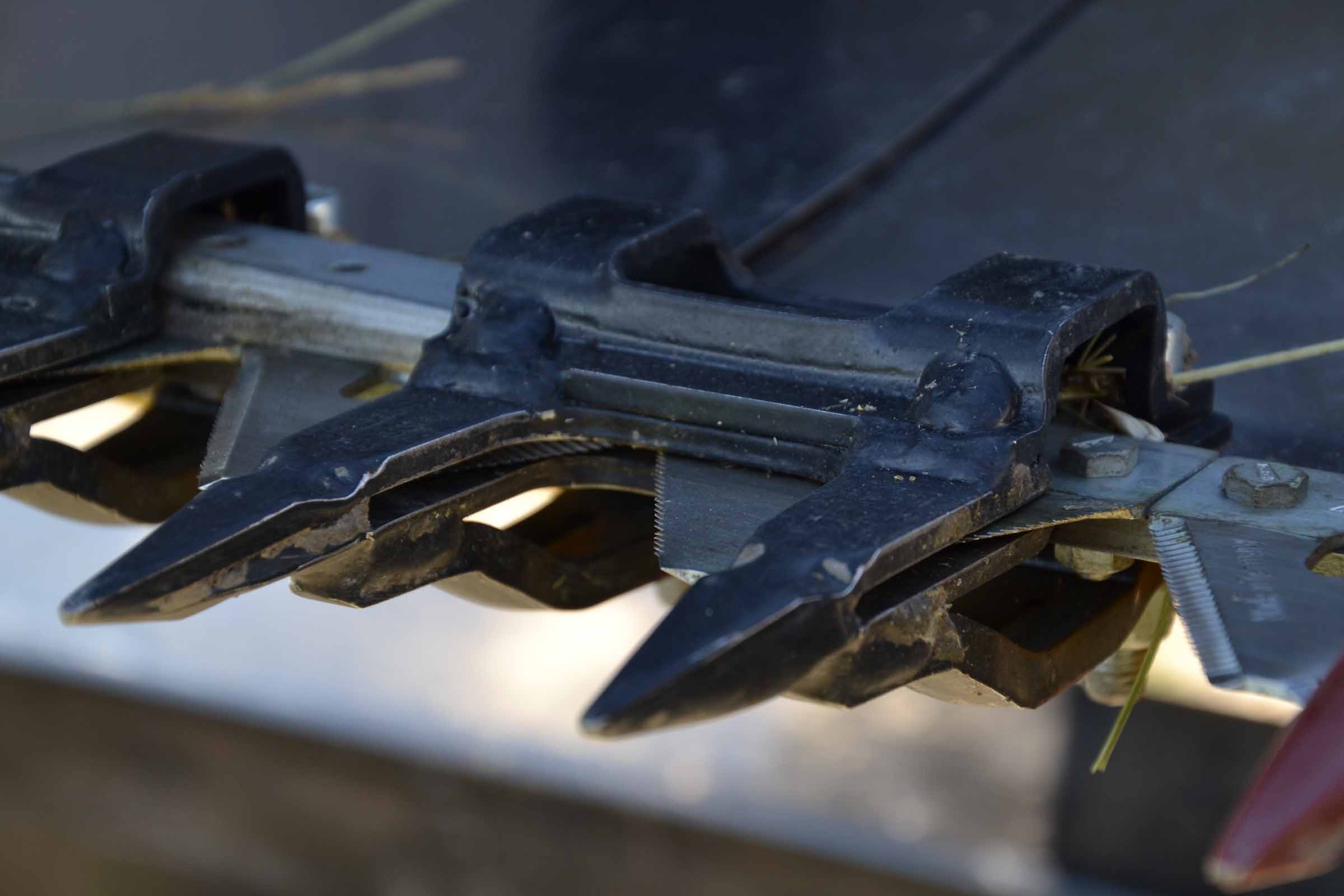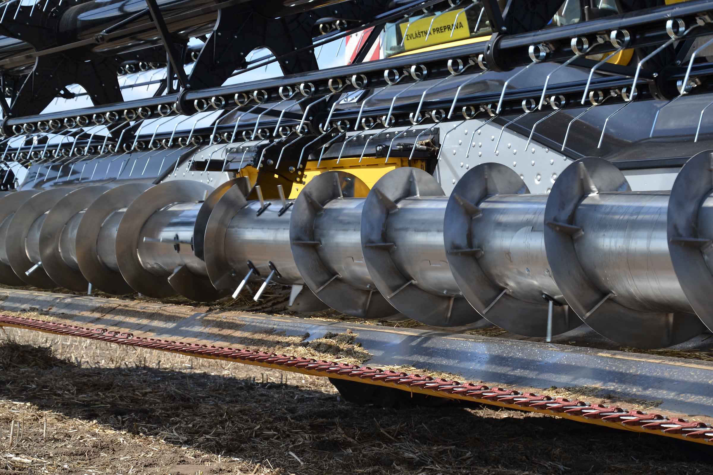 L'élément typique des barres de coupe BISO sont les lames à colza verticales intégrées. Cette solution permet à l'opérateur de maintenir les lames verticales inclinées et de les utiliser avec les diviseurs. Sur la photo, les lames de coupe sont inclinées vers l'arrière et désactivées.