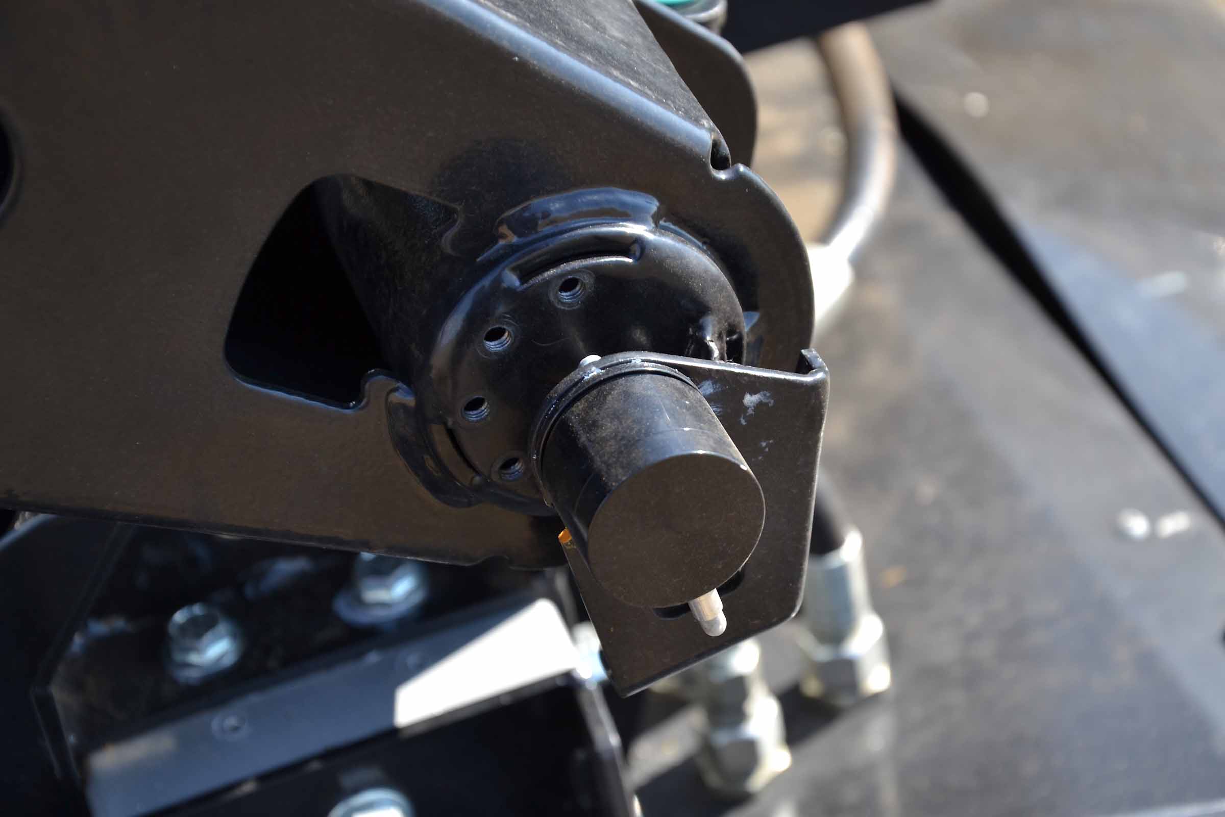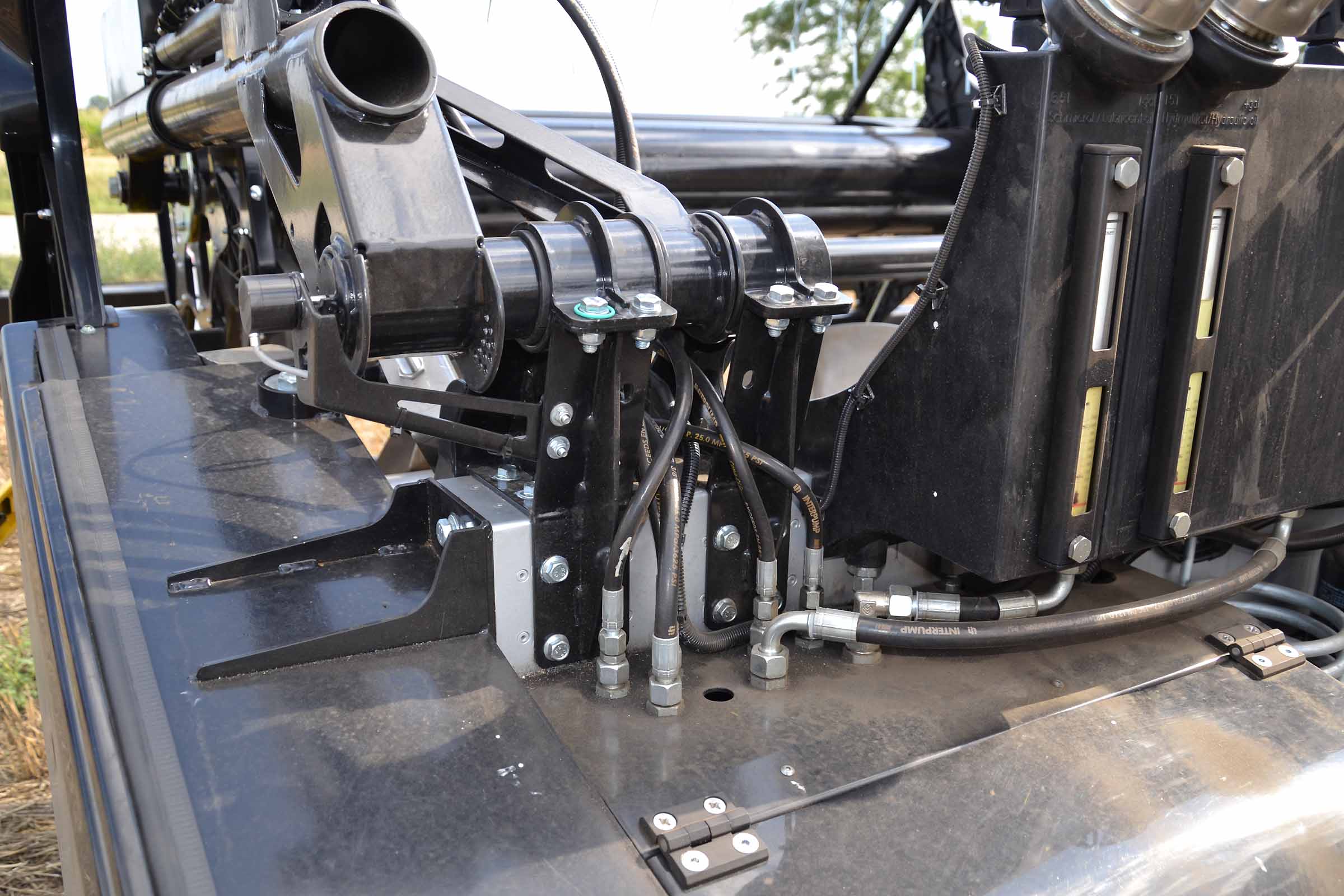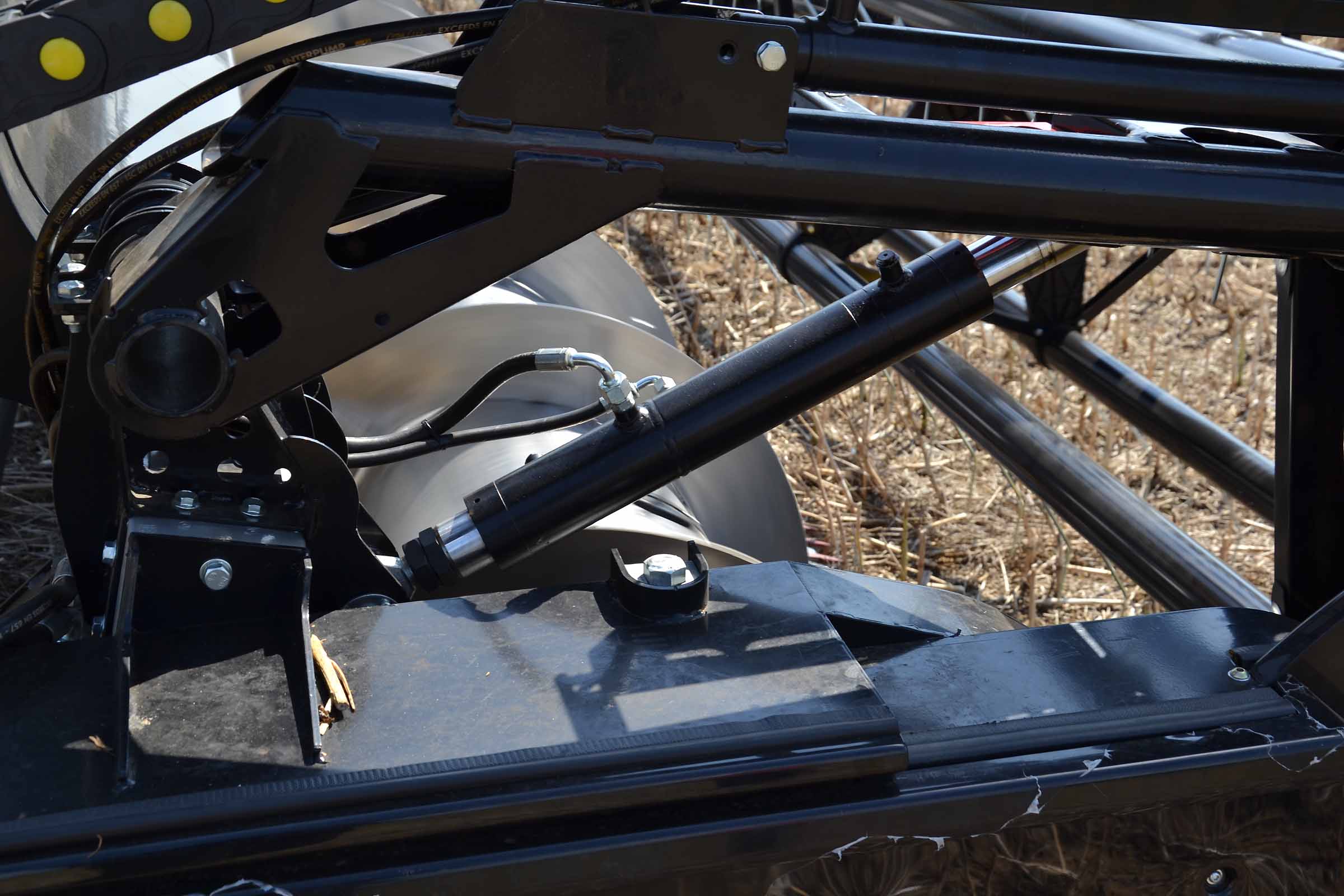 Le bras de support du rabatteur, le capteur de position (haut / bas) et les tuyaux hydrauliques qui alimentent les vérins de soulèvement du rabatteur.