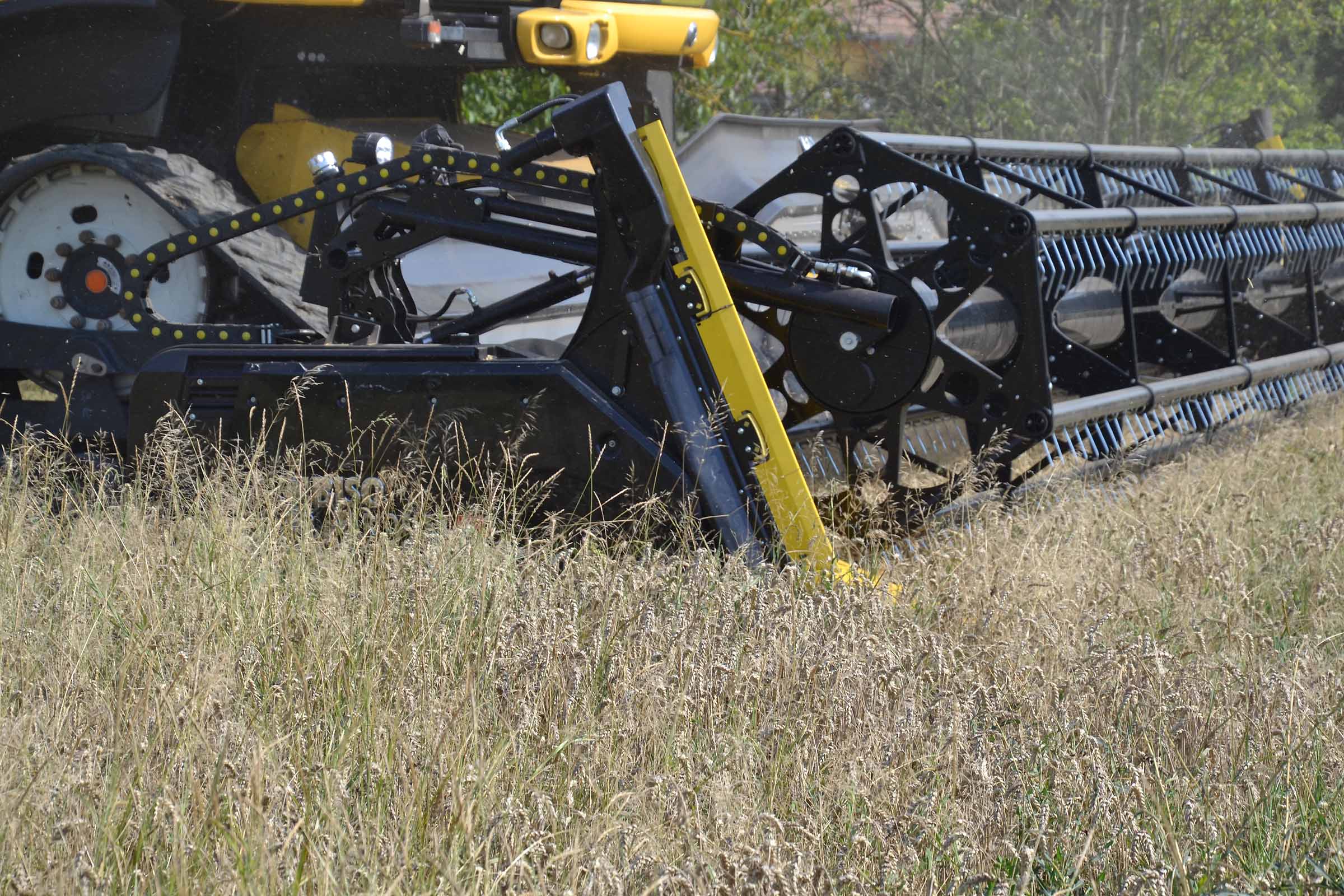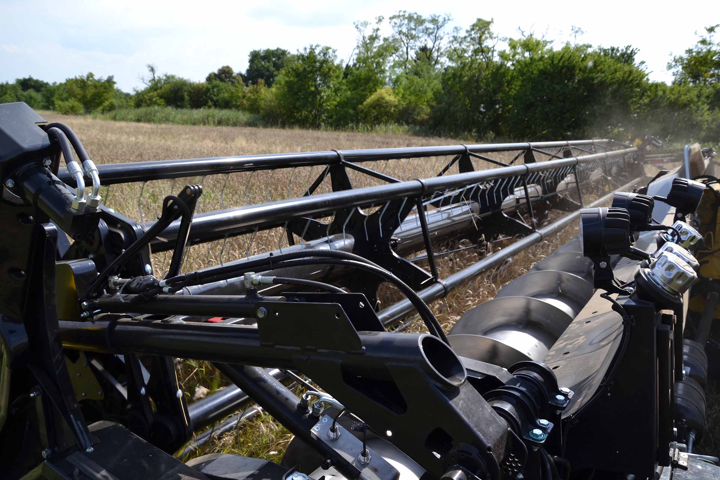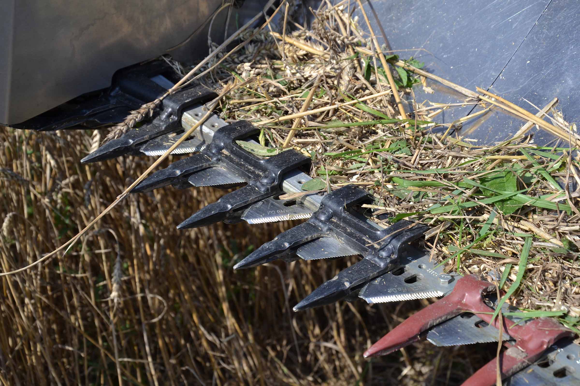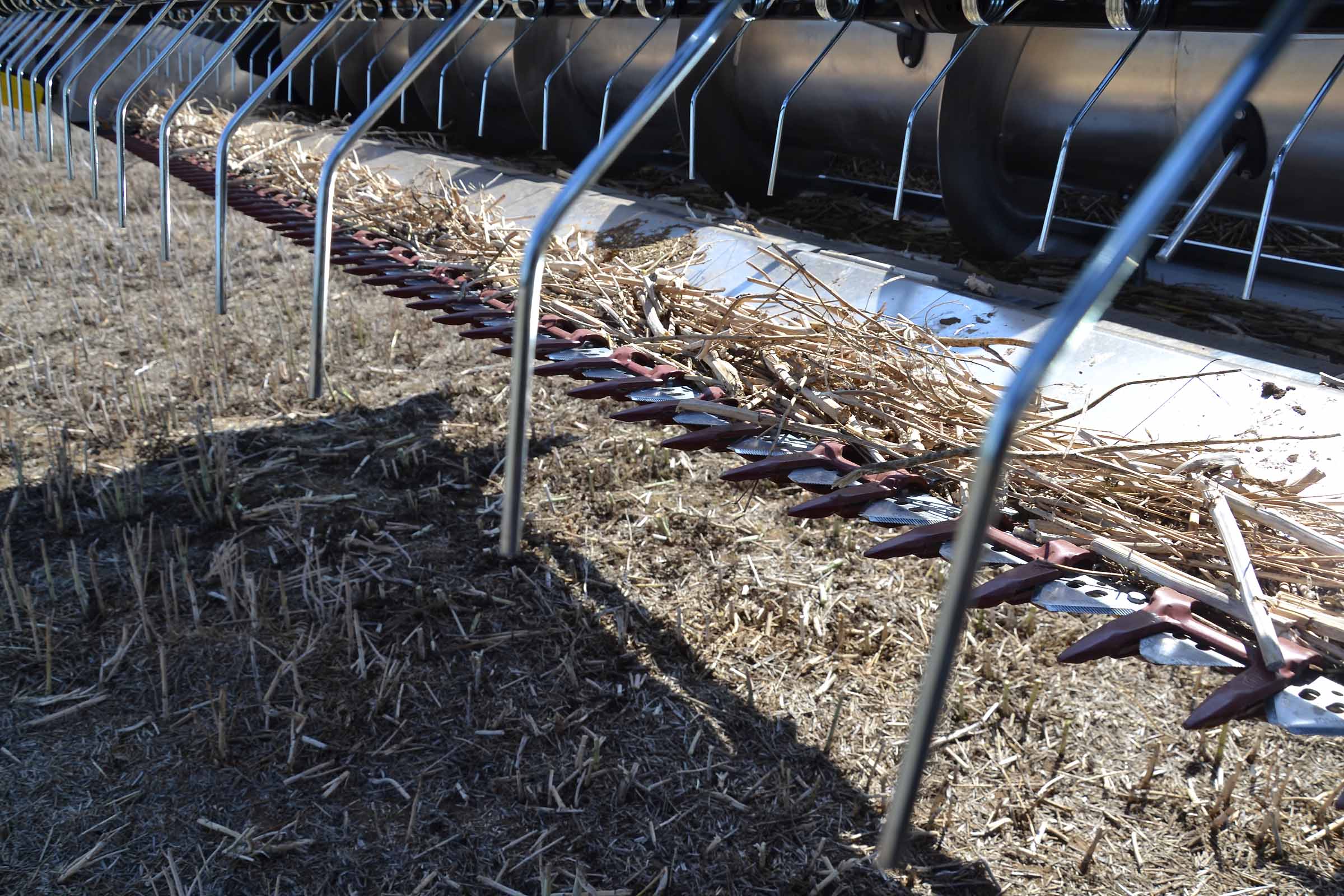 Les diviseurs sont entièrement réglables. Le blé sur la photo est aussi bas que l'orge mais dans le cas où les épis sont plus hauts ou lors de la récolte du seigle et en présence de mauvaises herbes, les scies verticales latérales peuvent être actionnées pour aider les diviseurs dans leur travail. Les scies verticales peuvent également être actionnées en position de stationnement en retirant simplement les protections.