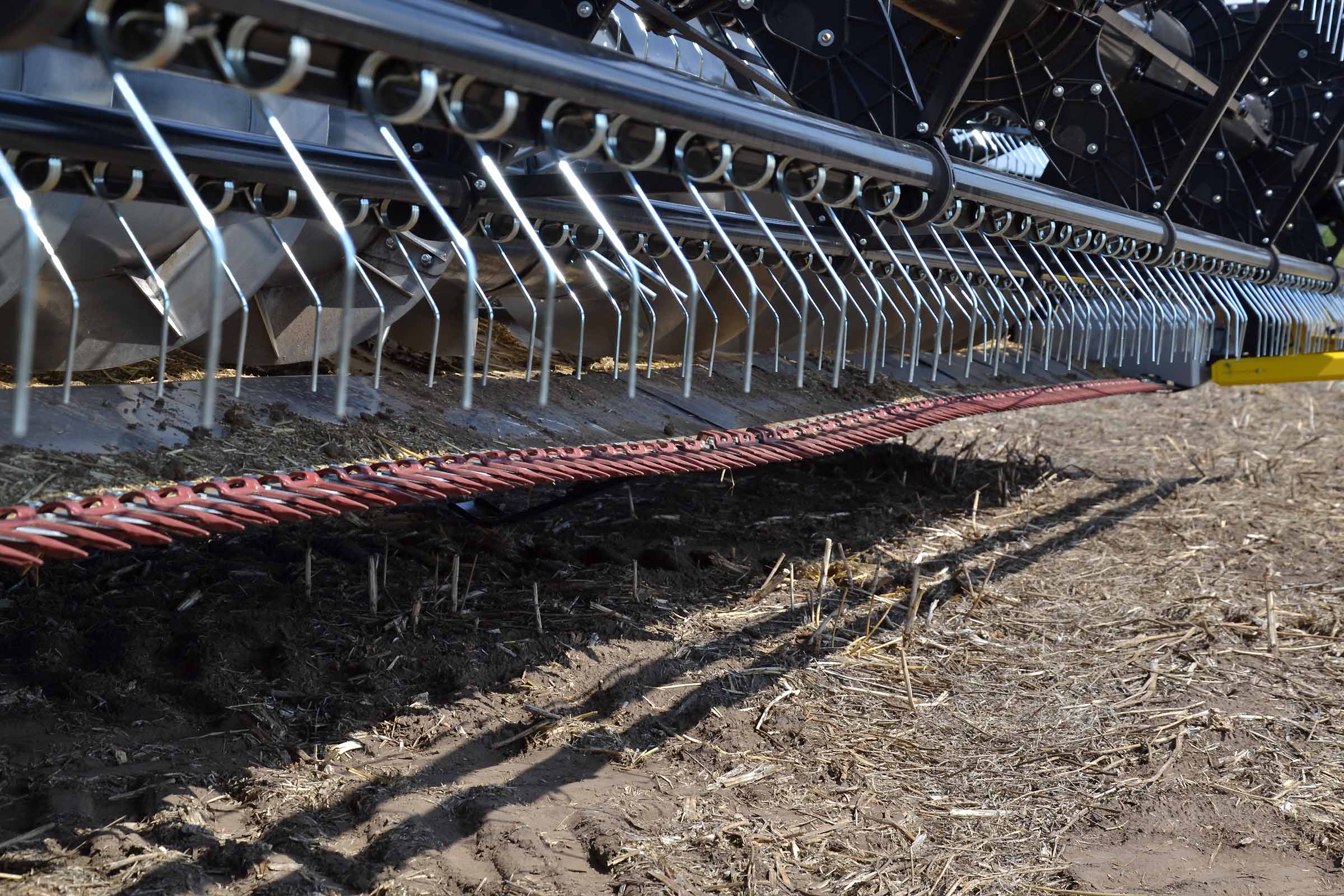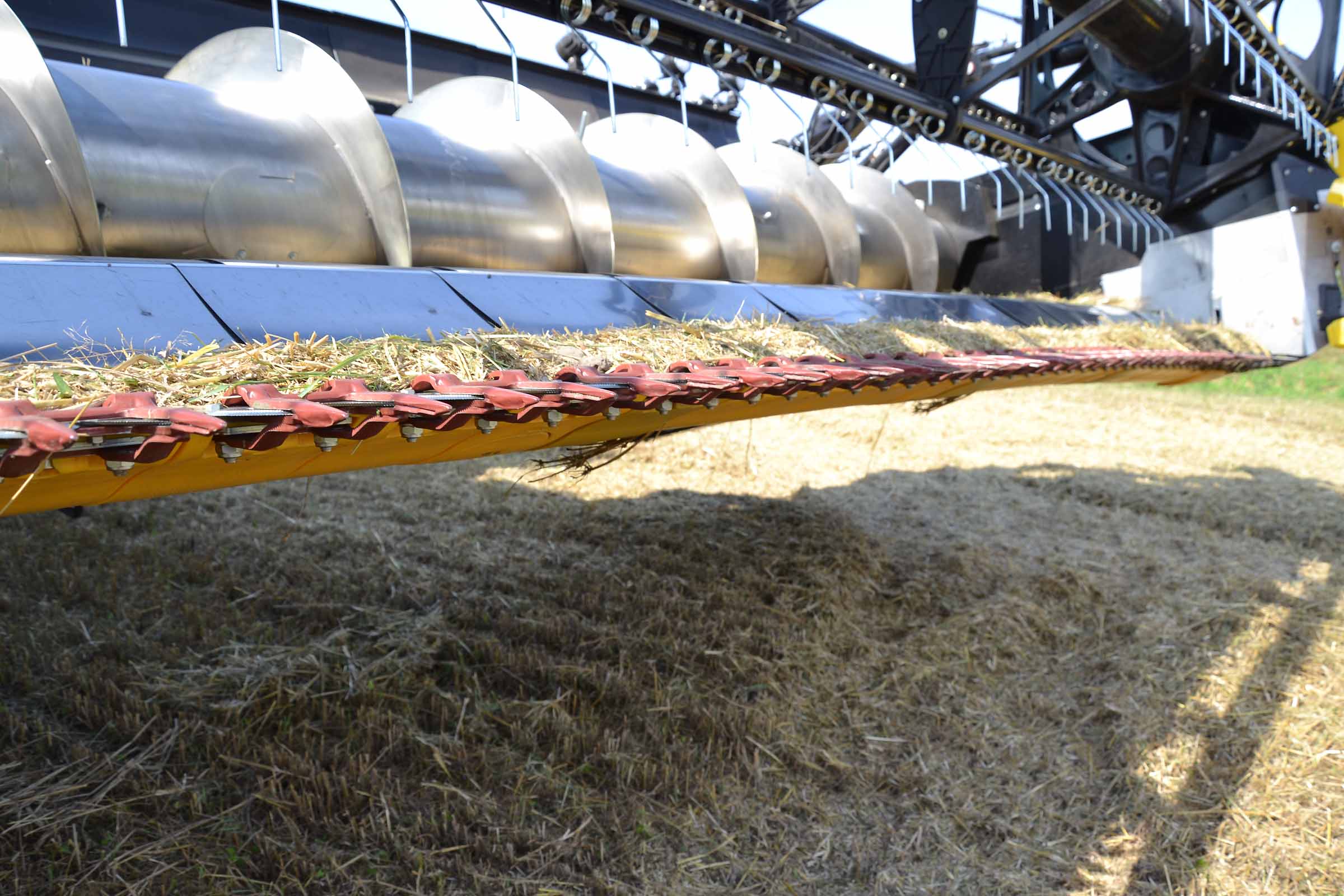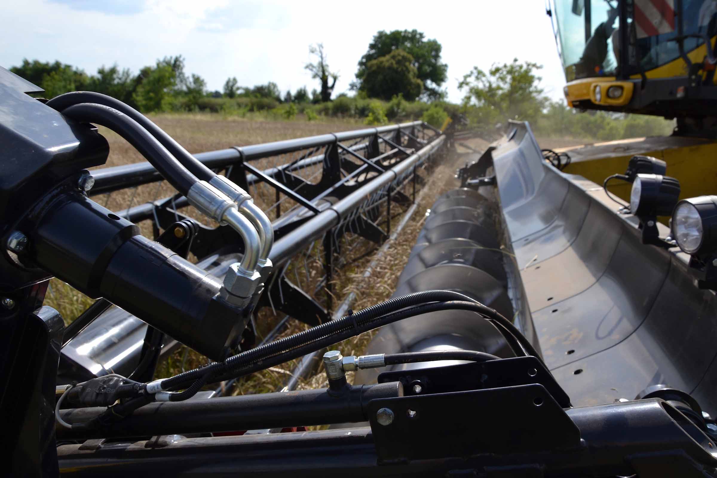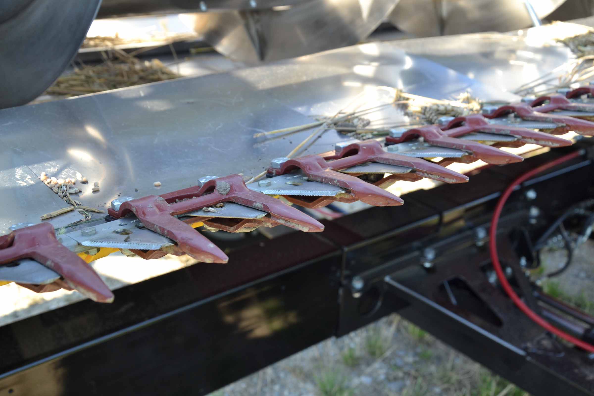 Les diviseurs sont entièrement réglables. Le blé sur la photo est aussi bas que l'orge mais dans le cas où les épis sont plus hauts ou lors de la récolte du seigle et en présence de mauvaises herbes, les scies verticales latérales peuvent être actionnées pour aider les diviseurs dans leur travail. Les scies verticales peuvent également être actionnées en position de stationnement en retirant simplement les protections.