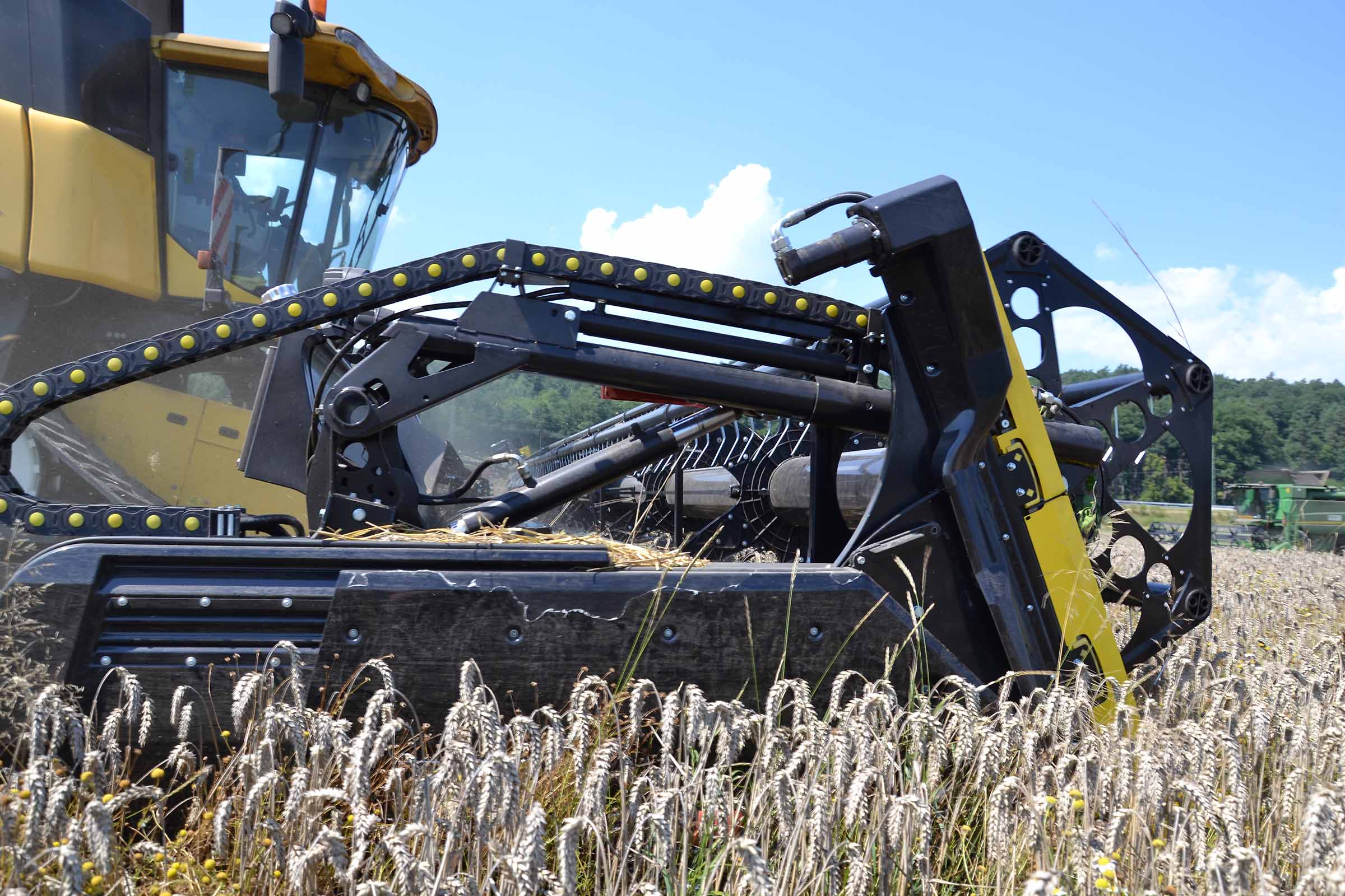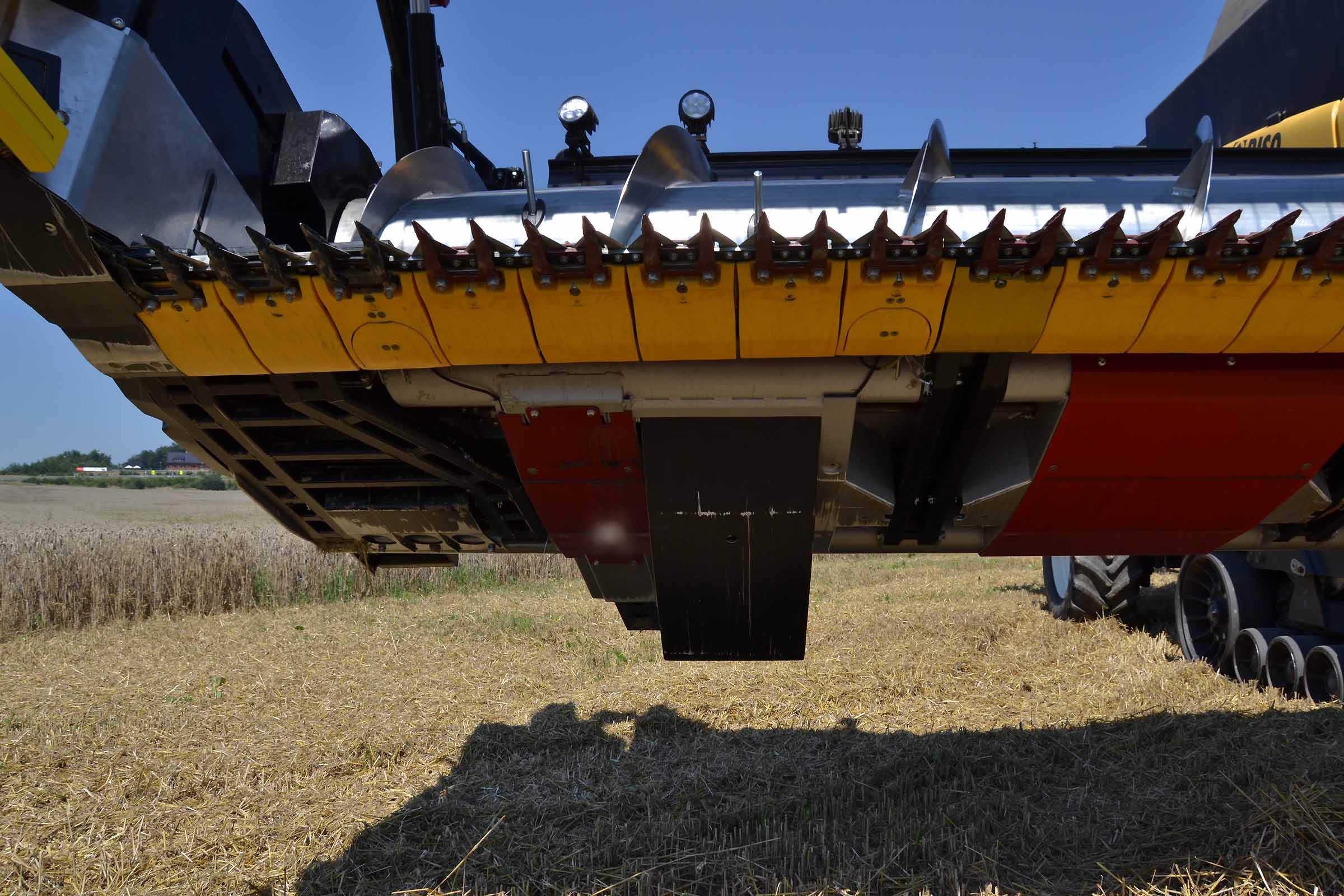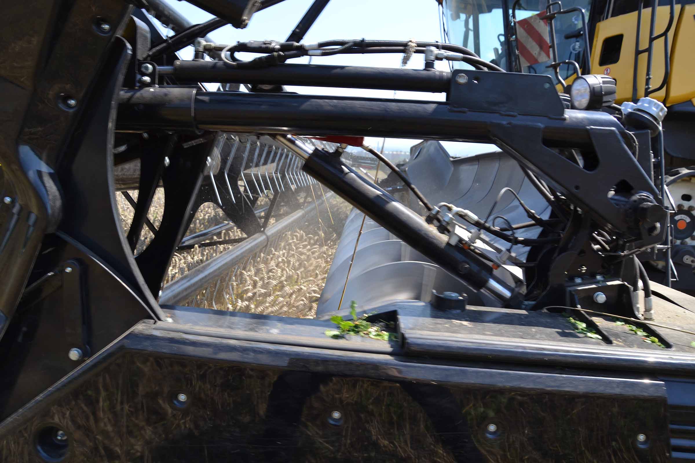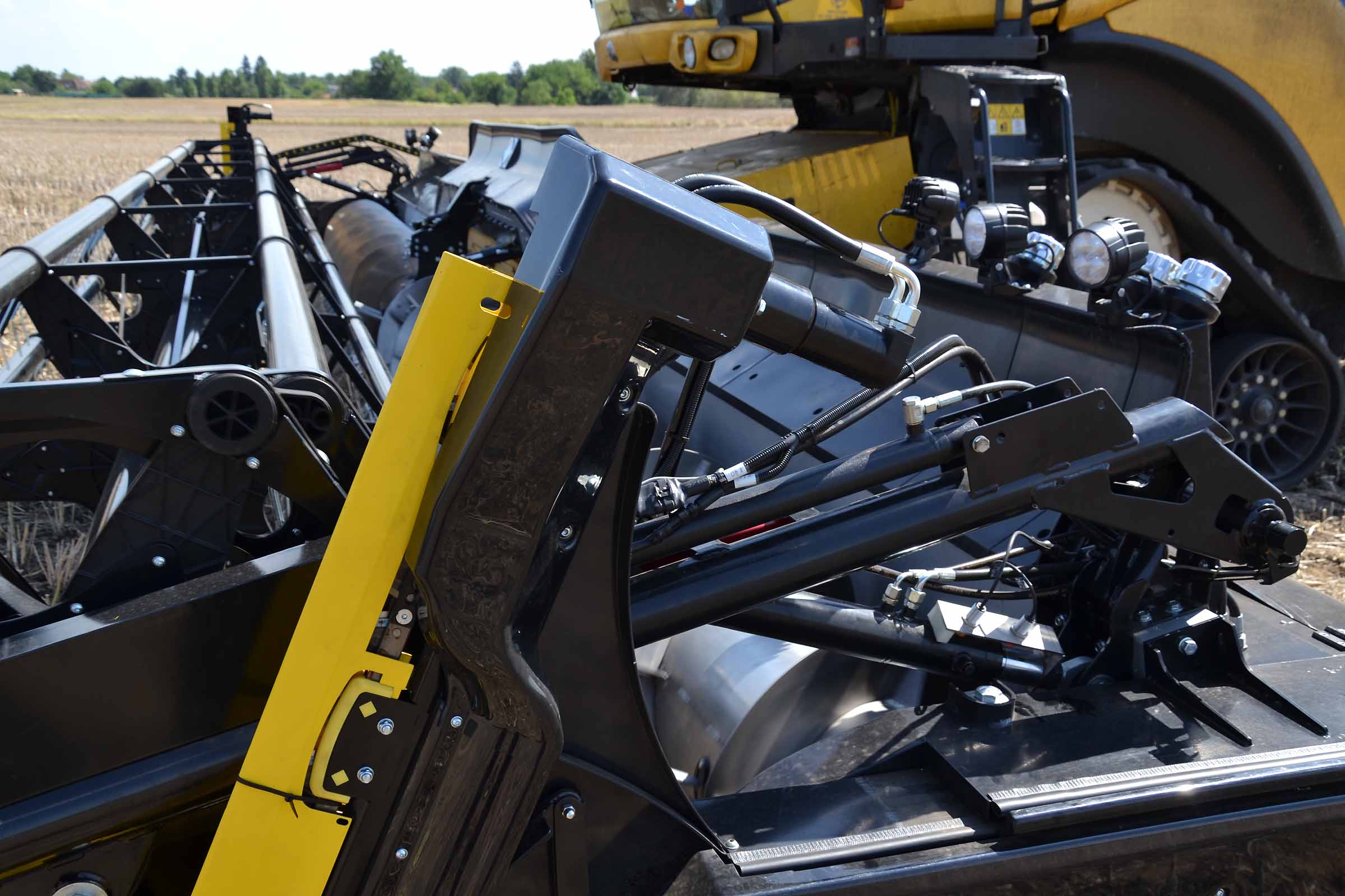 L'image montre la barre de coupe entièrement avancée. Cette position est utilisée non seulement pour la récolte du colza mais également en présence de pierres dans le champ pour éviter tout dommage causé par leur introduction involontaire dans le convoyeur de la moissonneuse-batteuse. Les coffres latéraux en matière plastique indiquent clairement à l'opérateur la position de la lame de coupe. La même chose est indiquée avec précision sur le moniteur dans la cabine.
