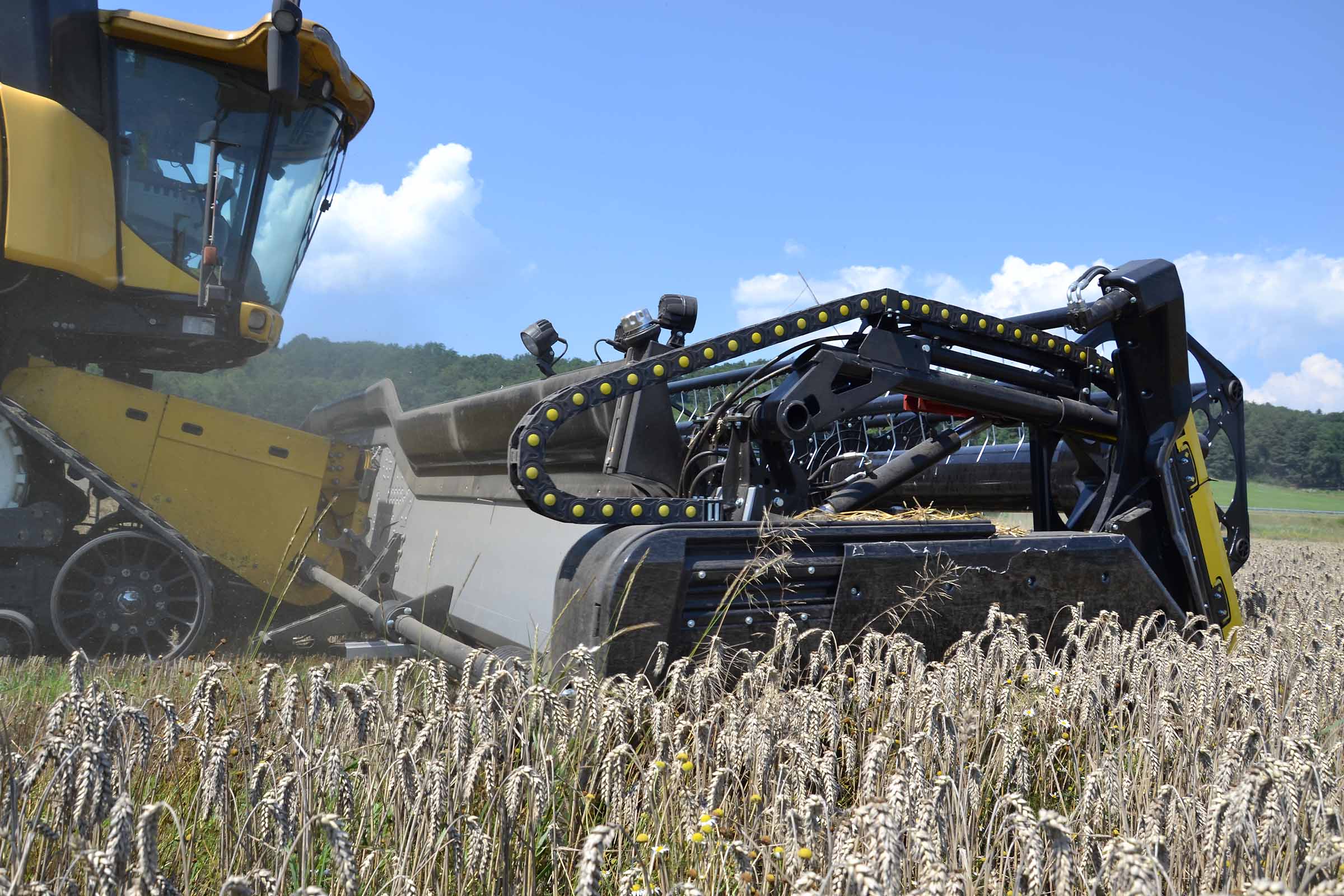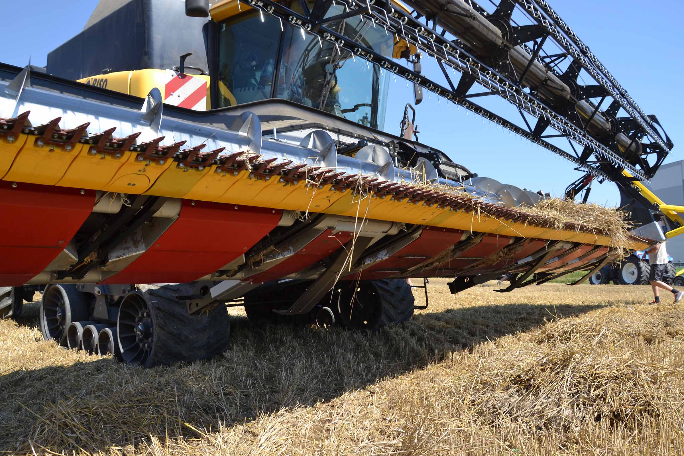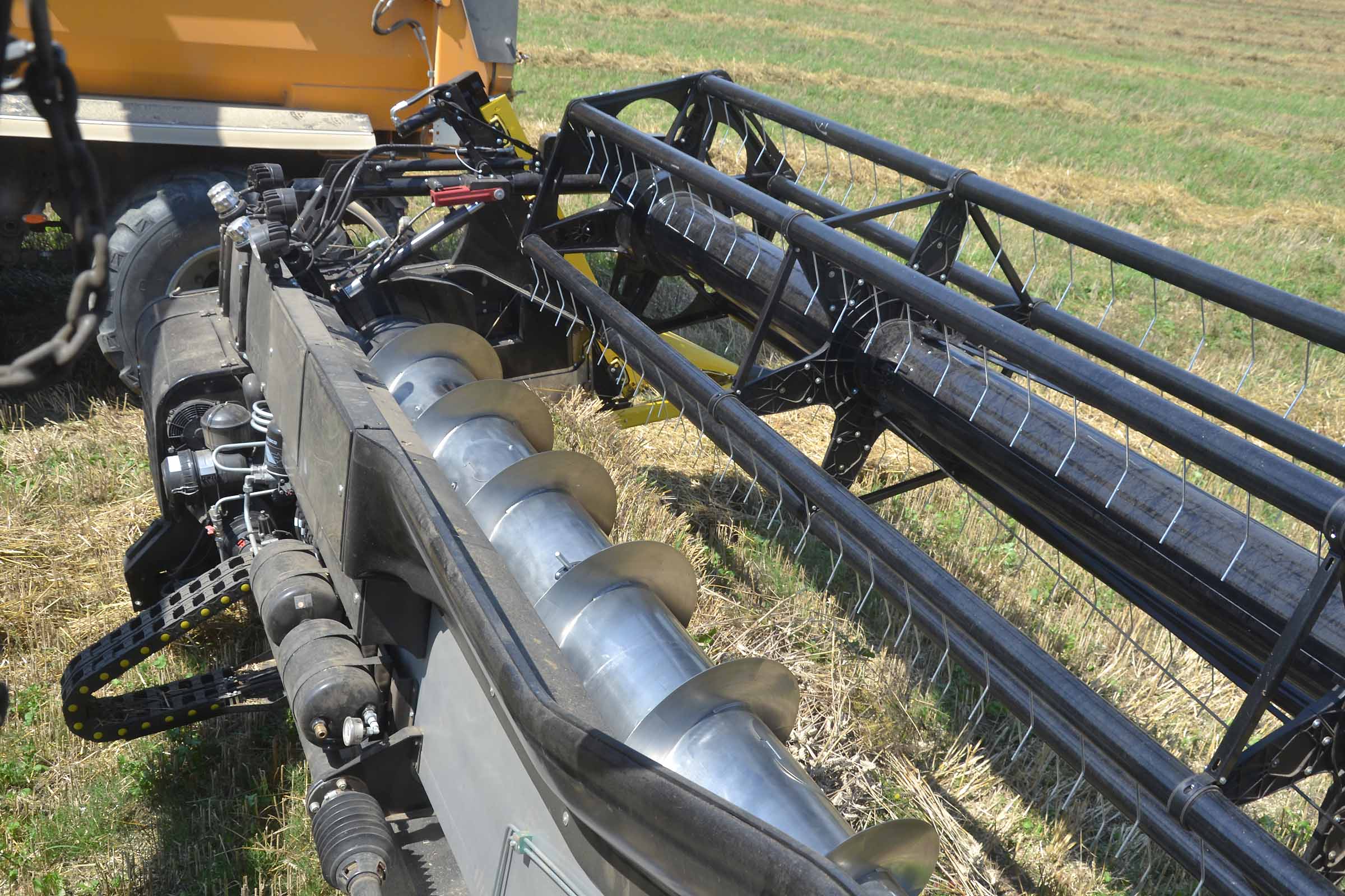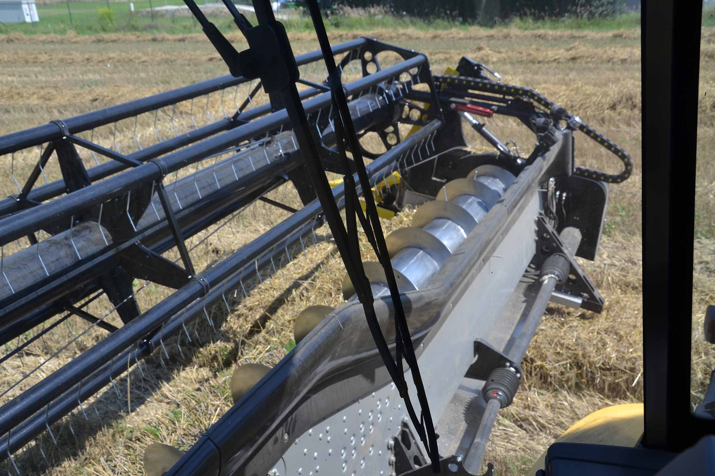 L'image montre la barre de coupe entièrement avancée. Cette position est utilisée non seulement pour la récolte du colza mais également en présence de pierres dans le champ pour éviter tout dommage causé par leur introduction involontaire dans le convoyeur de la moissonneuse-batteuse. Les coffres latéraux en matière plastique indiquent clairement à l'opérateur la position de la lame de coupe. La même chose est indiquée avec précision sur le moniteur dans la cabine.