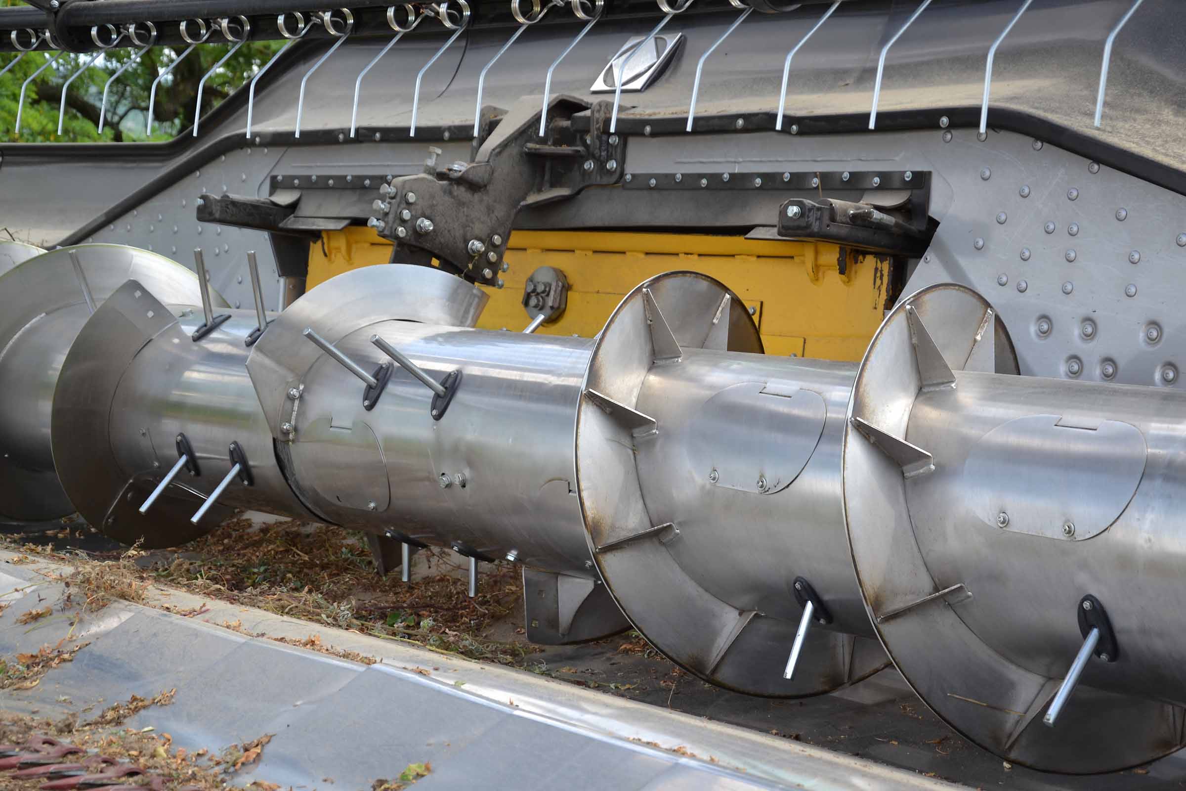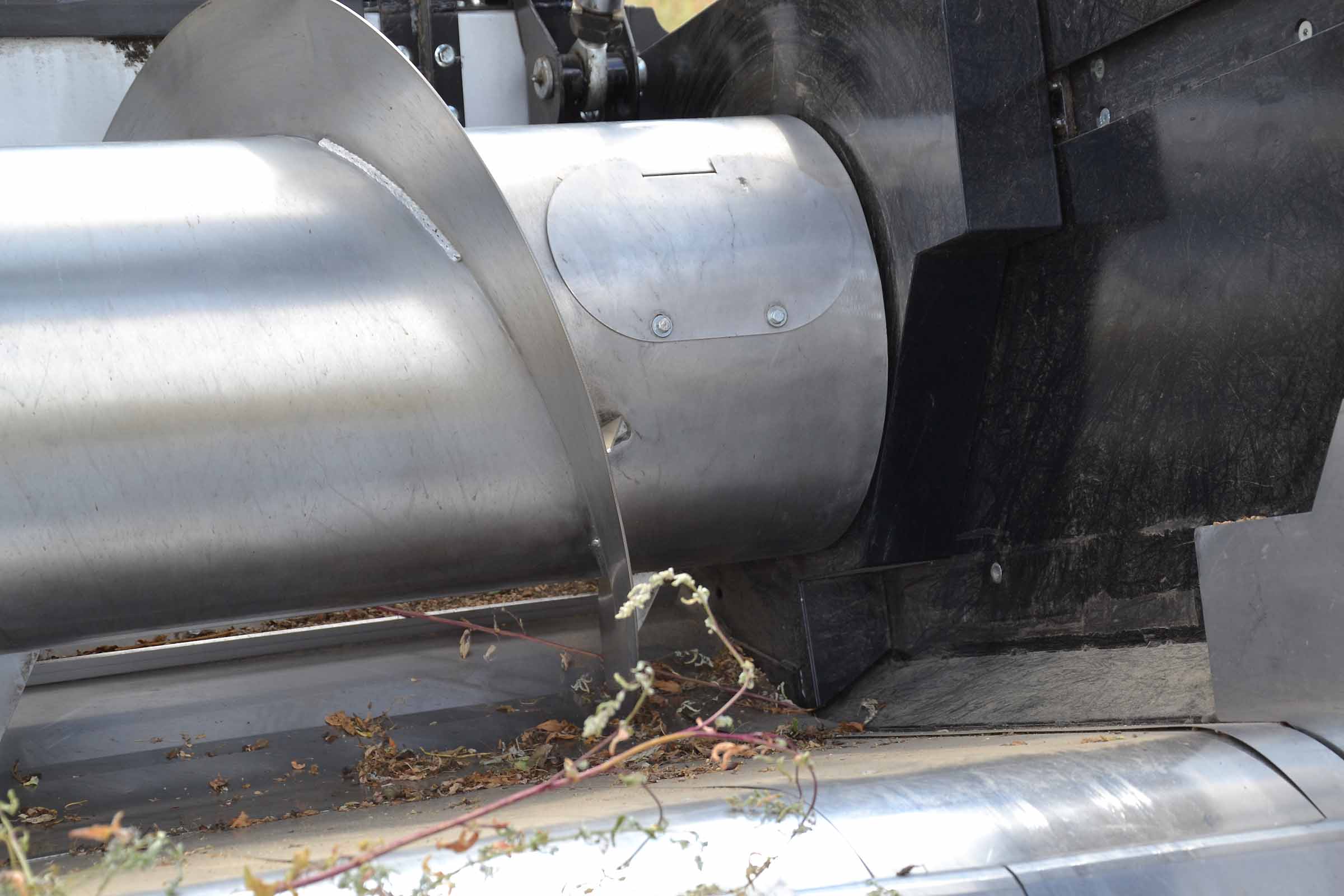 La vis d'alimentation en acier inoxydable garantit une fluidité exceptionnelle du produit. La vis peut également être réglée en hauteur grâce à des registres spéciaux ainsi que la cinématique des dents. Sur la photo, la vis mesure 10,7 mètres de largeur et est divisée en deux sections, toutes deux entraînées par des transmissions dédiées avec embrayage de protection. La technologie de construction BISO permet de construire des vis toujours parfaitement équilibrées.