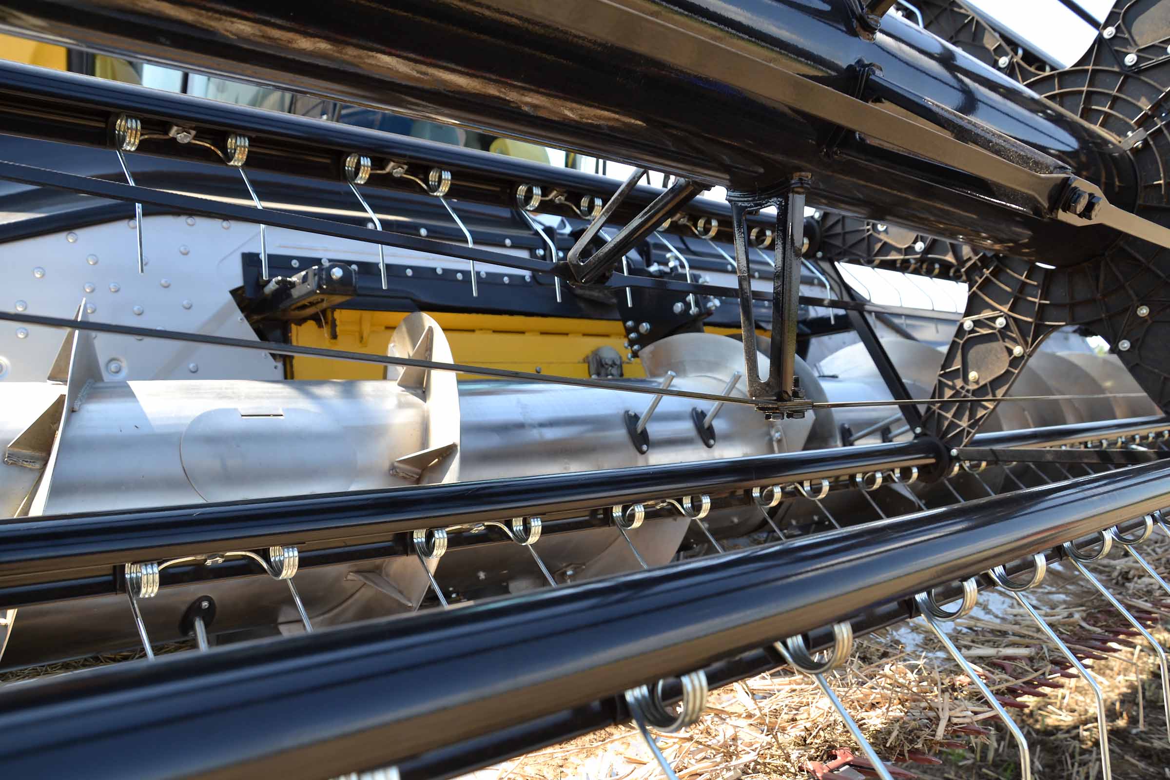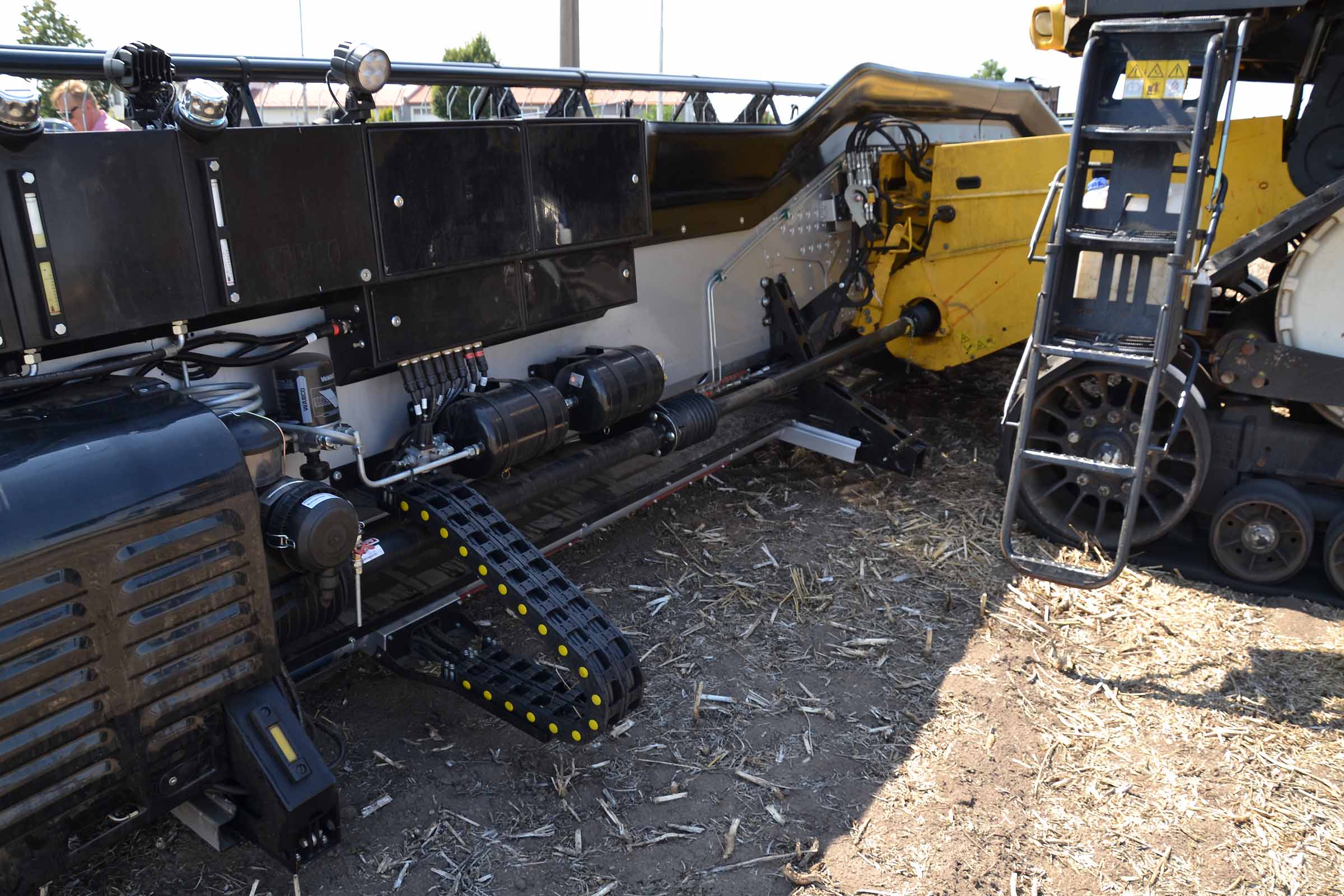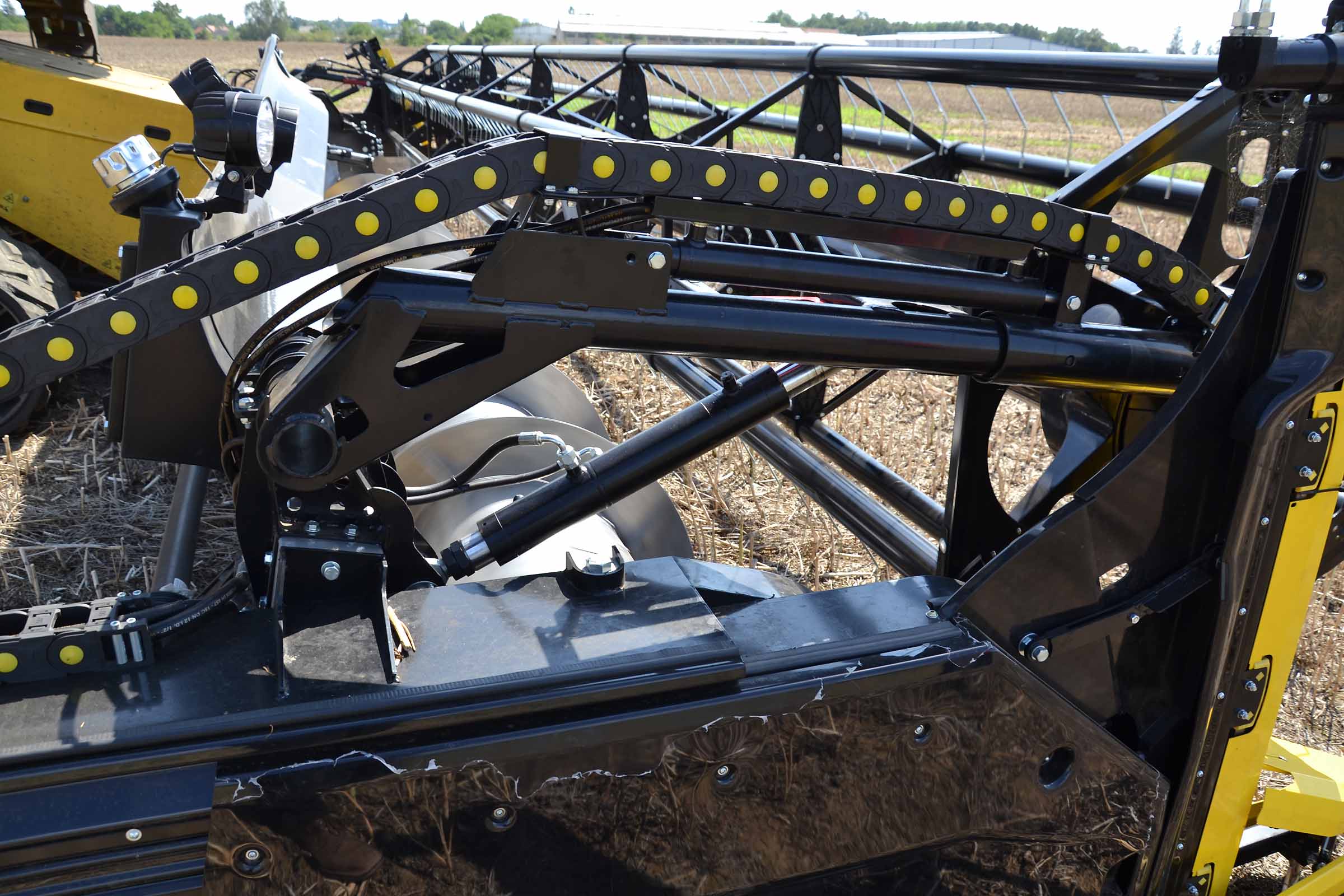 Le module flexible et les parallélogrammes sont parfaitement intégrés sur le fond vario. Sur la gauche vous pouvez voir le support robuste sur lequel la transmission de la barre de coupe sont fixés, également déplacé par le système pneumatique de la barre pour ajuster sa position au sol en fonction de la pression sélectionnée.