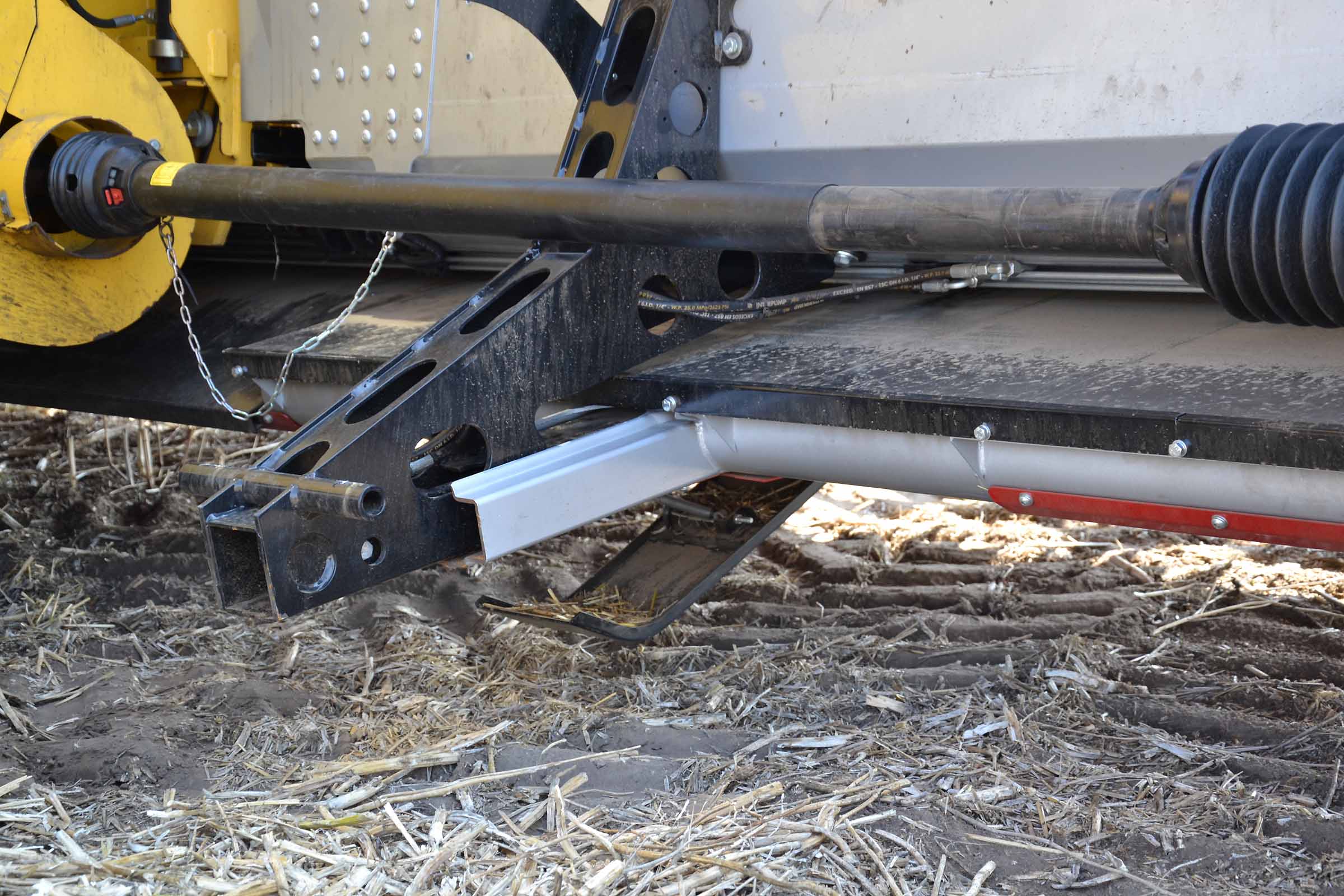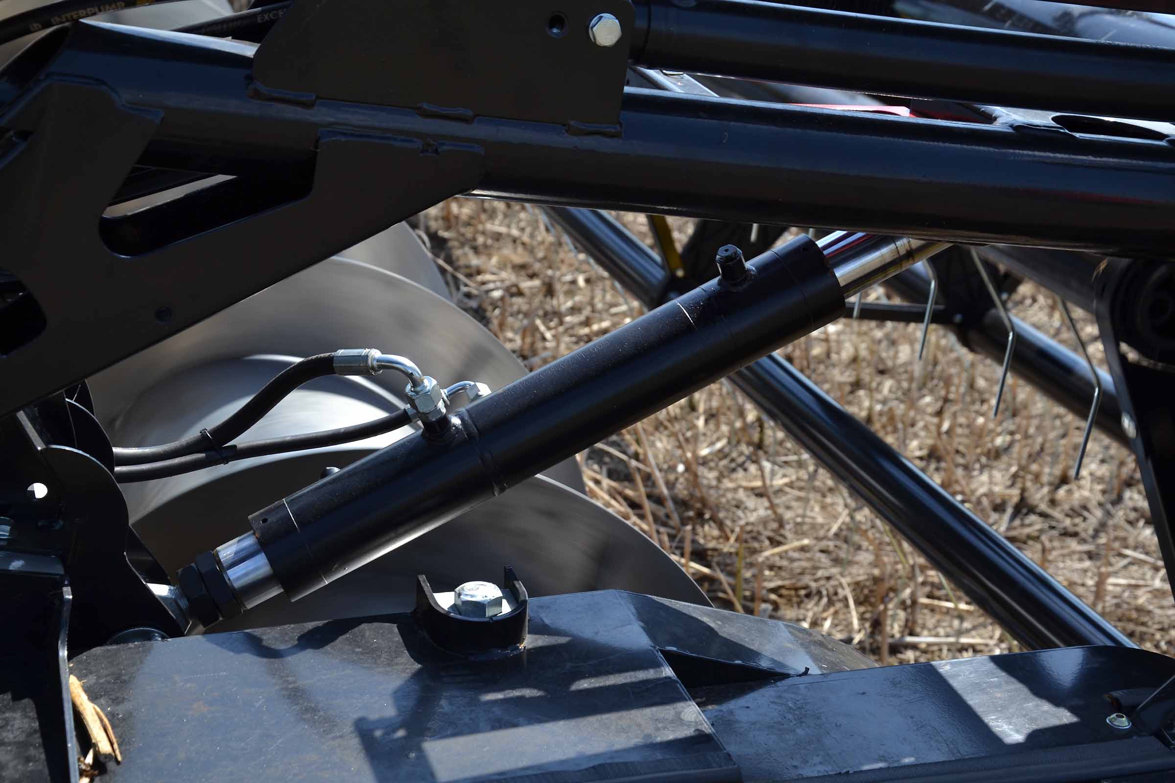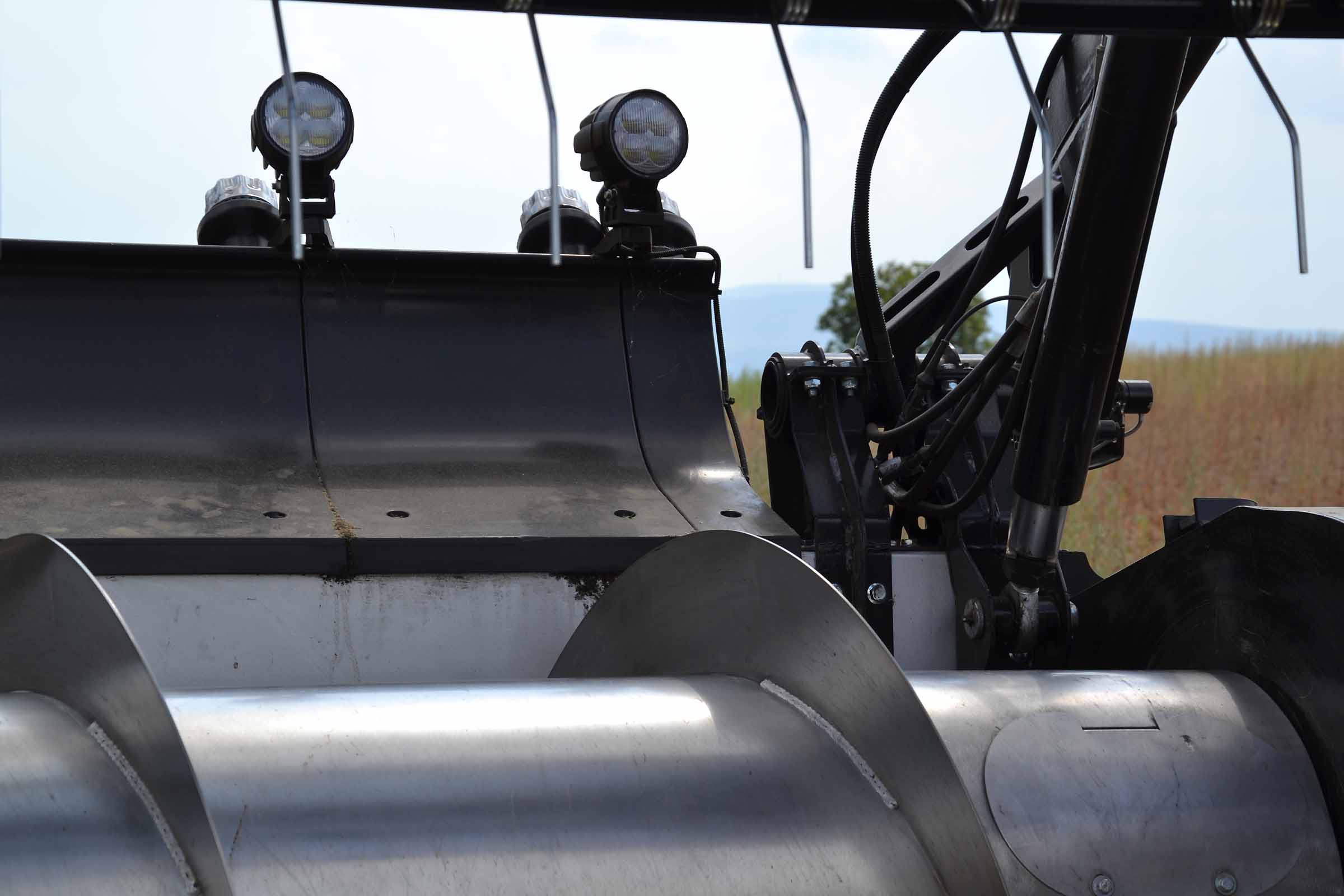 Sur la photo, sous le vérin hydraulique, vous pouvez voir le boulon à travers lequel la hauteur de la vis d’alimentation peut être réglée. Une opération simple et rapide même dans le champ.