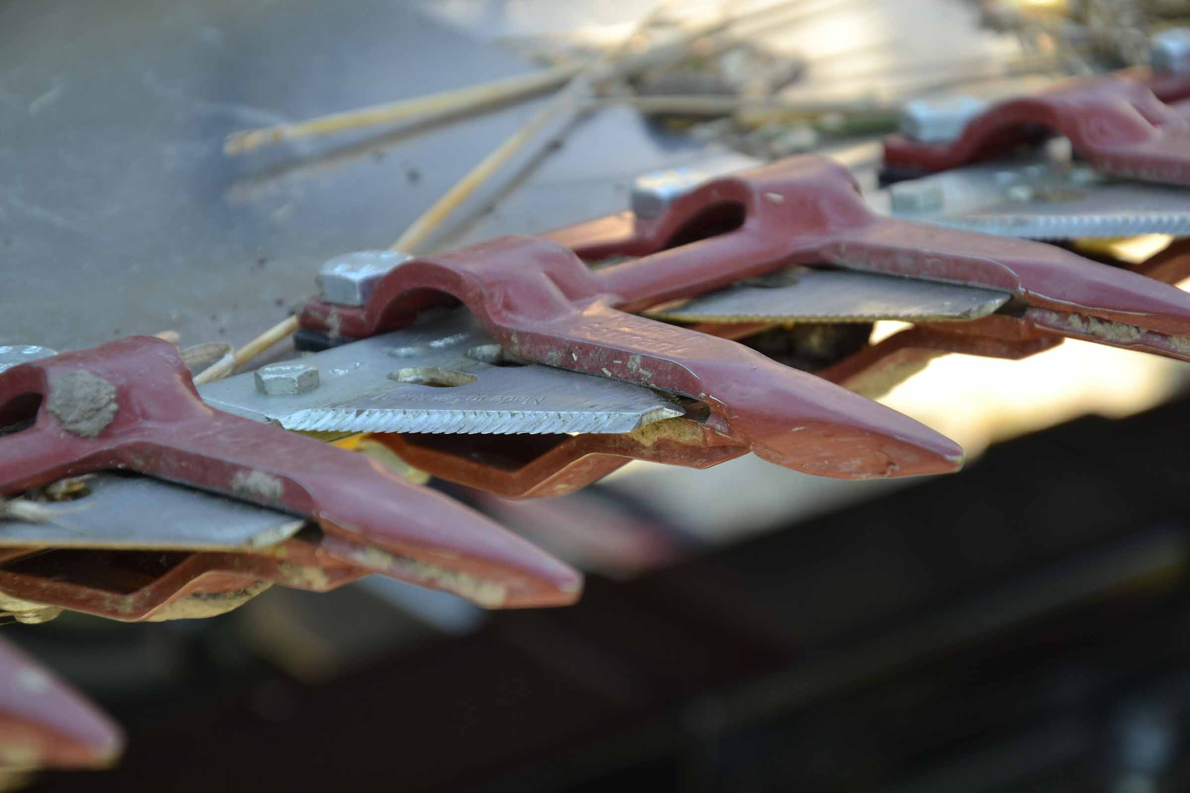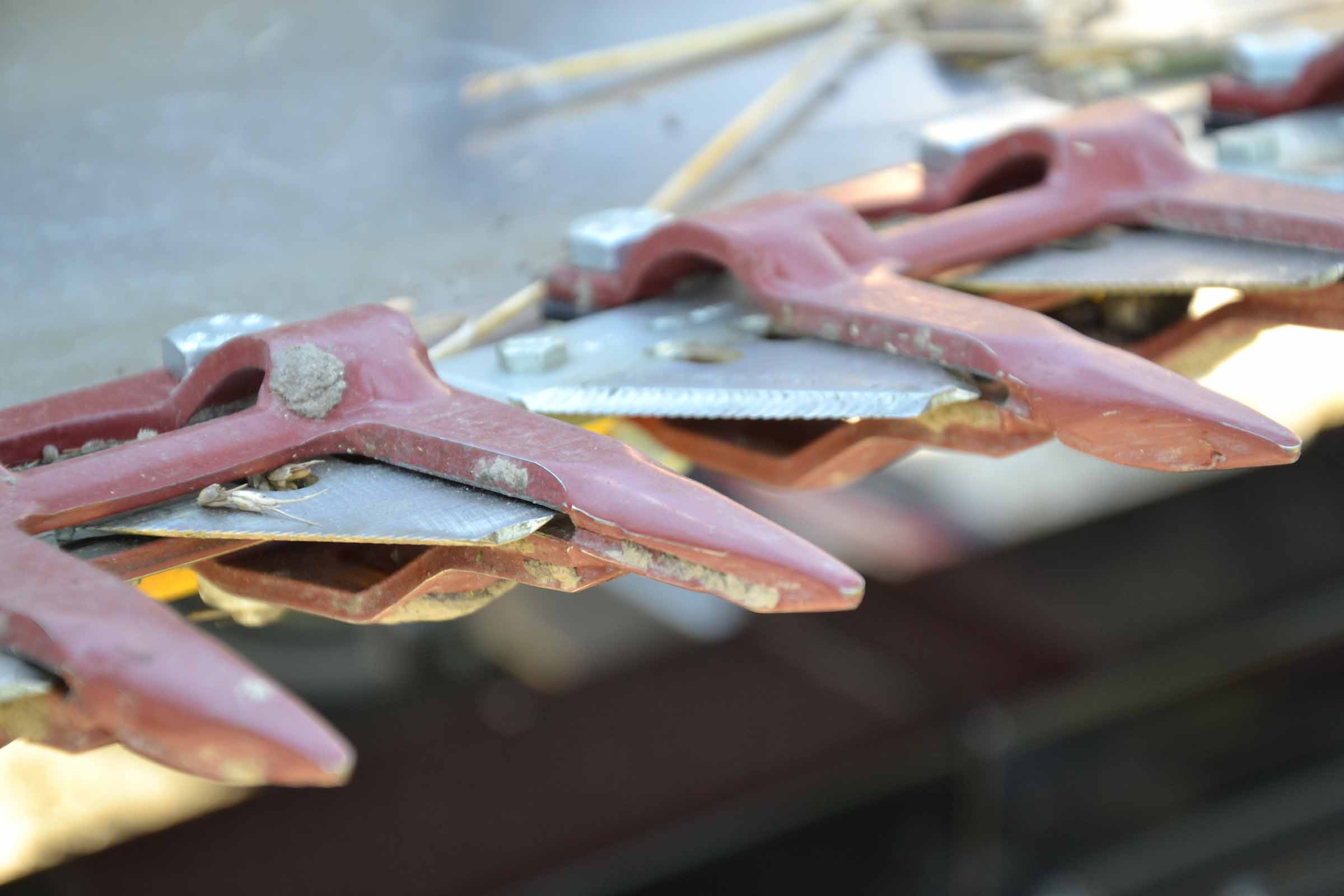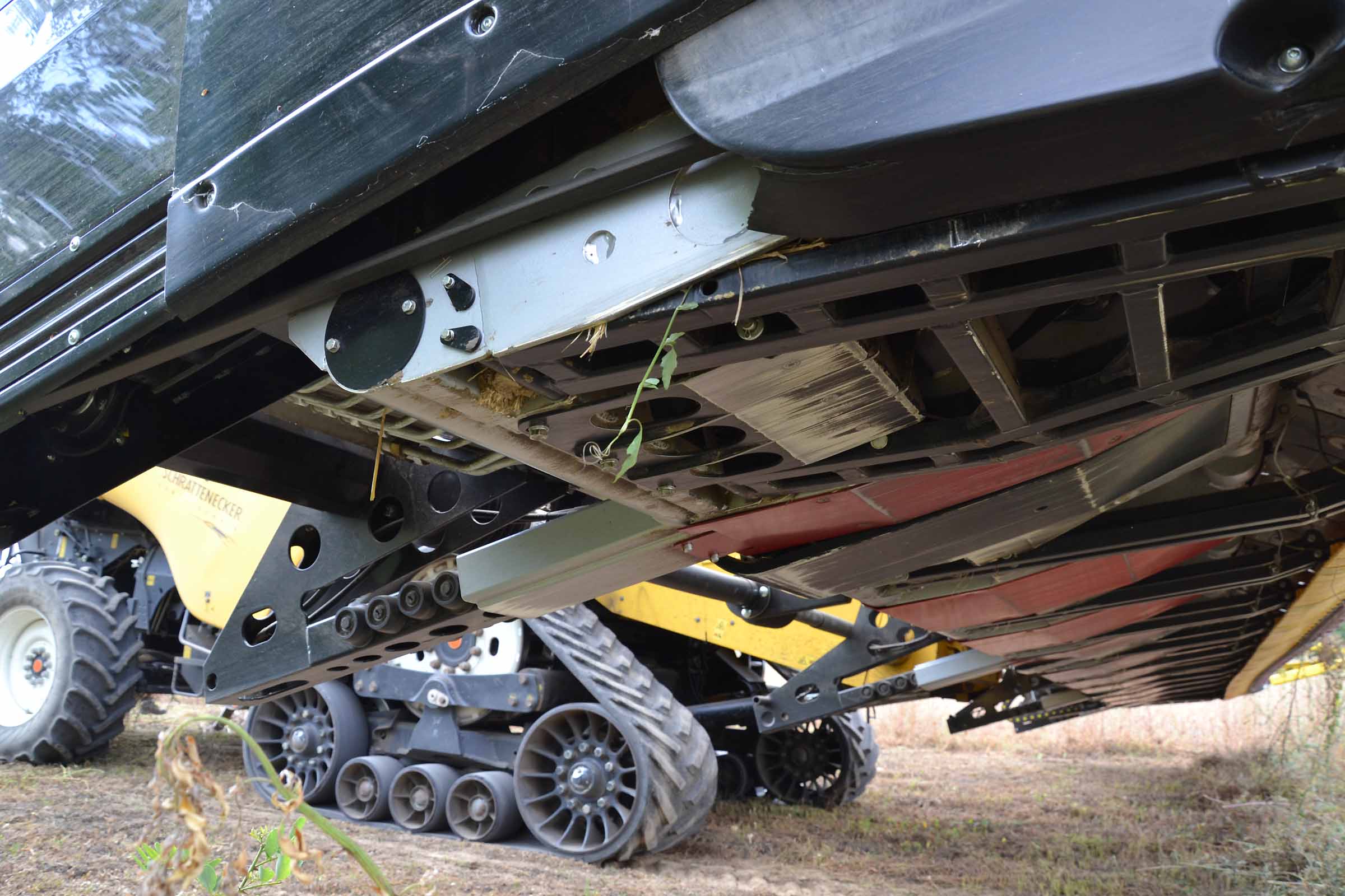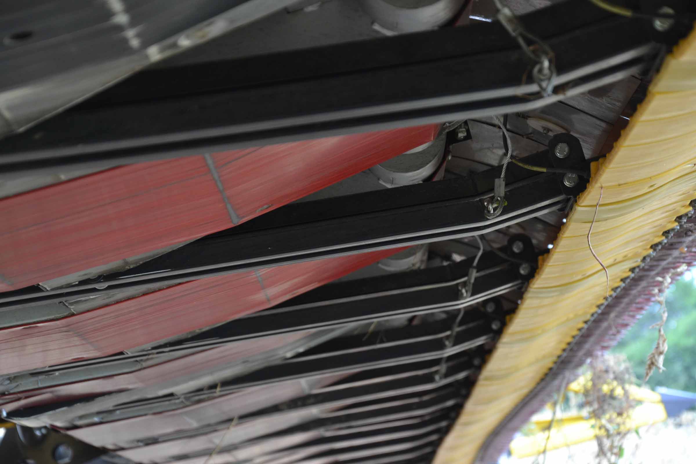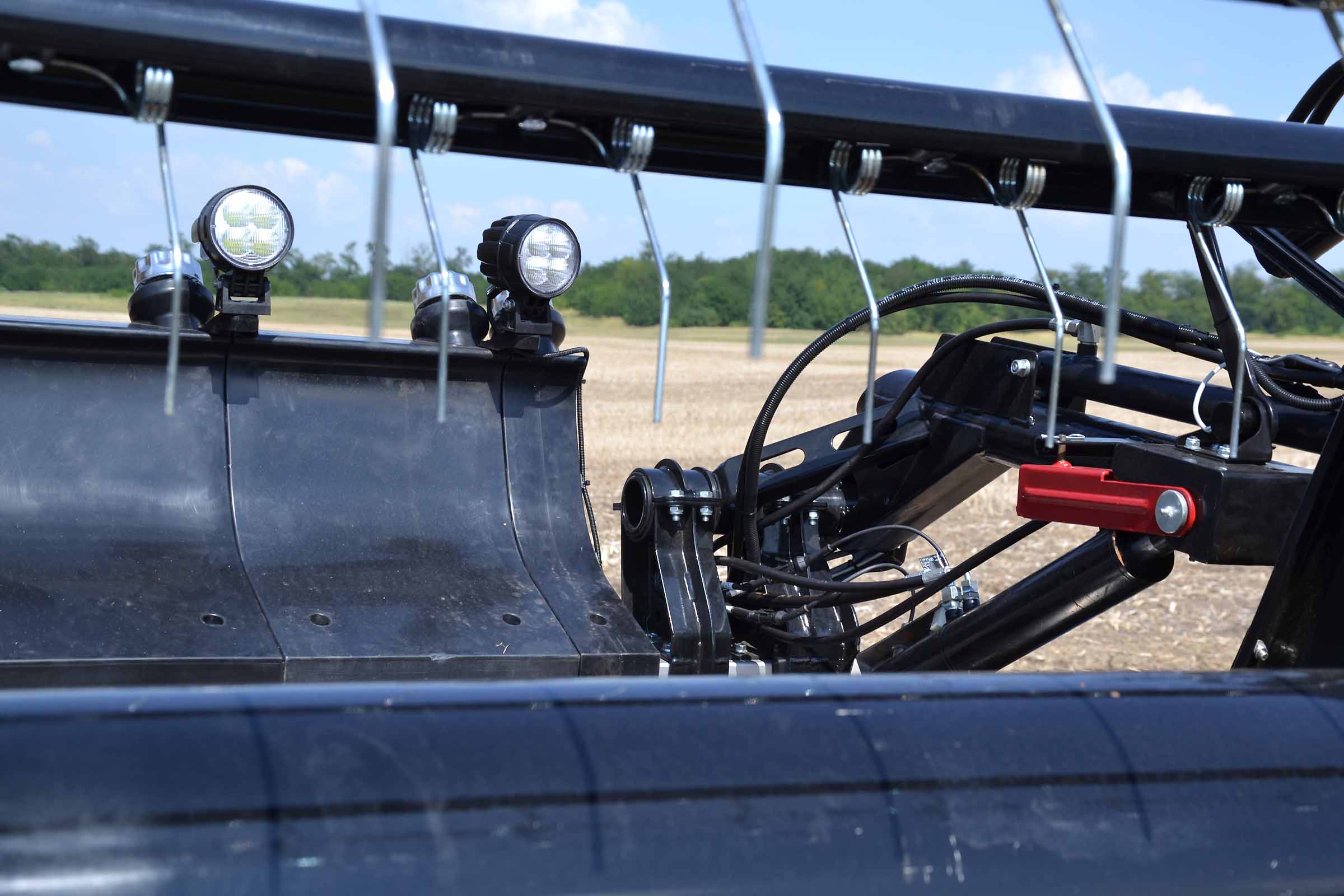 Sur la photo, en rouge, on voit les cales de sécurité du rabatteur qui bloque son mouvement lors des opérations de maintenance.