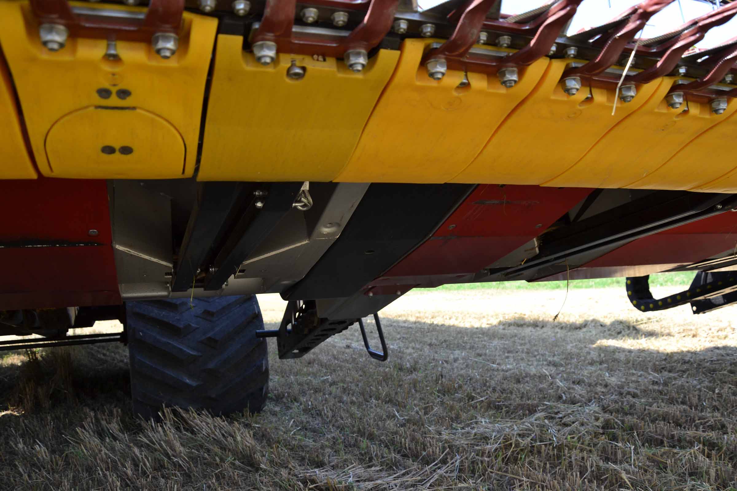 Des éléments anti-usure spéciaux en hardox sont positionnés sur le fond de la plateforme (de couleur rouge) tandis qu'en noir se trouvent les patins de lecture de la distance au sol qui s'activent automatiquement lorsque l'on travaille en mode rigide. Il y a 4 patins sur la barre de coupe de 10,70 mètres. La coupe est également équipée d'une fonction de stationnement qui positionne automatiquement les patins vers le haut et la plate-forme vario dans une position précise pour un positionnement en toute sécurité sur le chariot de transport.