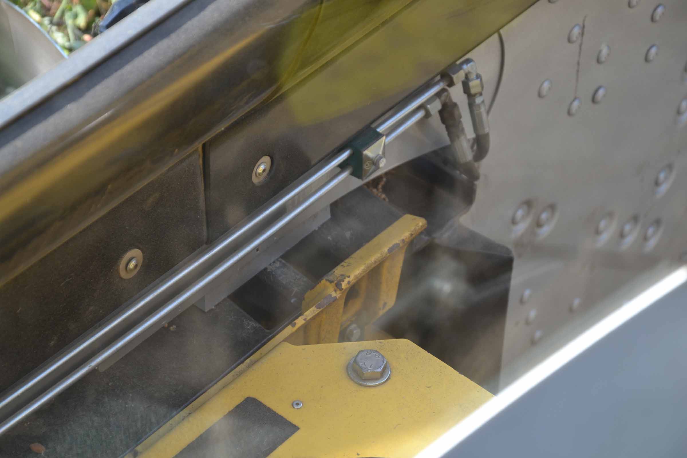Derrière le moteur hydraulique de la scie verticale, on peut voir le potentiomètre qui lit la position horizontale du rabatteur. Lorsque l'opérateur change la position du rabatteur, le logiciel de la barre de coupe lit constamment sa position, bloquant son mouvement chaque fois qu'il risque d’être en collision avec la lame de coupe.