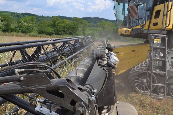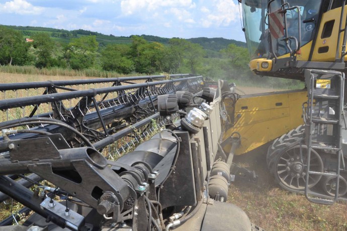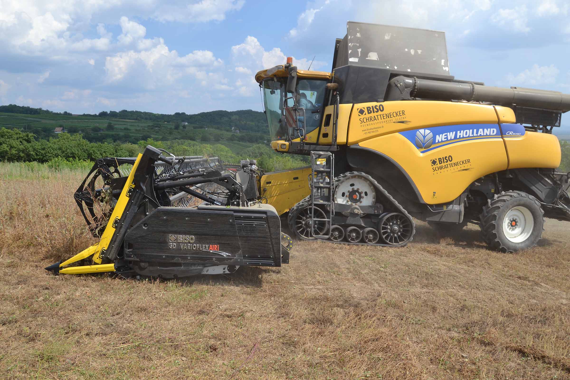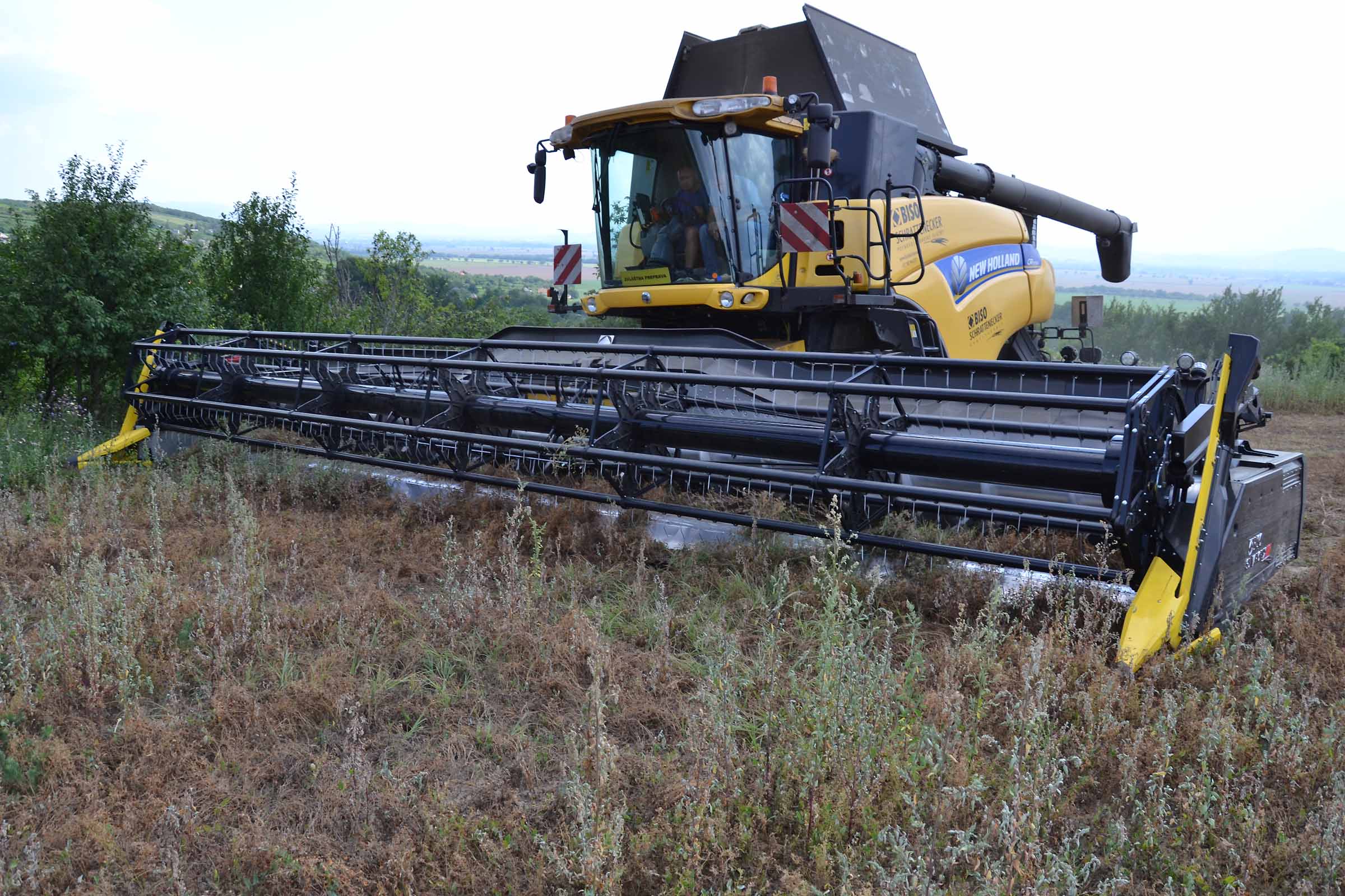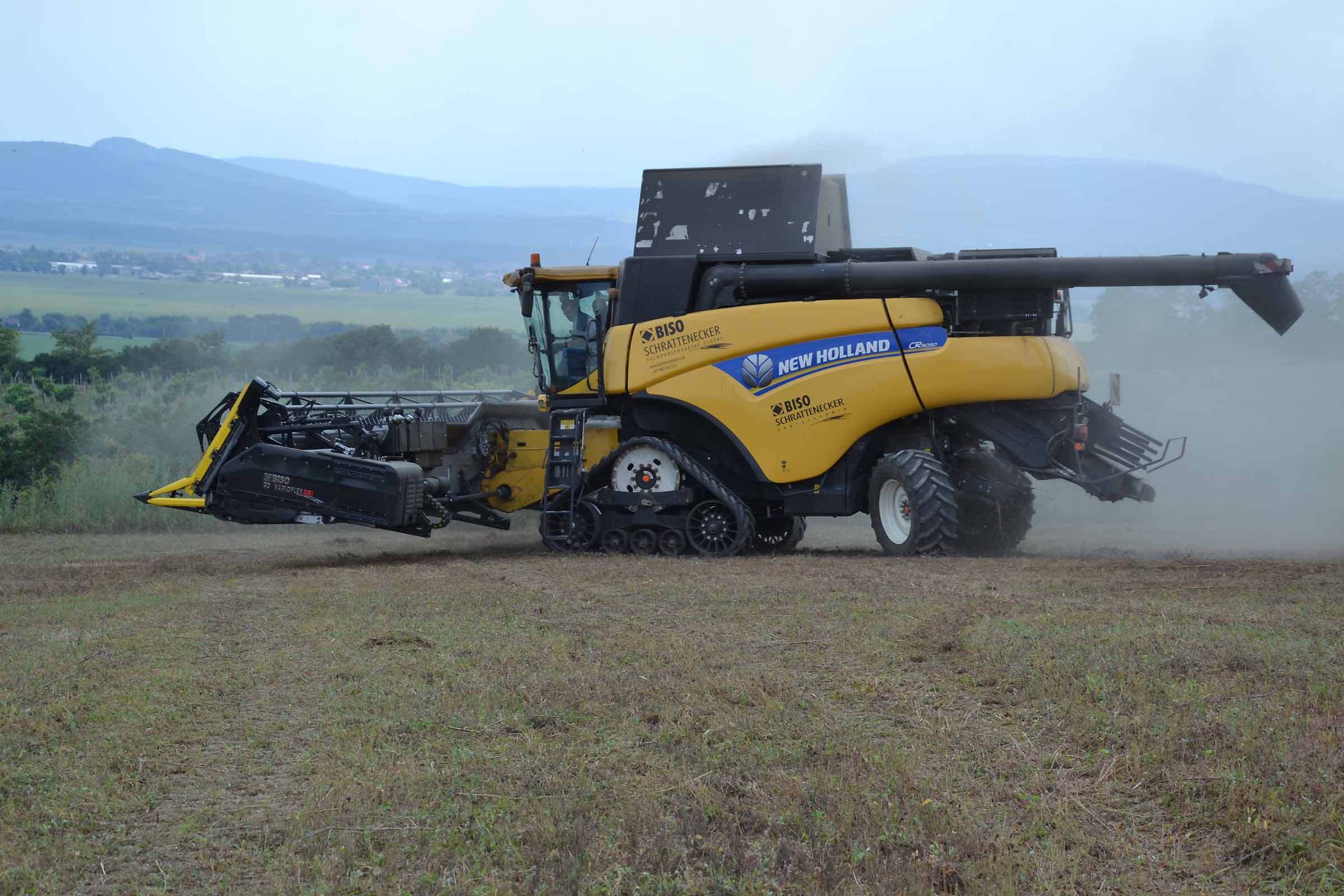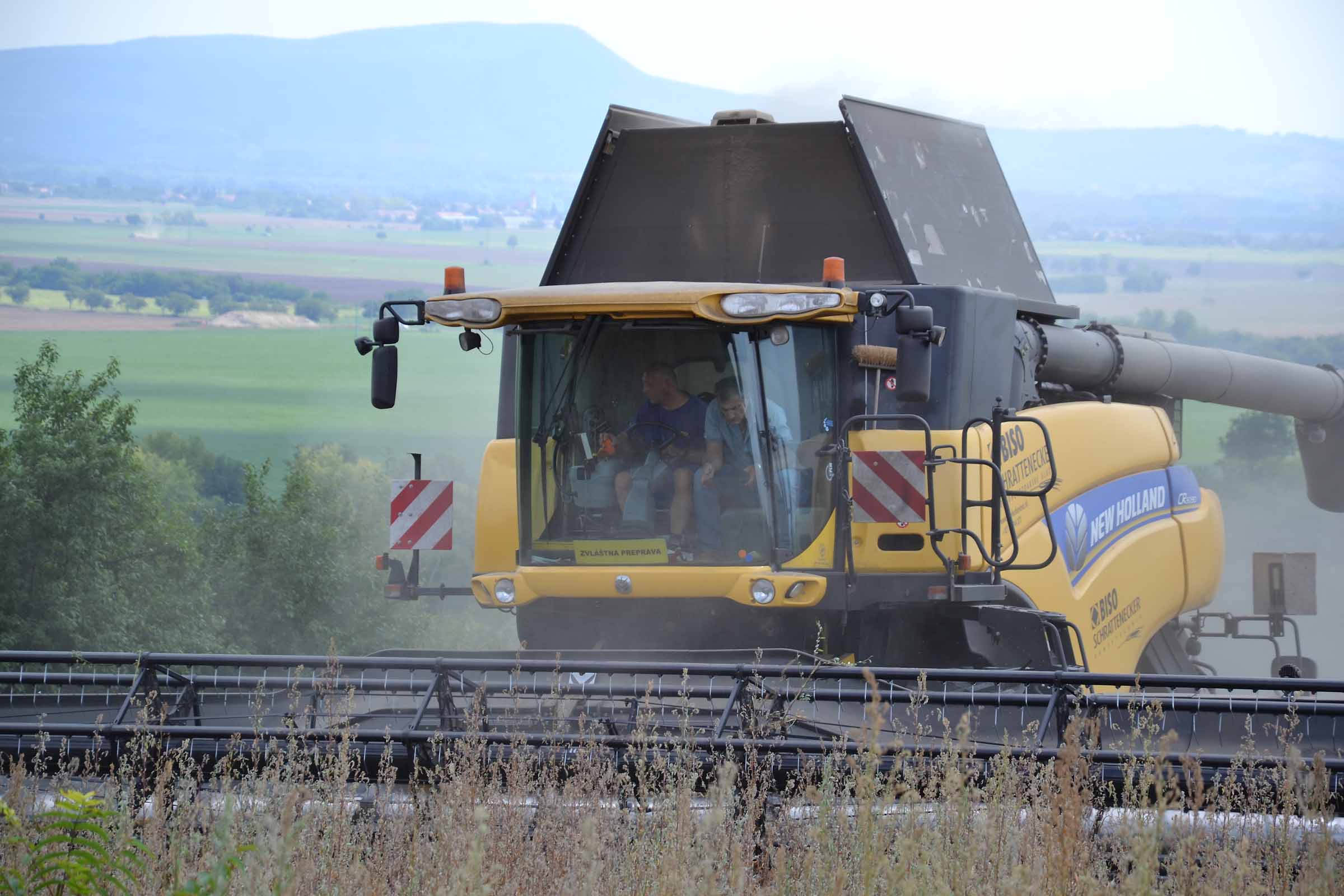 Abbiamo utilizzato la mietitrebbia New Holland CR9090 SmartTrax della nostra flotta BISO. Abbiamo trebbiato questo campo in Slovacchia, vicino a Sturovo. Dietro la mietitrebbia si possono vedere le colline ungheresi che si innalzano dietro il fiume Danubio.