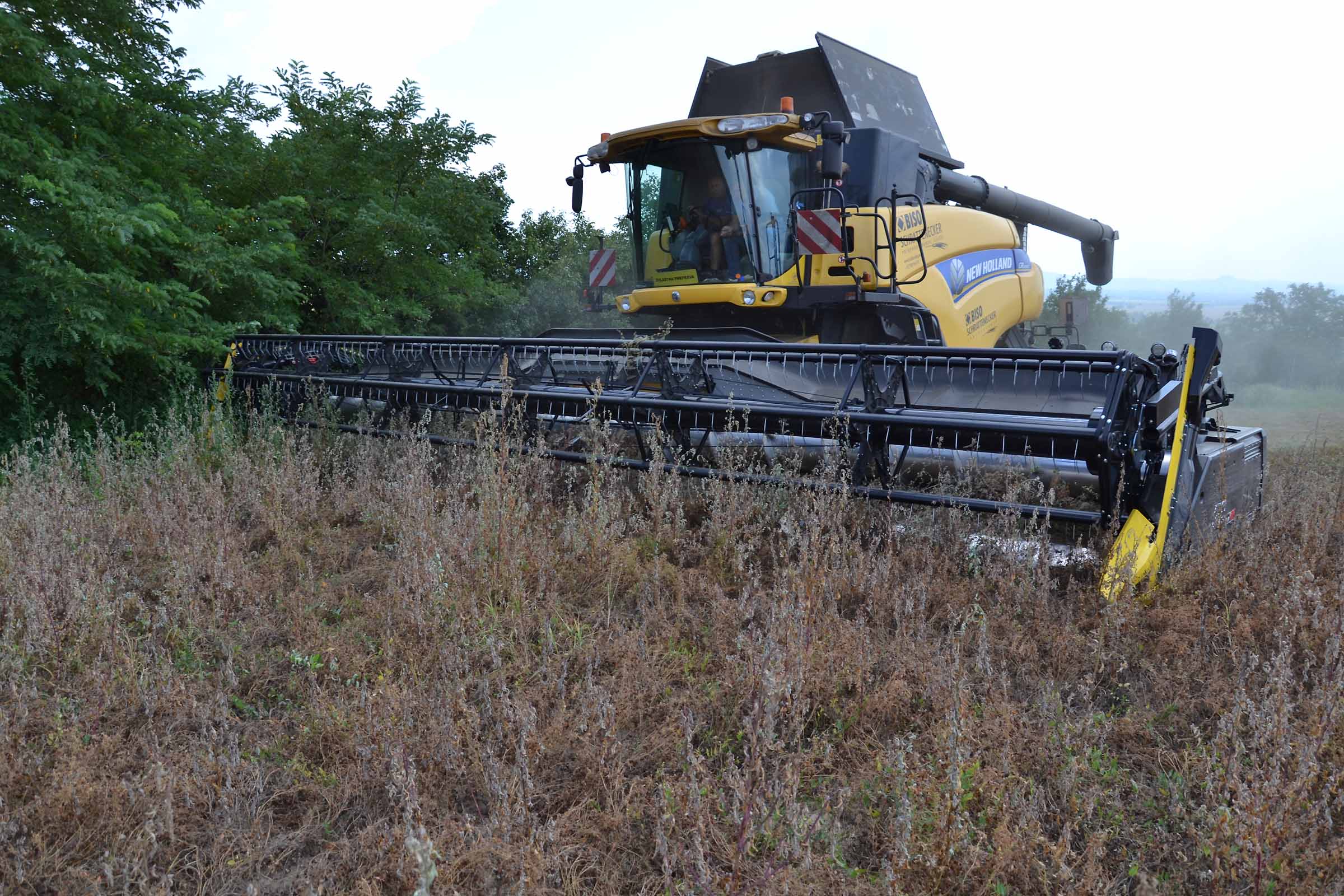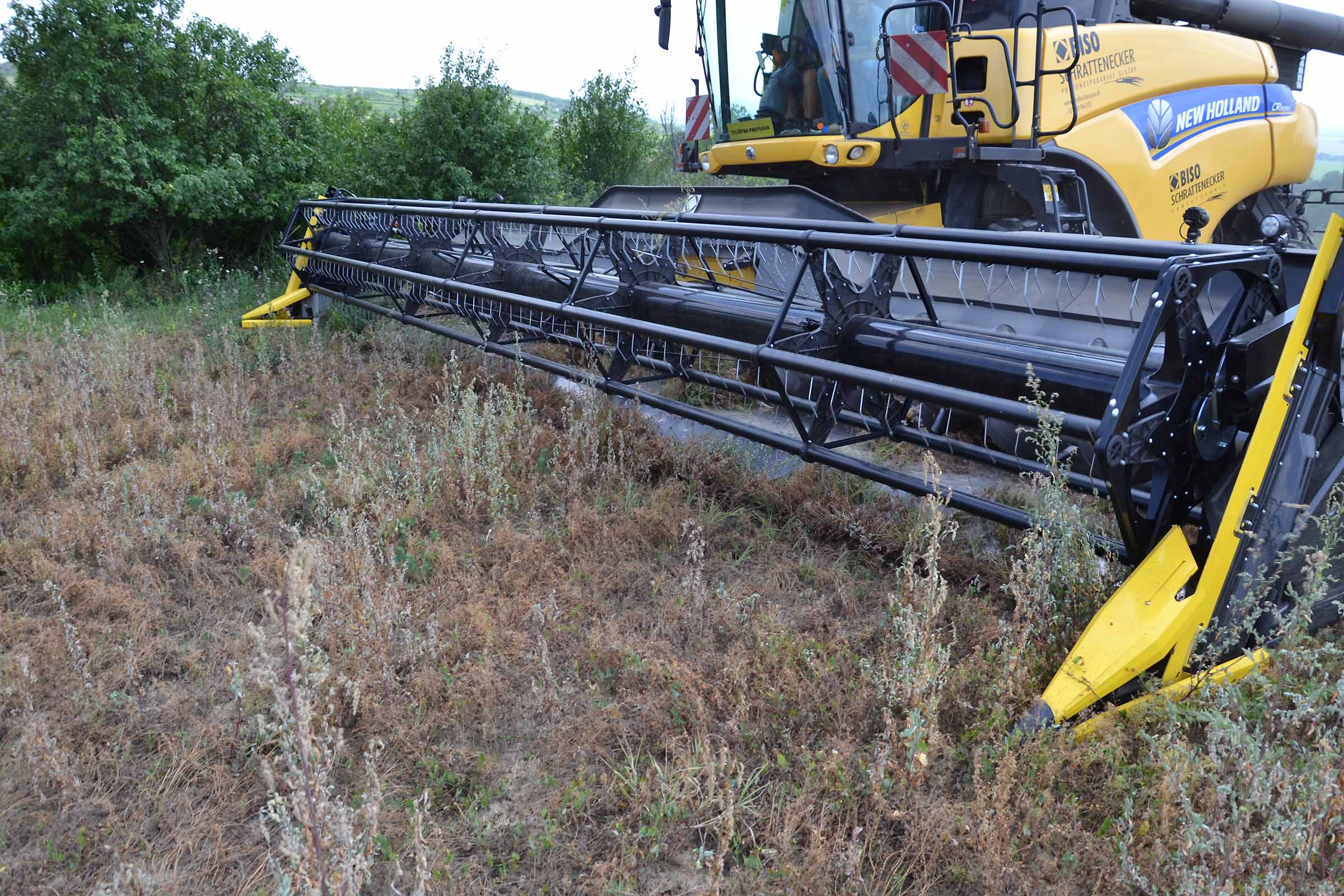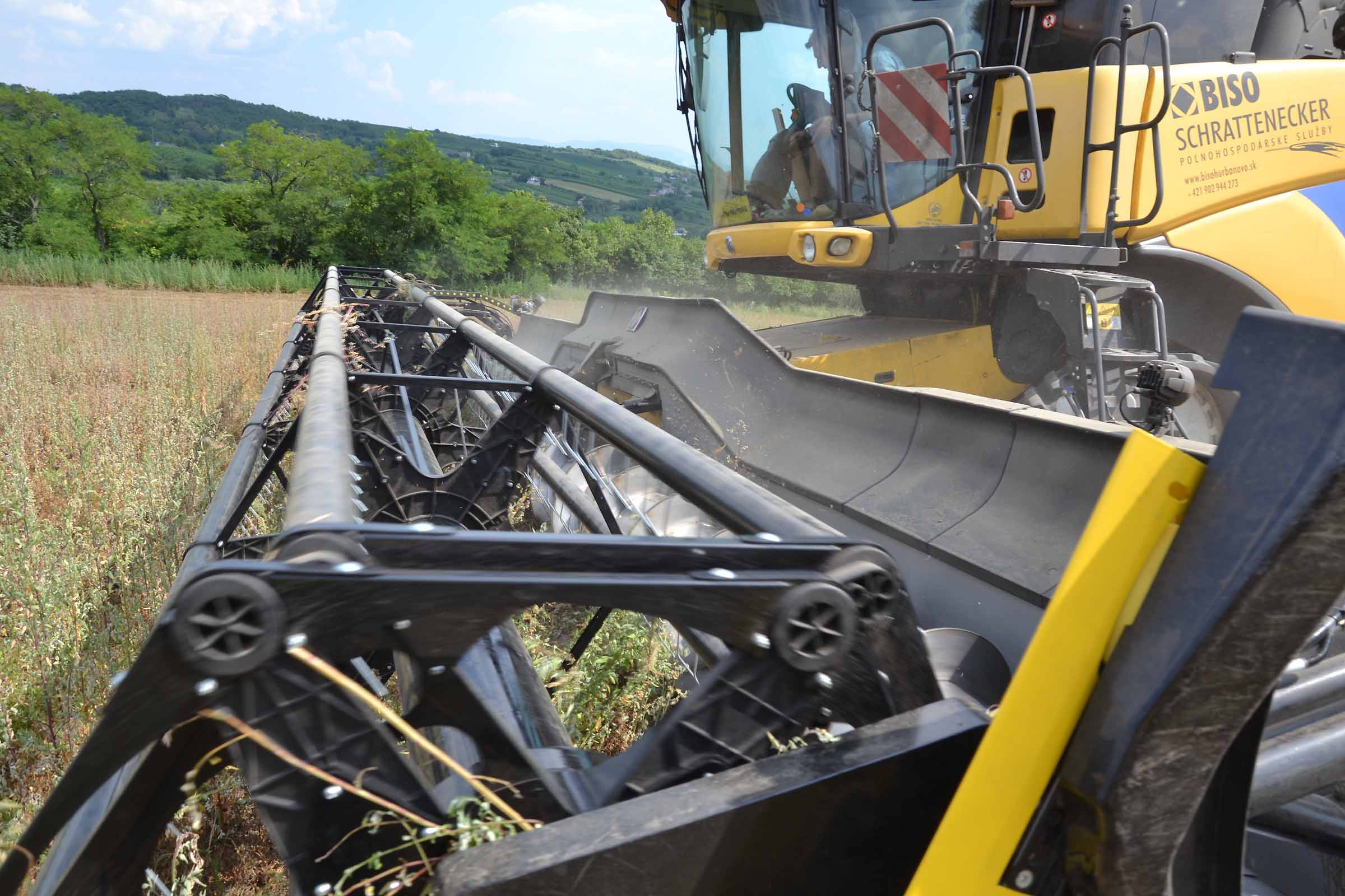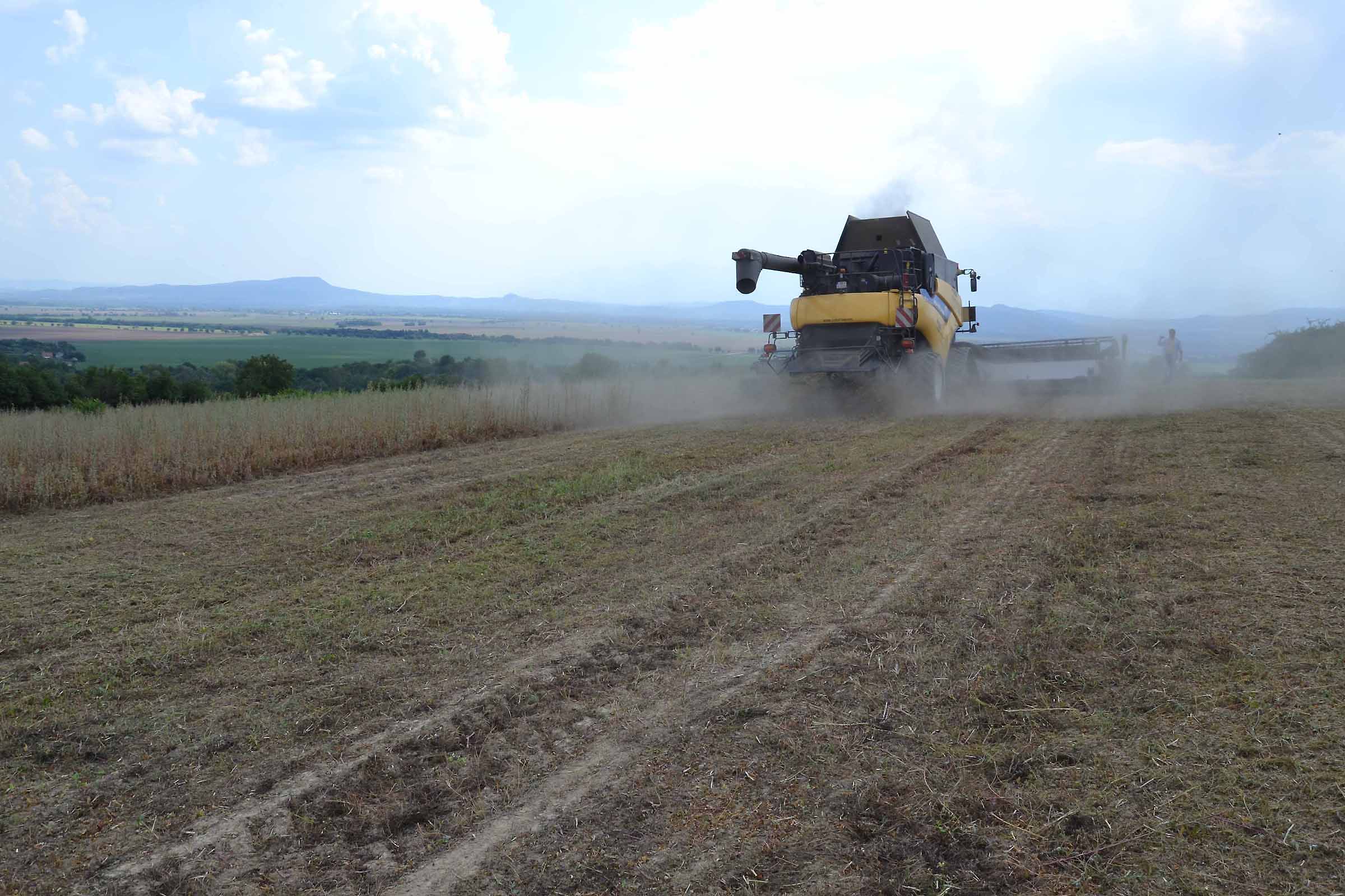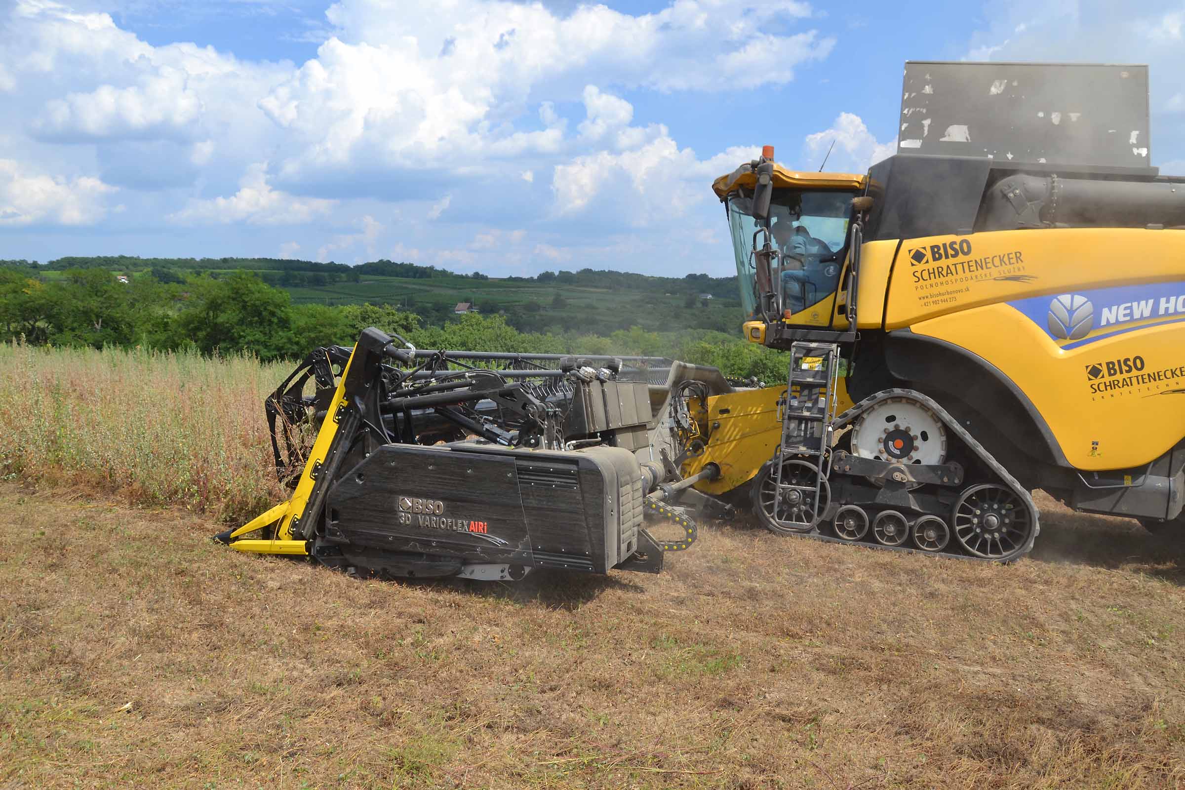 Abbiamo utilizzato la mietitrebbia New Holland CR9090 SmartTrax della nostra flotta BISO. Abbiamo trebbiato questo campo in Slovacchia, vicino a Sturovo. Dietro la mietitrebbia si possono vedere le colline ungheresi che si innalzano dietro il fiume Danubio.