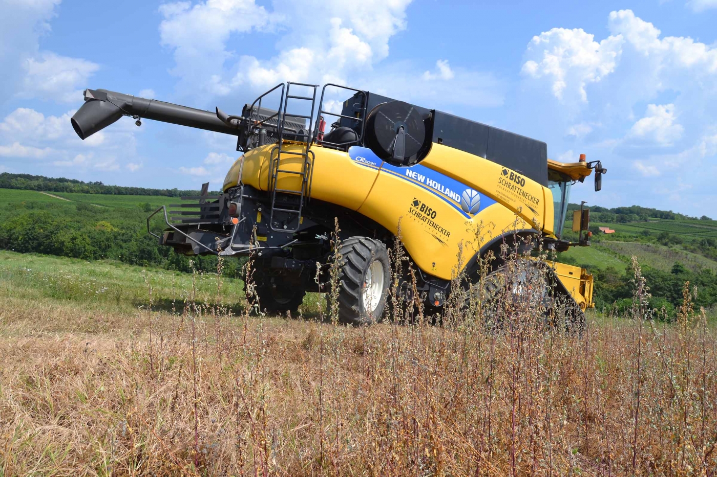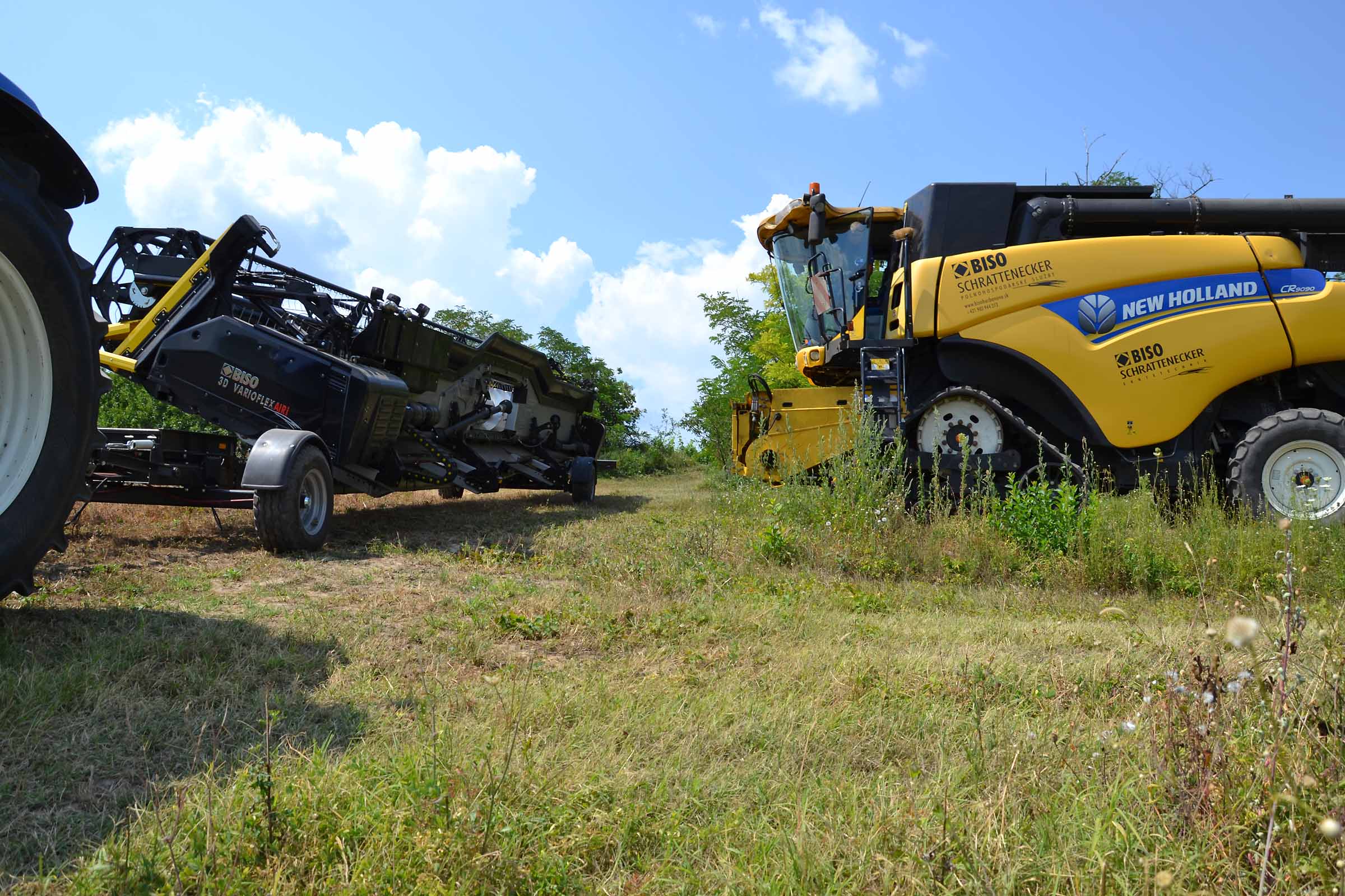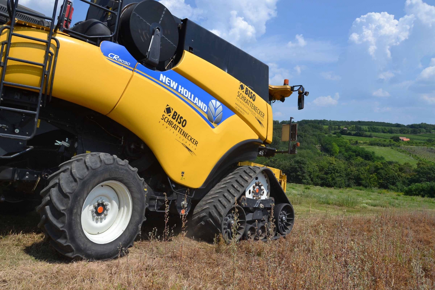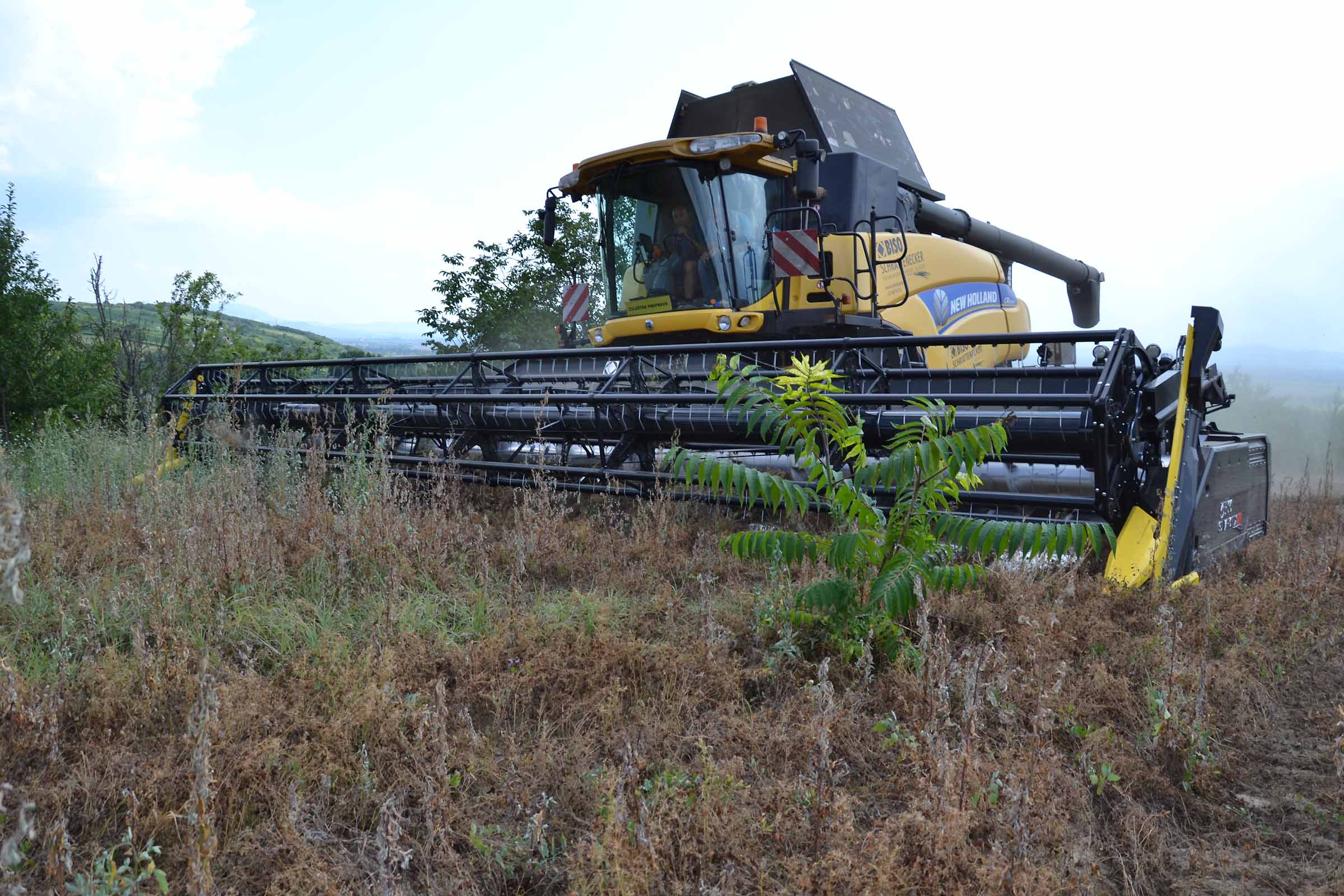 Abbiamo utilizzato la mietitrebbia New Holland CR9090 SmartTrax della nostra flotta BISO. Abbiamo trebbiato questo campo in Slovacchia, vicino a Sturovo. Dietro la mietitrebbia si possono vedere le colline ungheresi che si innalzano dietro il fiume Danubio.