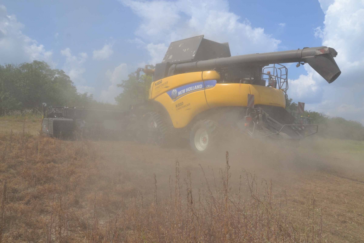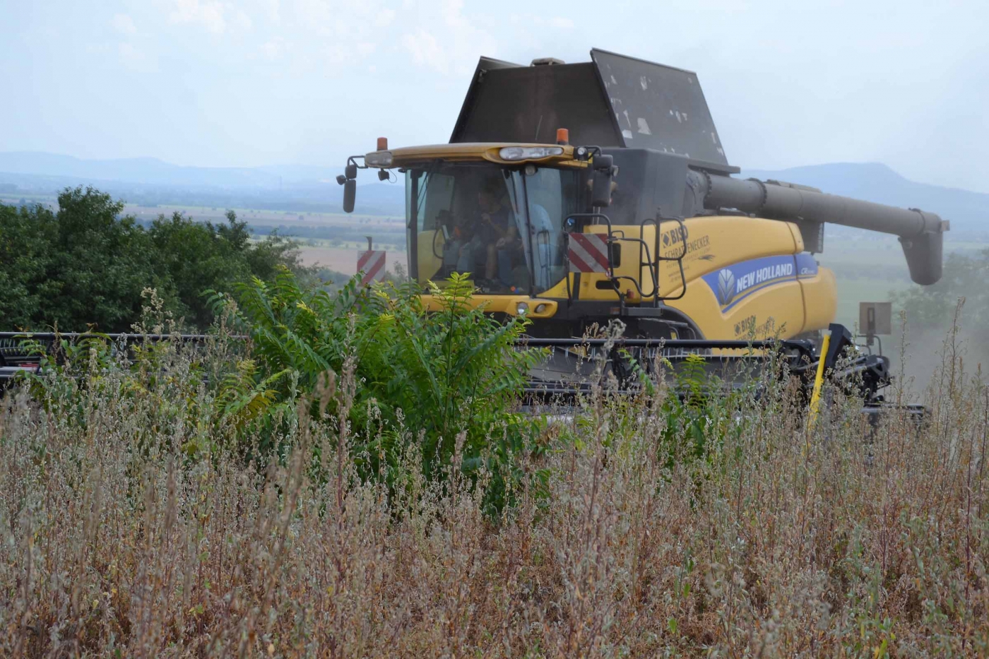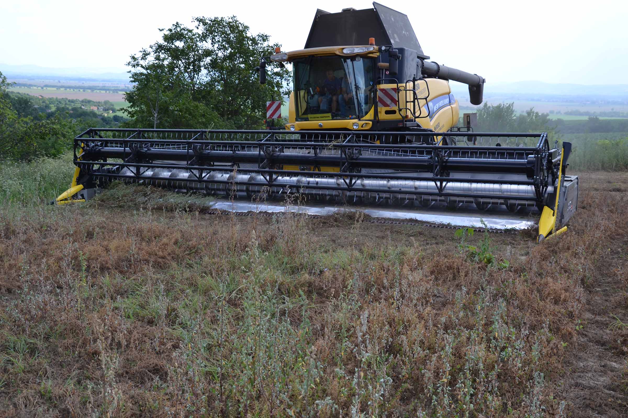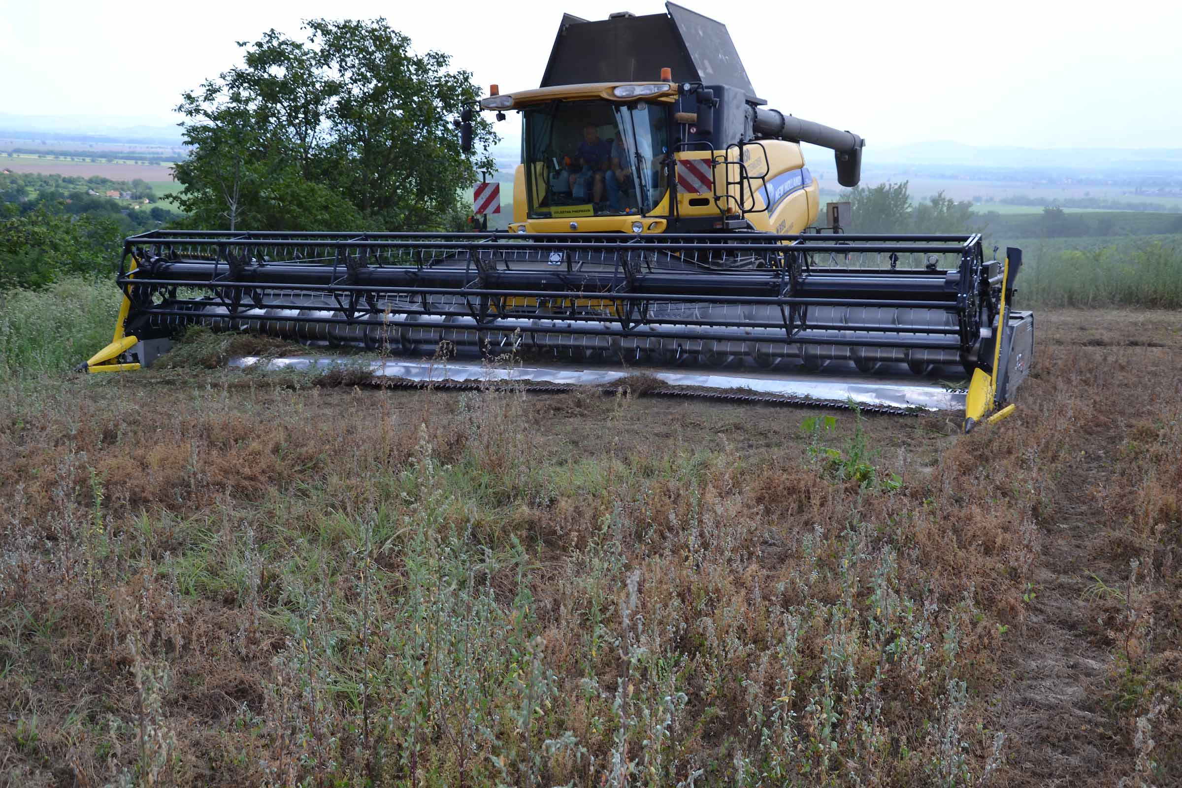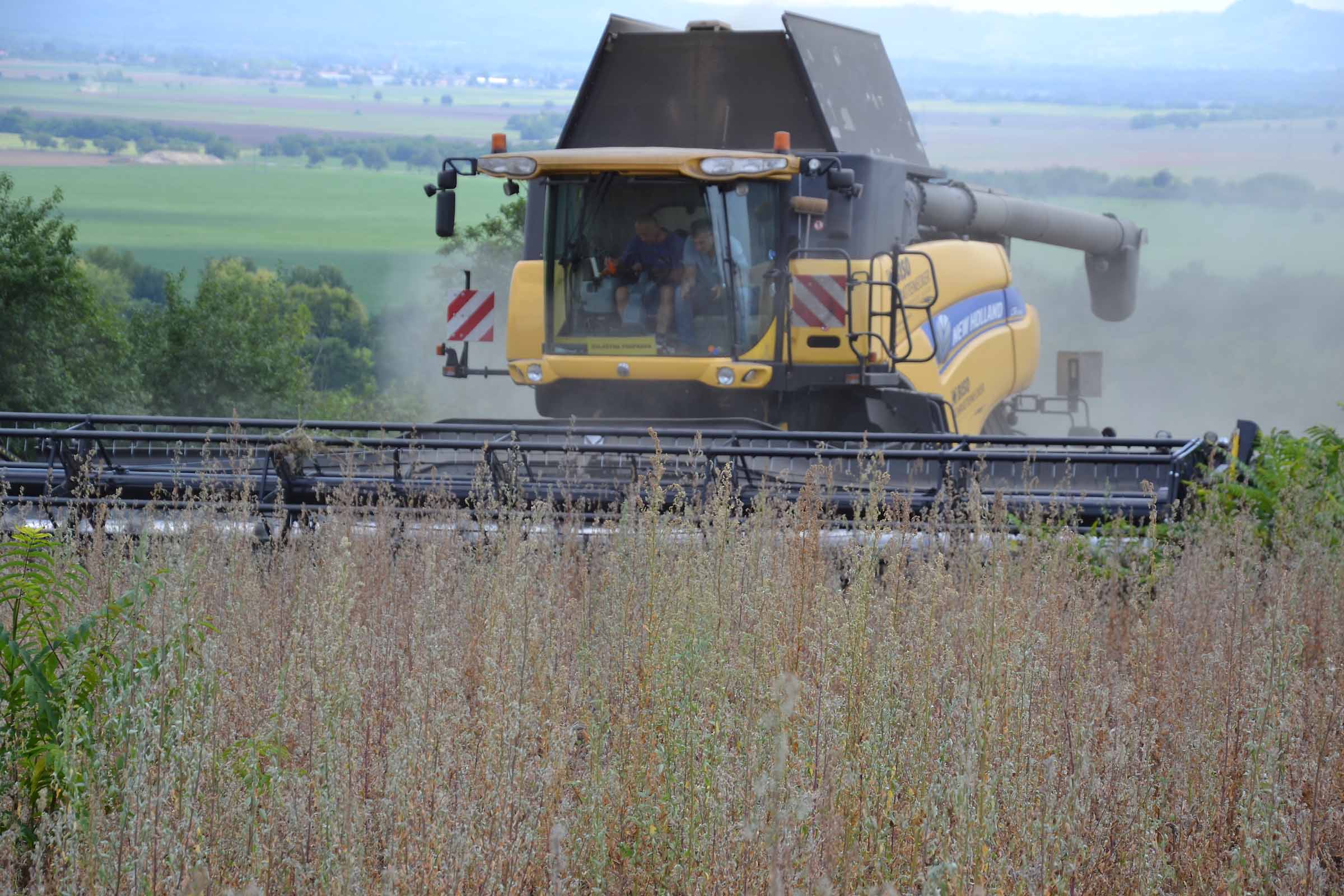 Abbiamo utilizzato la mietitrebbia New Holland CR9090 SmartTrax della nostra flotta BISO. Abbiamo trebbiato questo campo in Slovacchia, vicino a Sturovo. Dietro la mietitrebbia si possono vedere le colline ungheresi che si innalzano dietro il fiume Danubio.