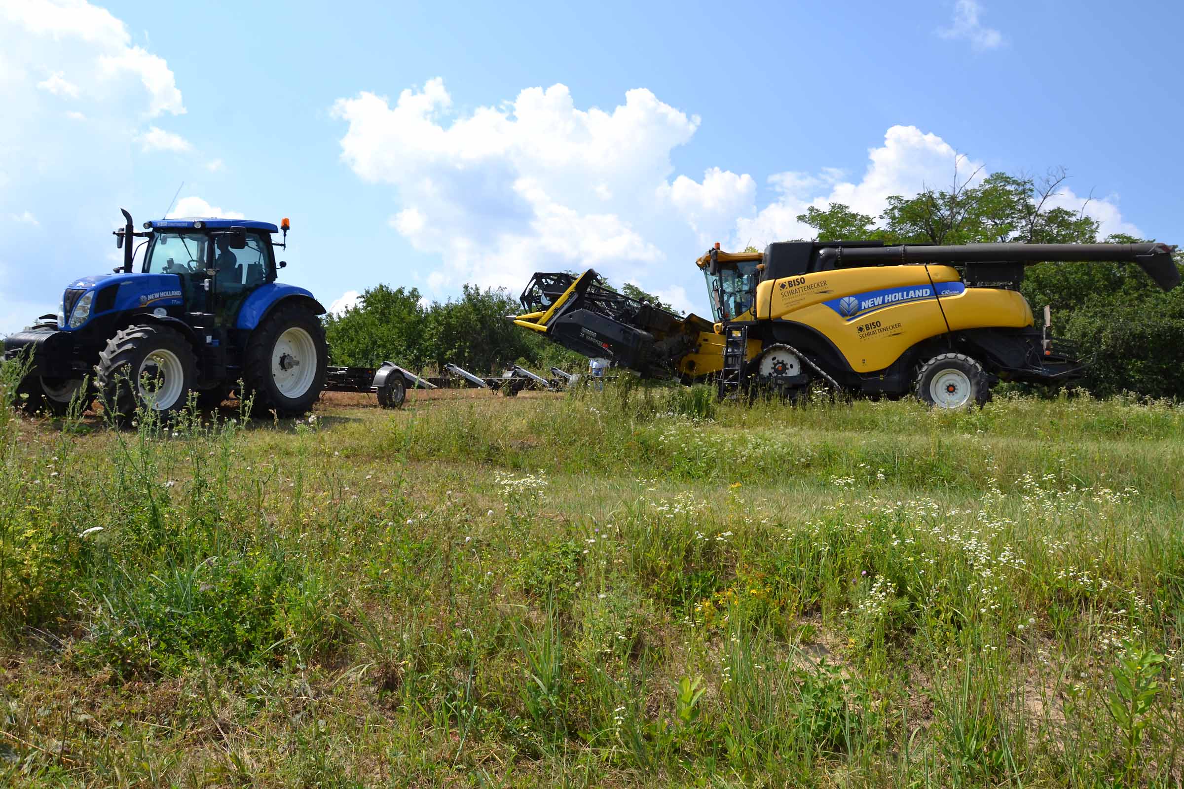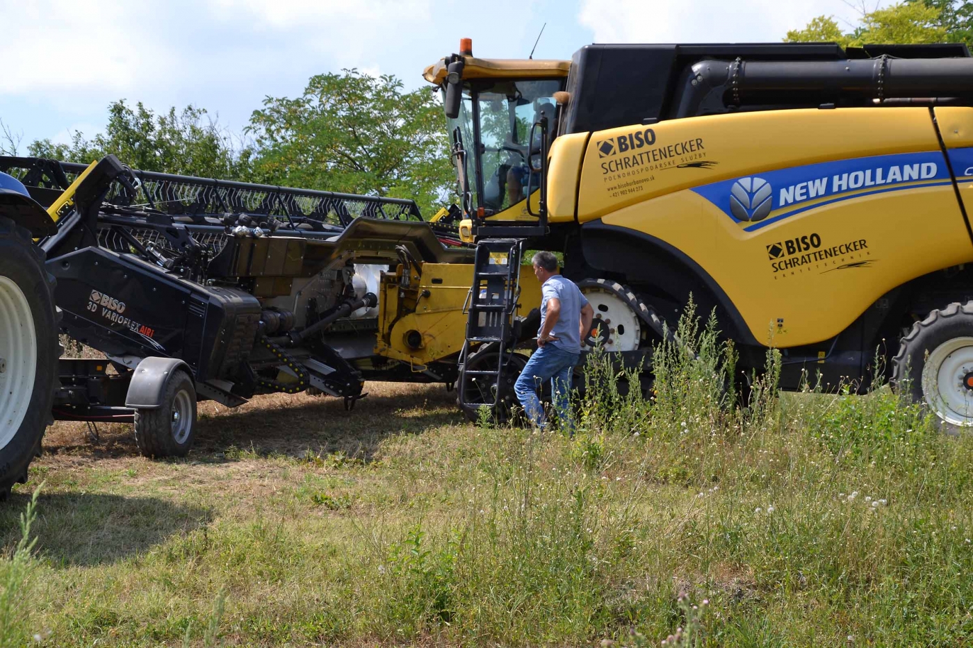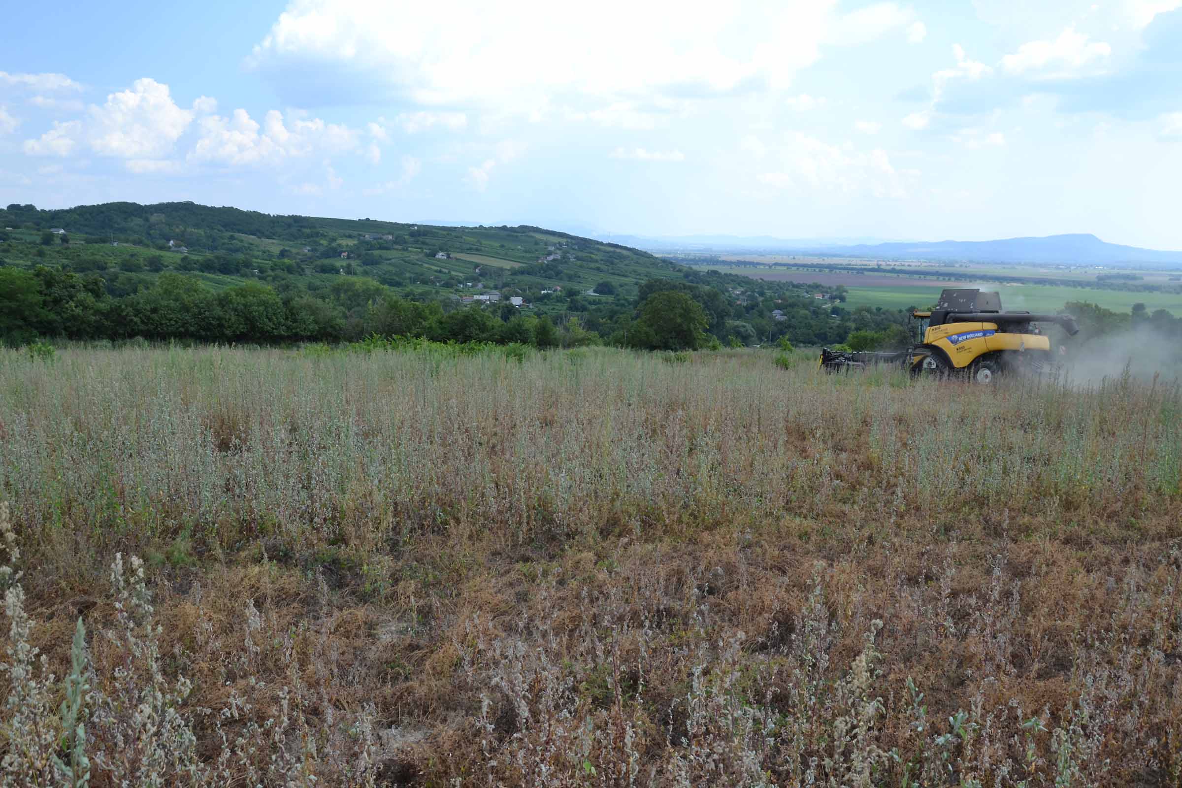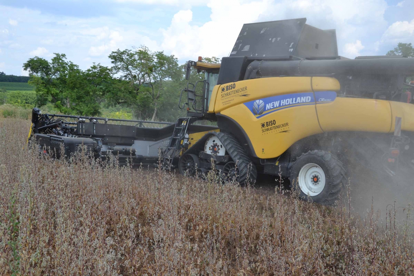 Abbiamo utilizzato la mietitrebbia New Holland CR9090 SmartTrax della nostra flotta BISO. Abbiamo trebbiato questo campo in Slovacchia, vicino a Sturovo. Dietro la mietitrebbia si possono vedere le colline ungheresi che si innalzano dietro il fiume Danubio.