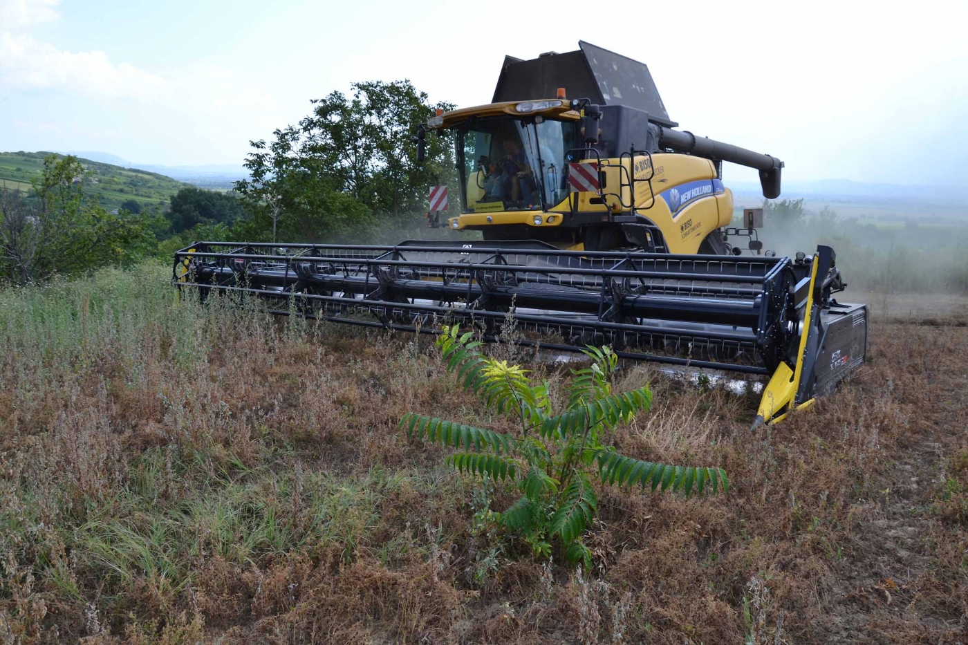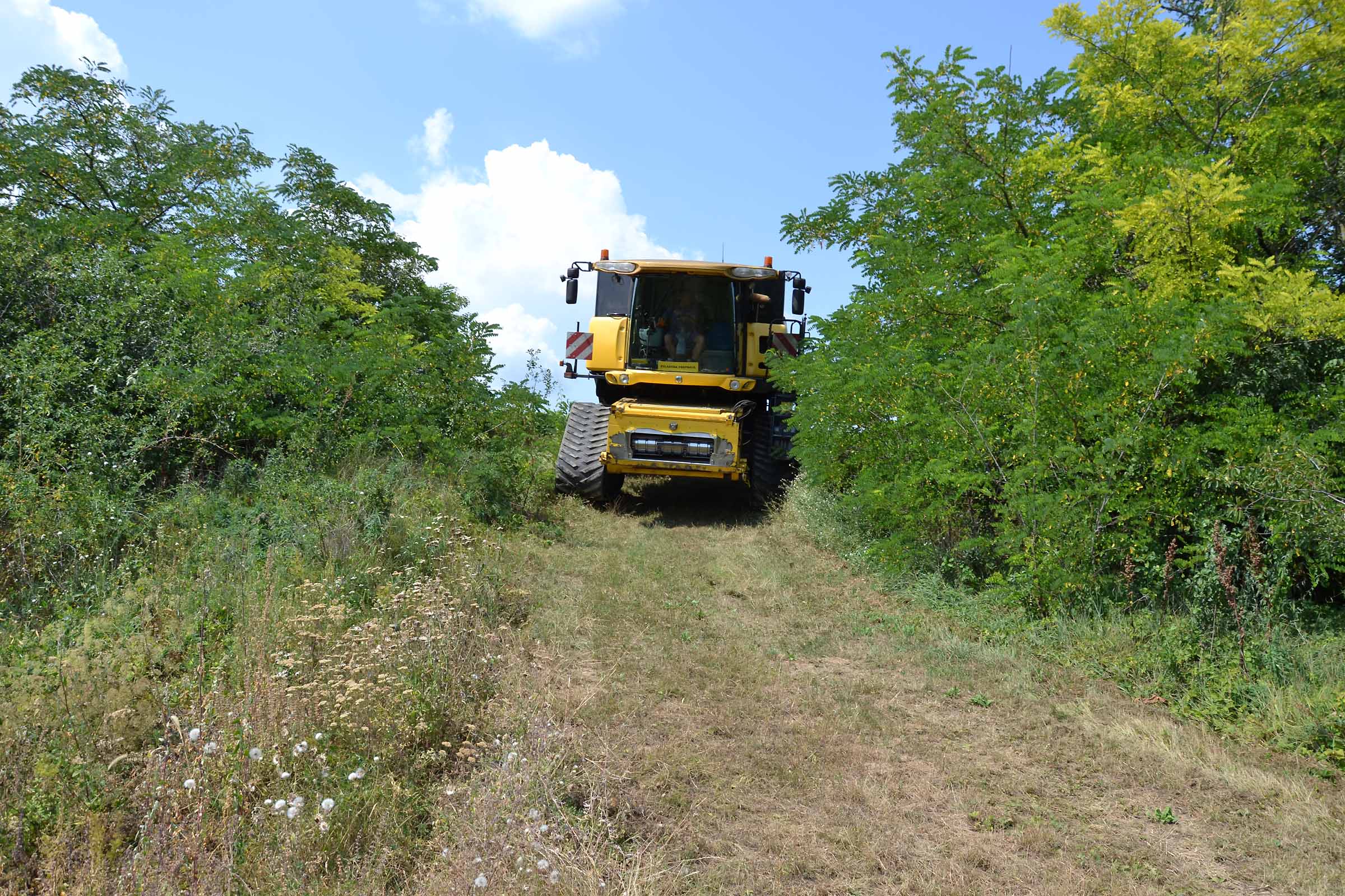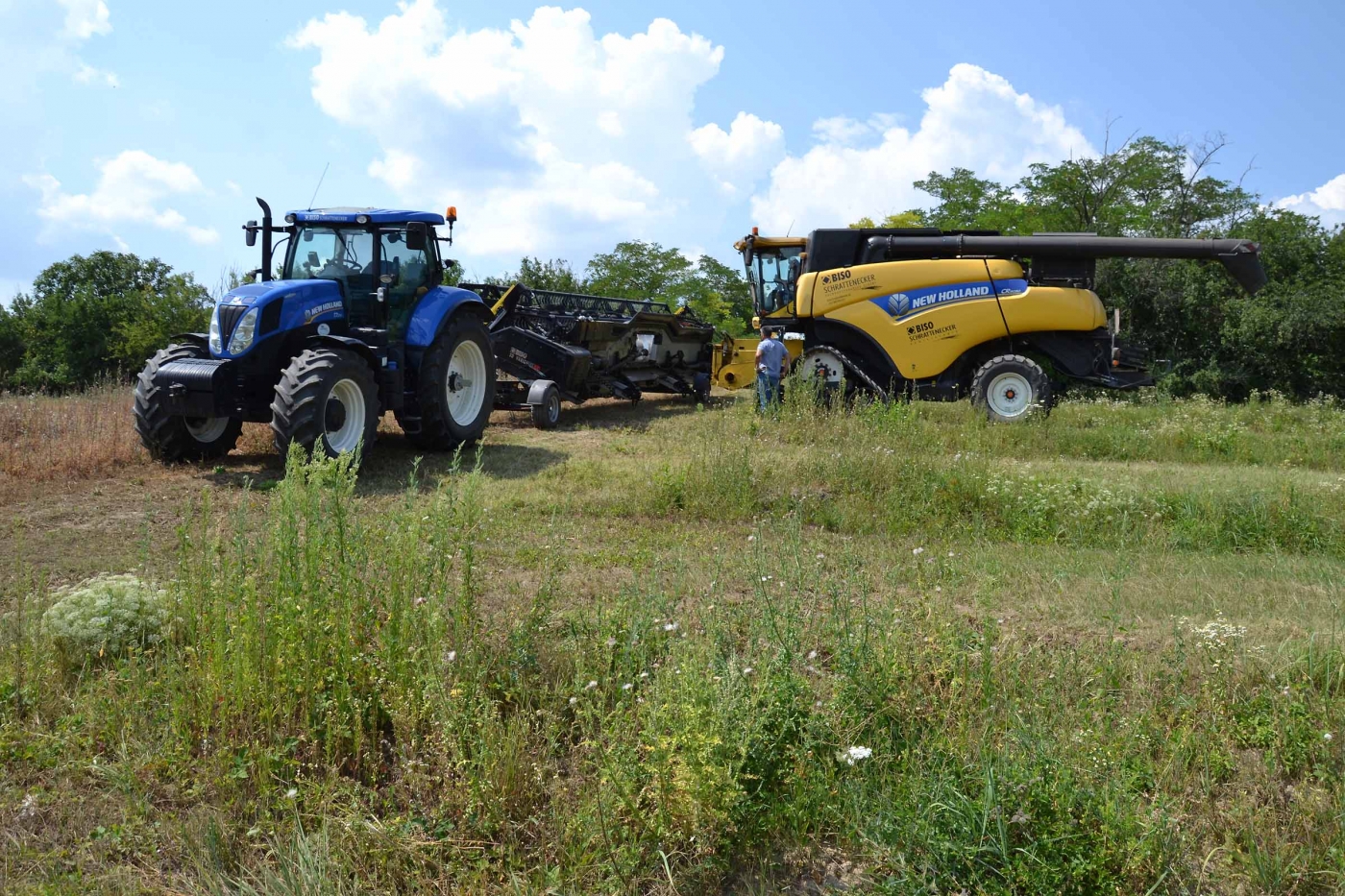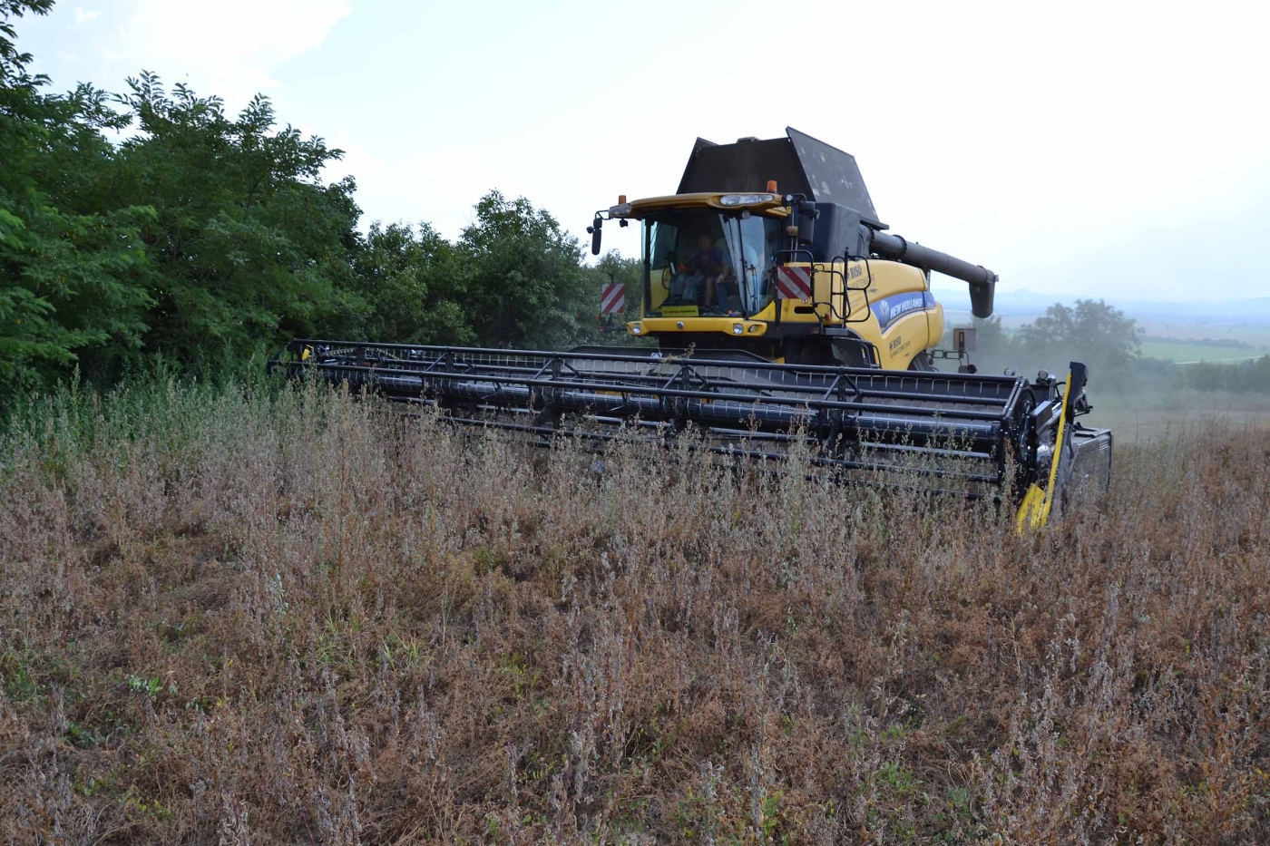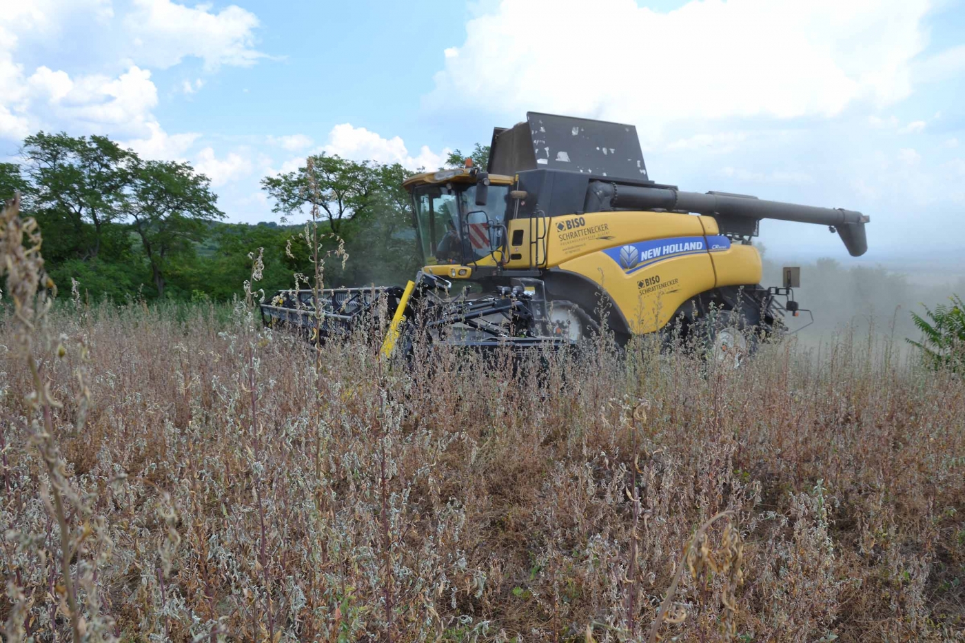 Abbiamo utilizzato la mietitrebbia New Holland CR9090 SmartTrax della nostra flotta BISO. Abbiamo trebbiato questo campo in Slovacchia, vicino a Sturovo. Dietro la mietitrebbia si possono vedere le colline ungheresi che si innalzano dietro il fiume Danubio.