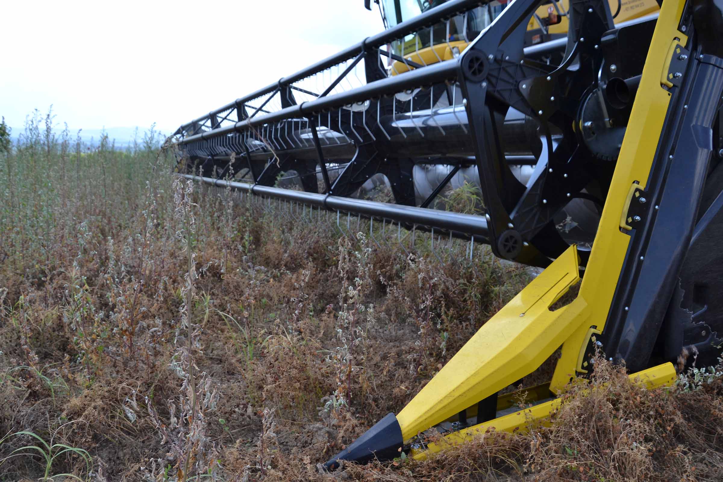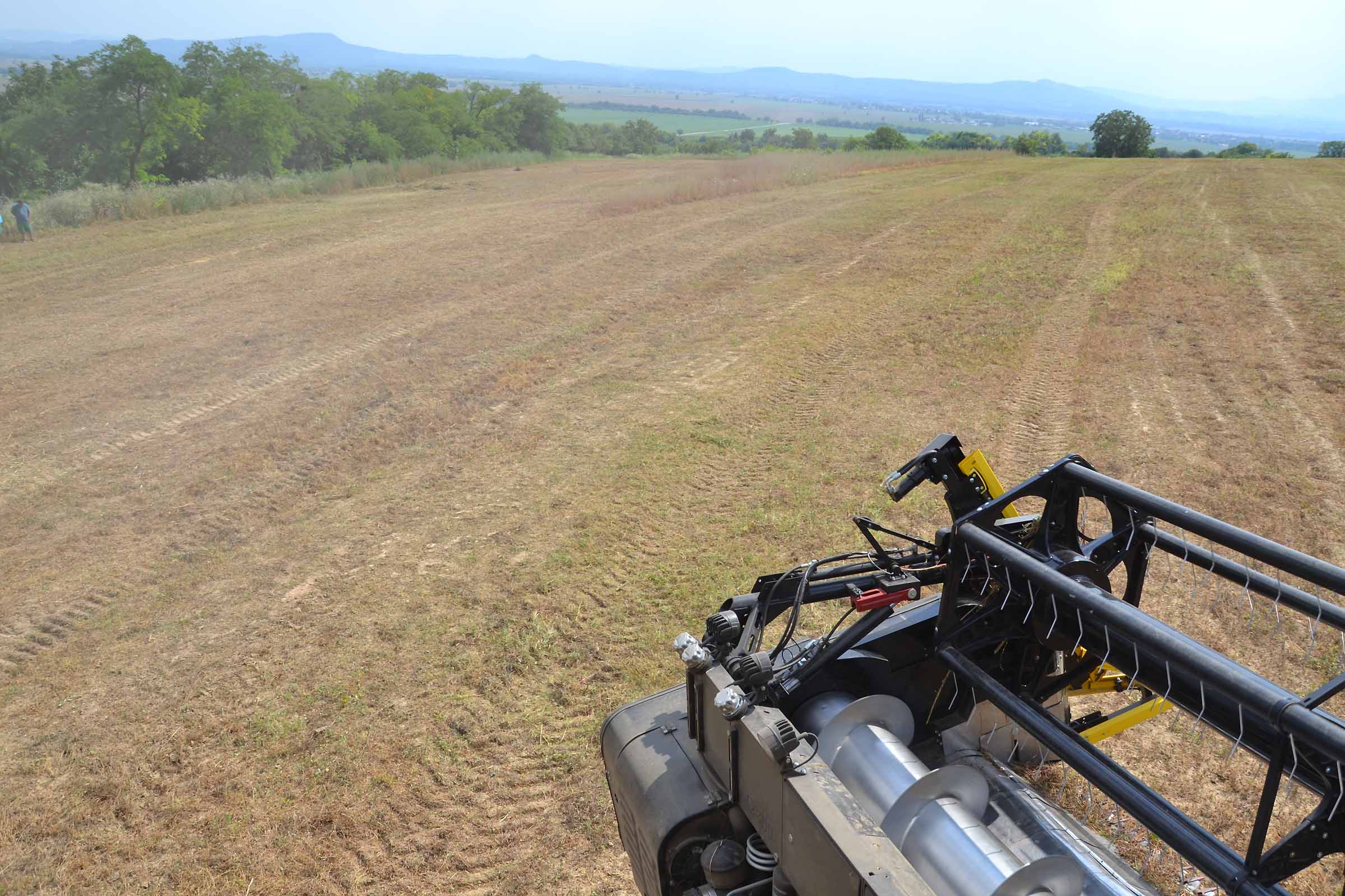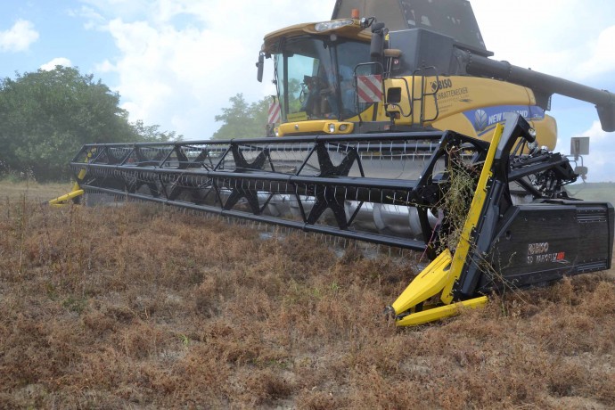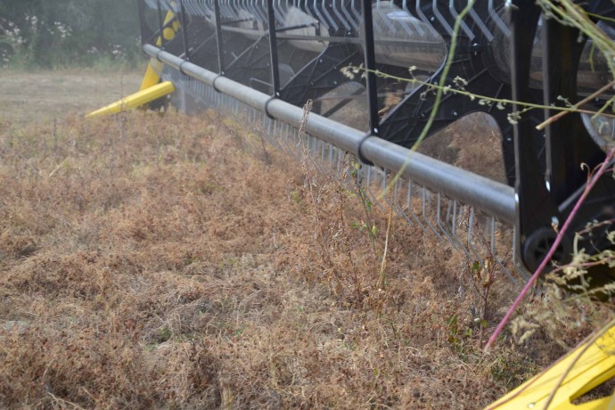 Il campo non era pianeggiante anche se non lo si può vedere nella fotografia. Il campo, prima di essere coltivato a lenticchie, era un frutteto. La raccolta della lenticchia è impegnativa con una barra di taglio da 7,5 m.; noi abbiamo utilizzato una testata da 10,7 m con un sistema FLESSIBILE.
