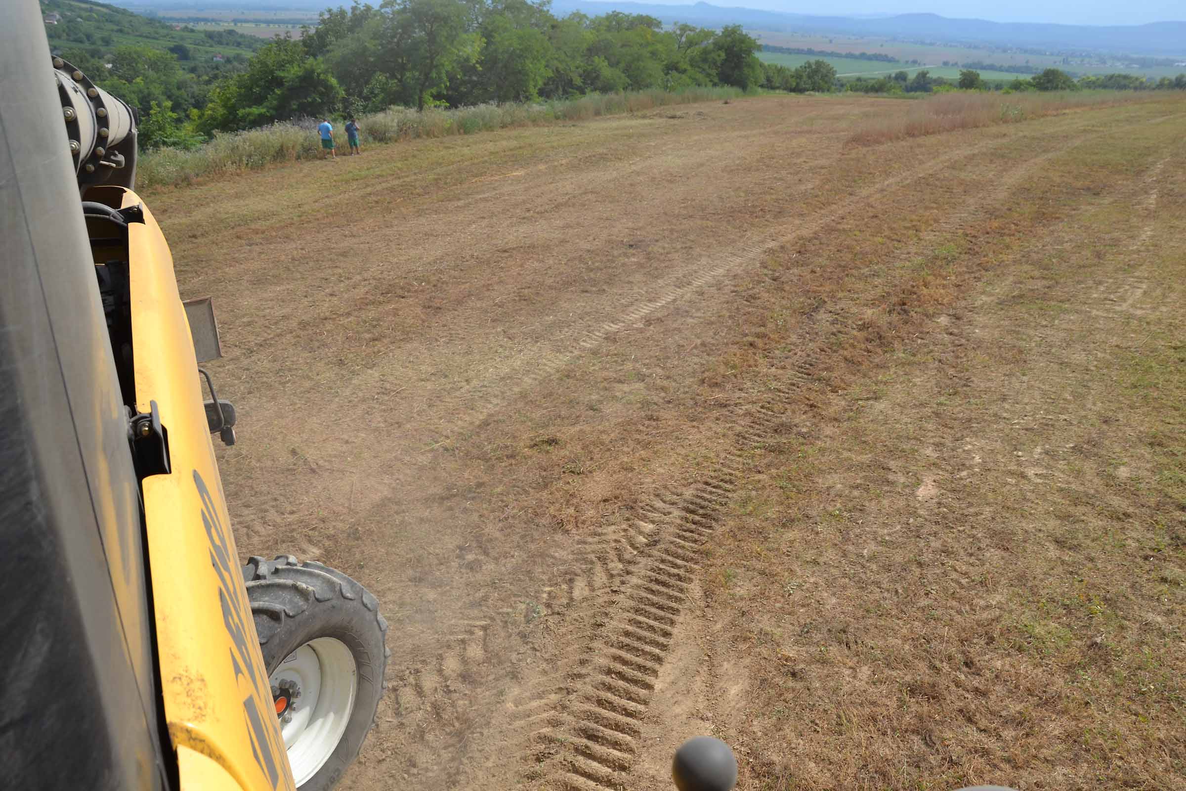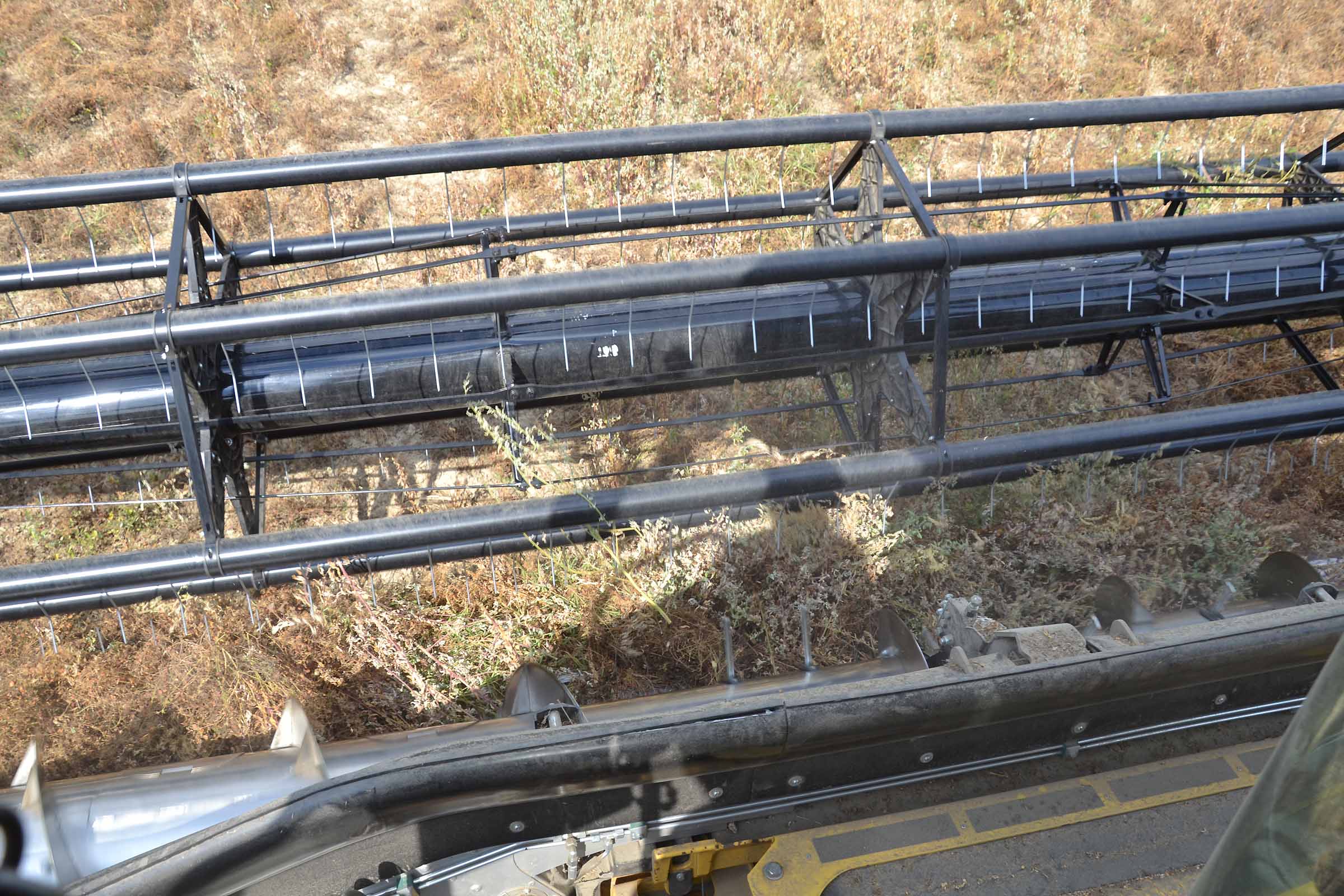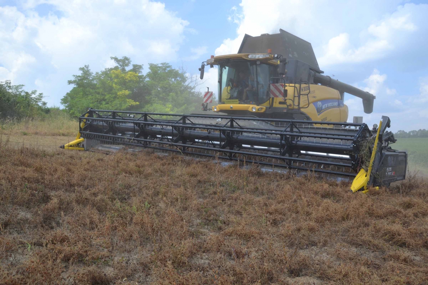 Il campo non era pianeggiante anche se non lo si può vedere nella fotografia. Il campo, prima di essere coltivato a lenticchie, era un frutteto. La raccolta della lenticchia è impegnativa con una barra di taglio da 7,5 m.; noi abbiamo utilizzato una testata da 10,7 m con un sistema FLESSIBILE.