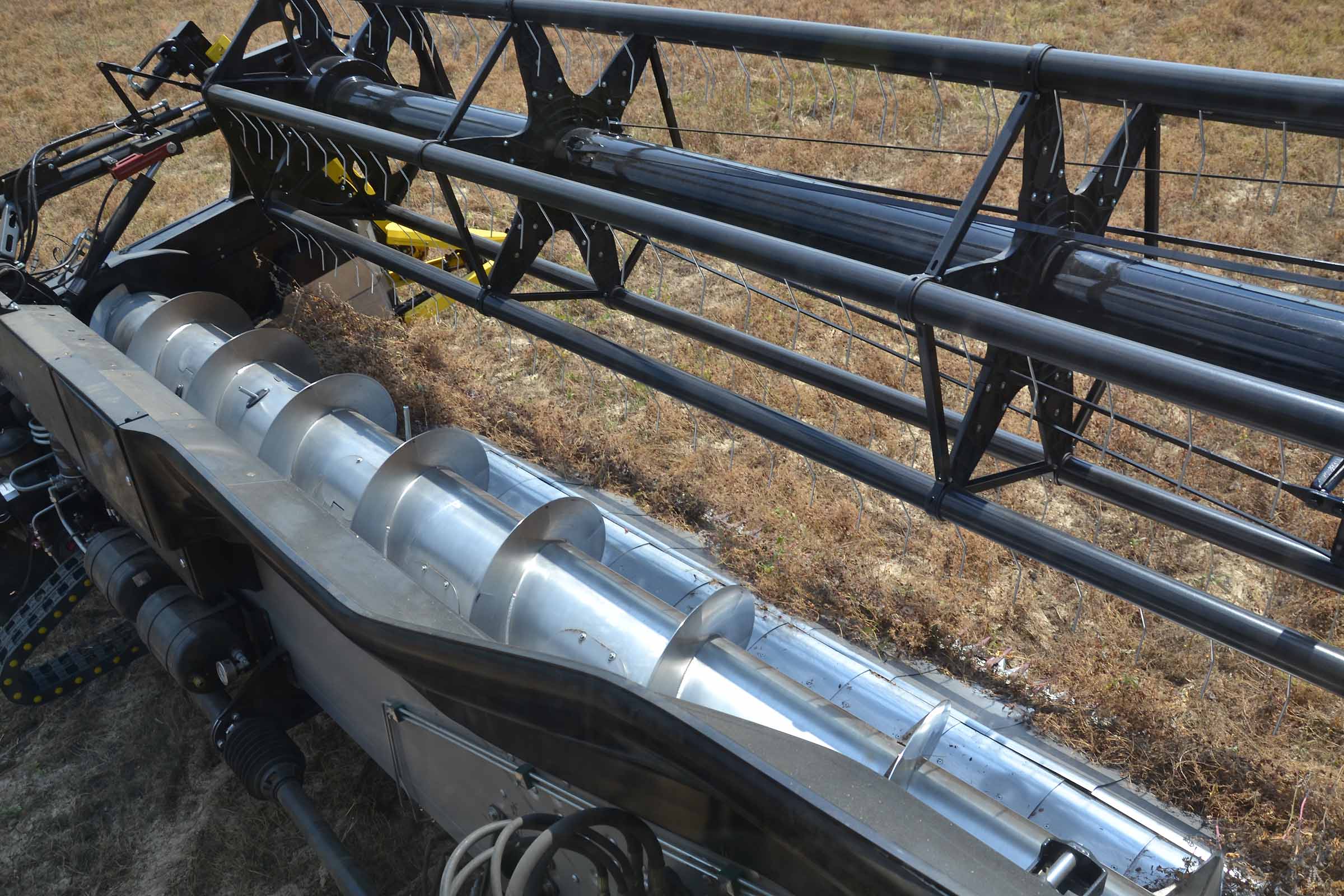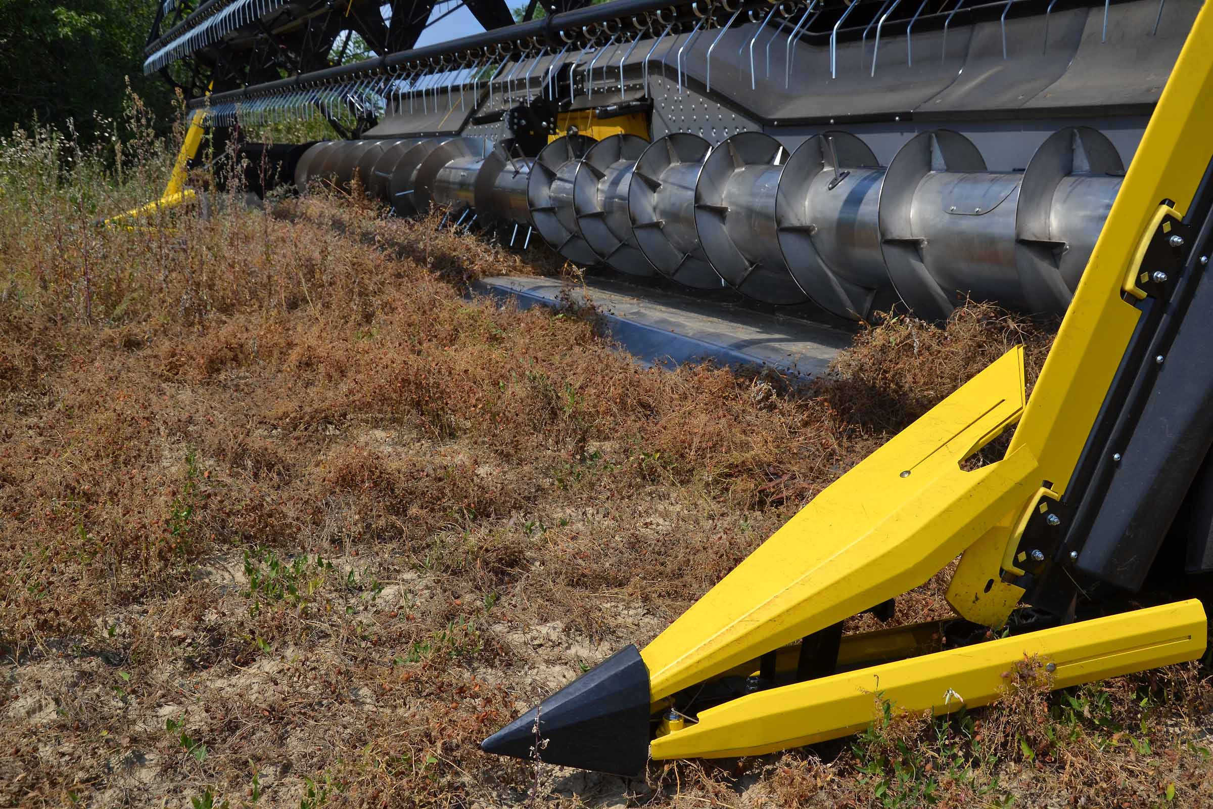 Come già accennato, le barre di taglio 3D sono equipaggiate di piattaforma vario e presentano il tipico scalino dietro alla lama del sistema FLESSIBILE. In modalità RIGIDA, la barra di taglio funziona in modo molto simile alla CropRanger, mentre in modalità 100% FLESIBILE la differenza è enorme. Si adatta infatti perfettamente al terreno proteggendo la mietitrebbia dai sassi e con la piattaforma vario si adatta a molteplici tipologie di raccolto a differenza delle testate standard. Nell'immagine si evidenzia una condizione di lavoro tipica nella raccolta di colture speciali: il prodotto scivola verso la coclea della testata con il minimo aiuto da parte dell’aspo.