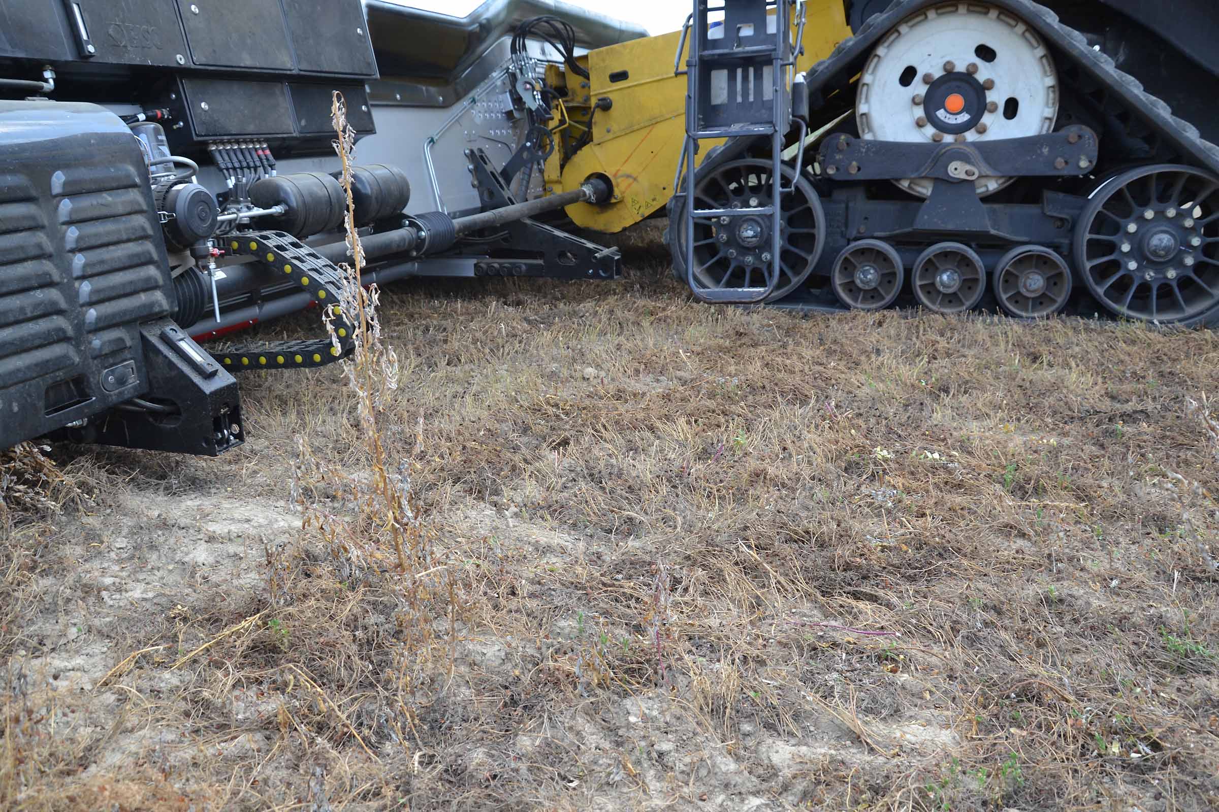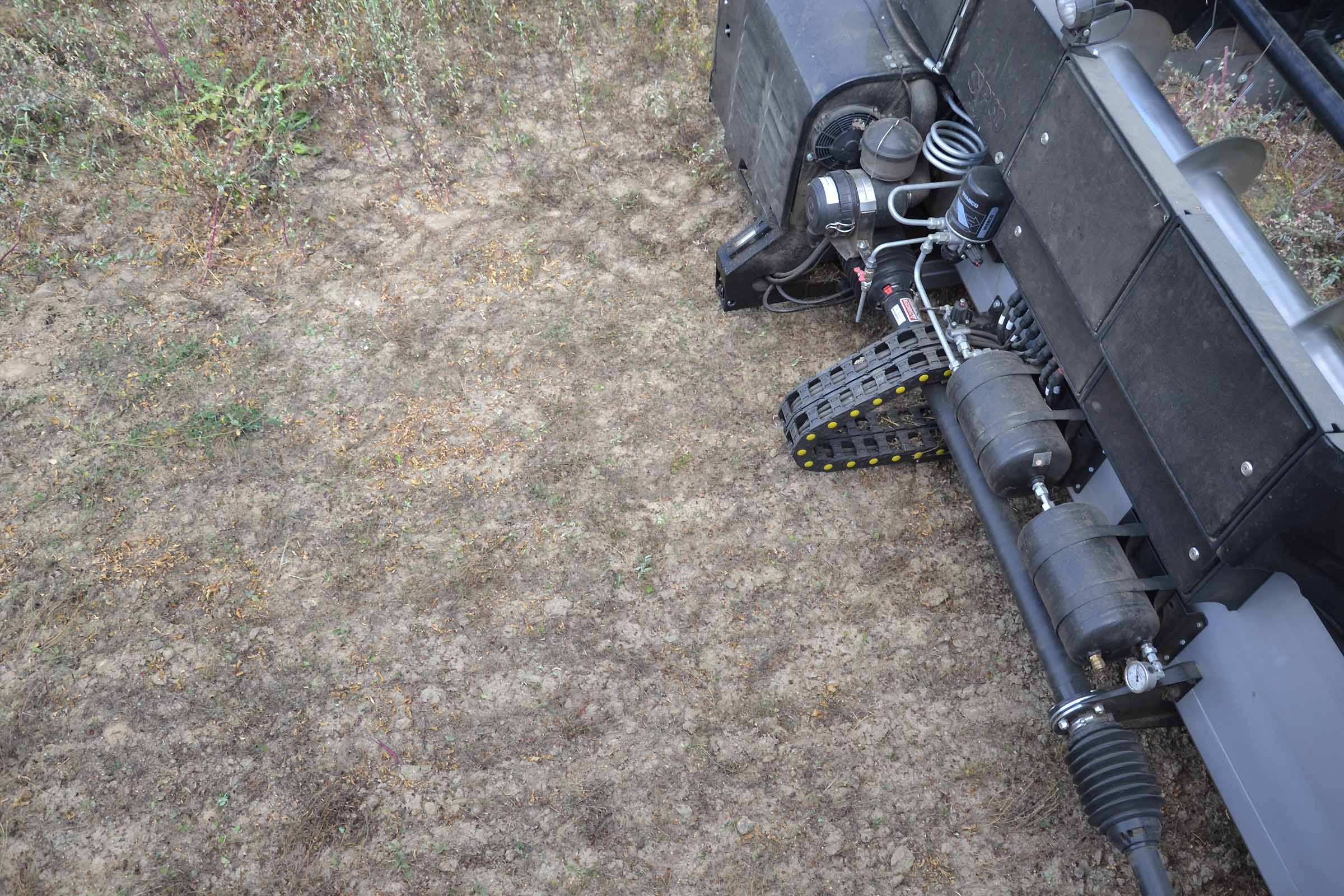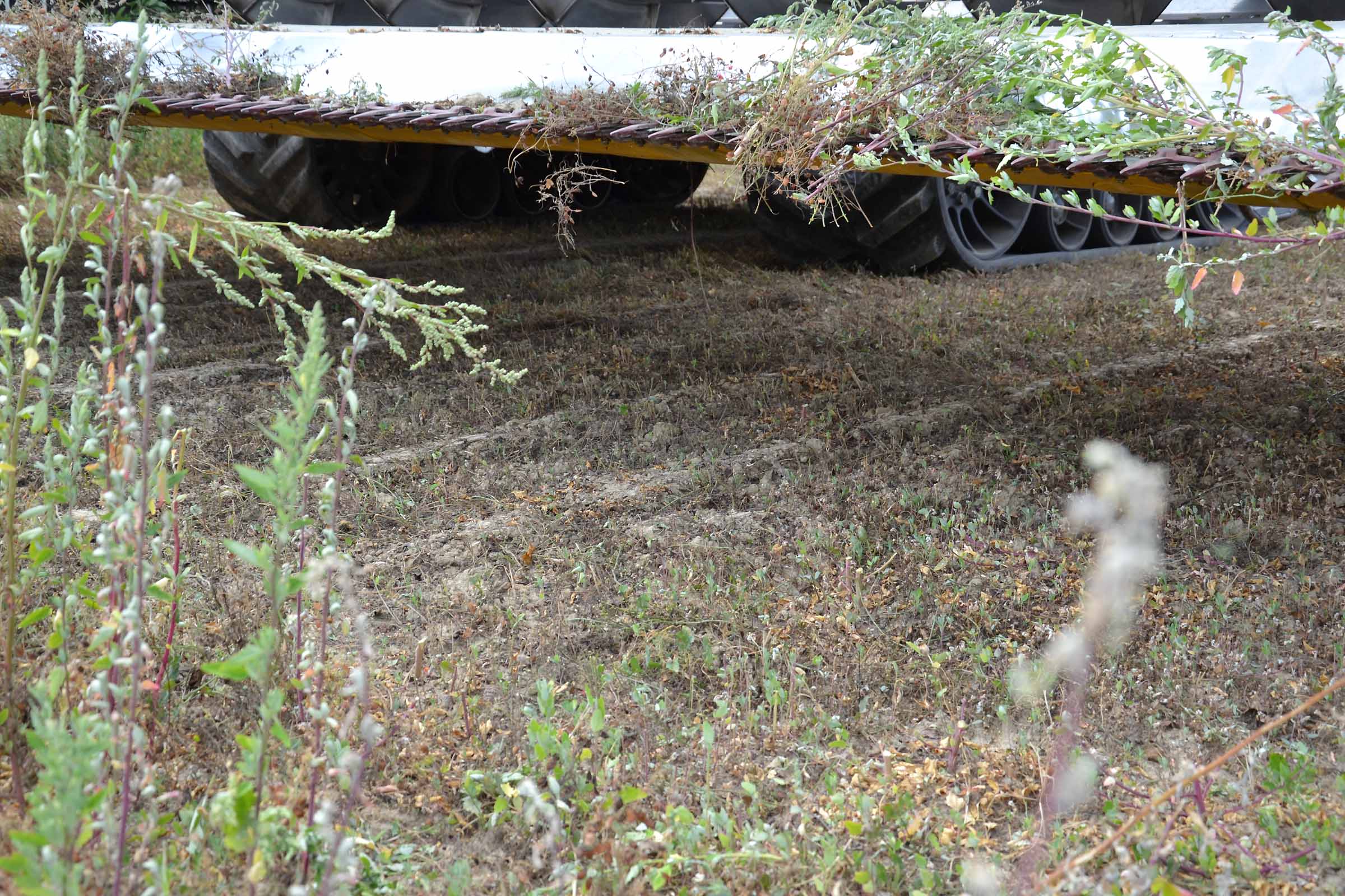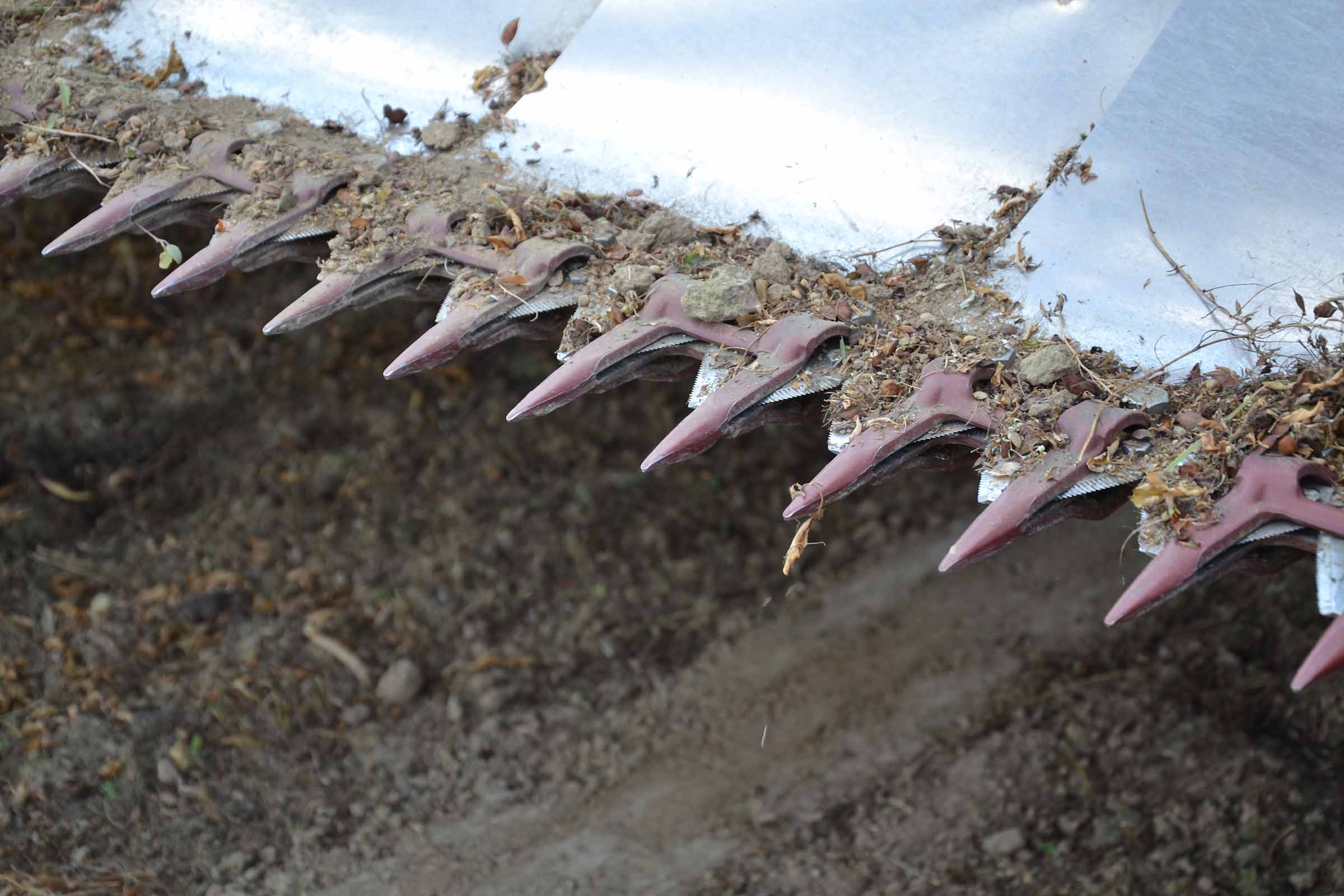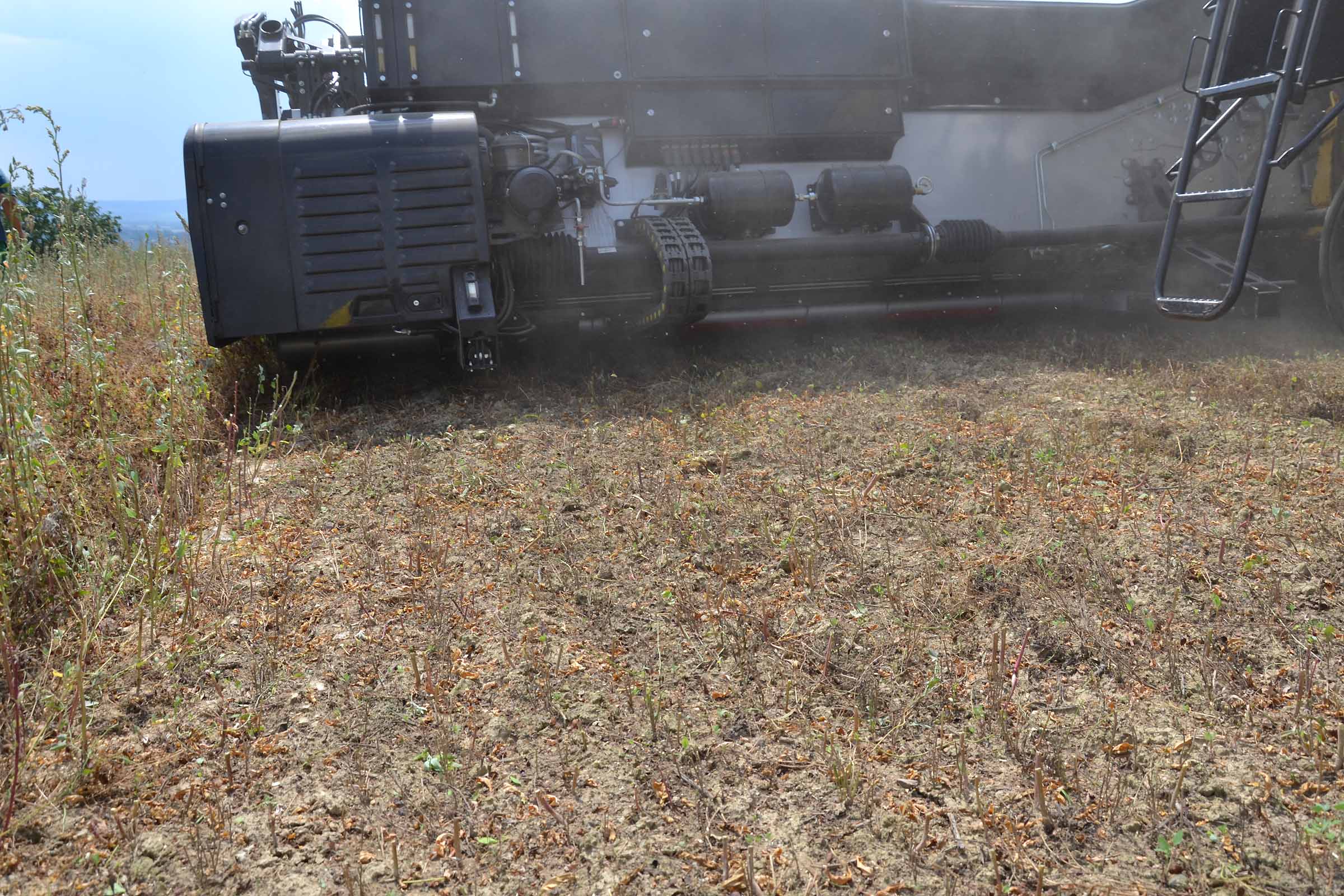 Nella foto si apprezza come il terreno su cui abbiamo lavorato fosse asciutto. In queste condizioni è possibile lavorare con la pressione al suolo elevata senza alcun rischio di provocare accumuli di terreno al di sotto della lama di taglio. Gli agricoltori hanno interesse ad avere un taglio radente al suolo mentre il trebbiatore deve sempre considerare i maggiori costi derivanti dalla maggiore usura.