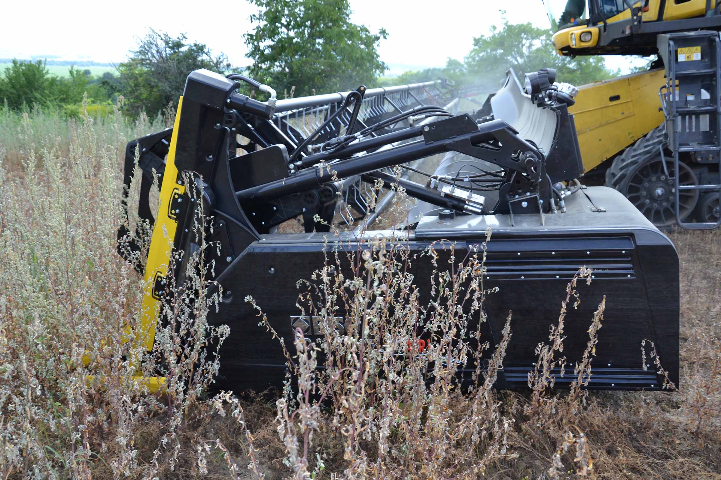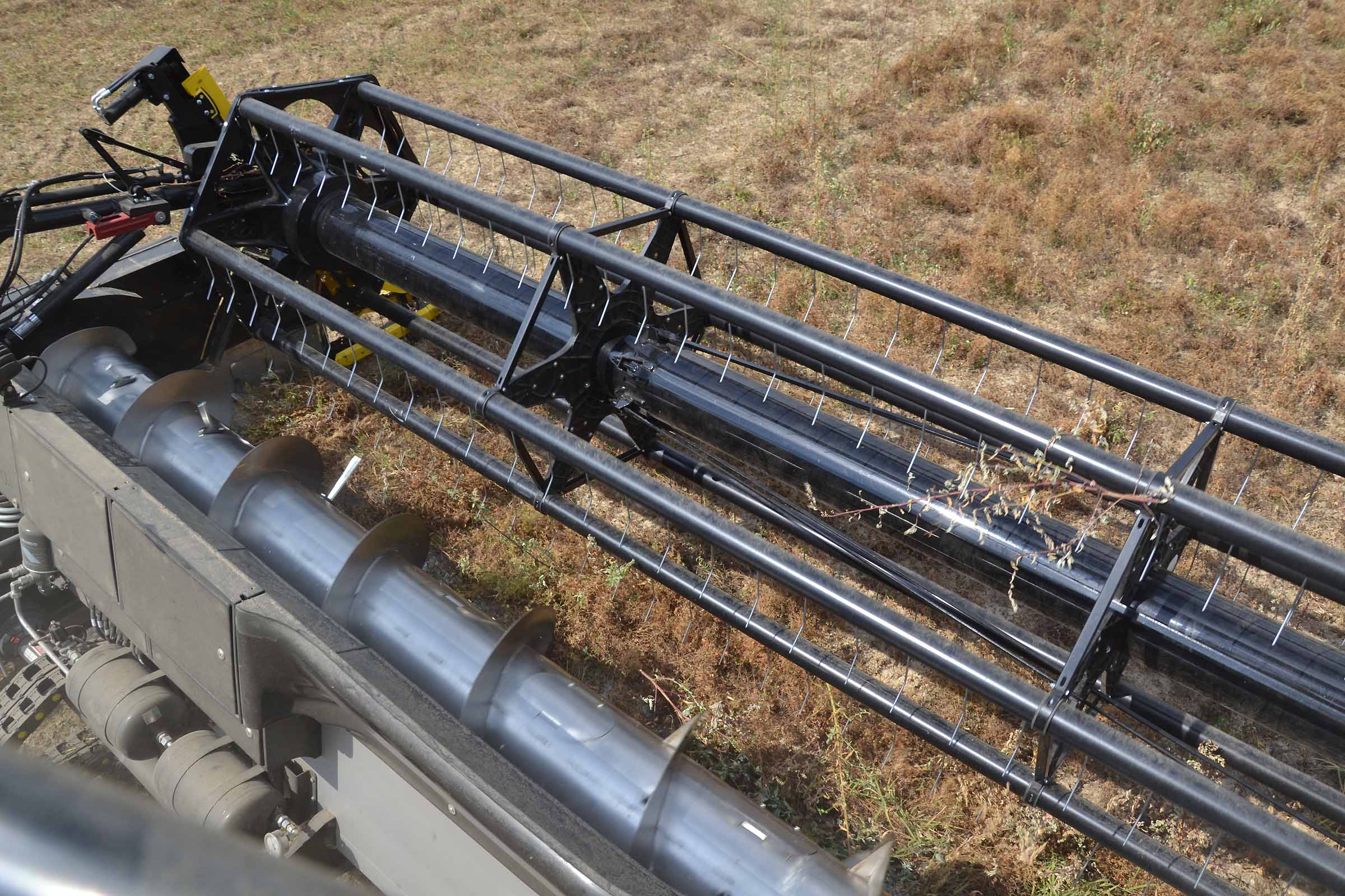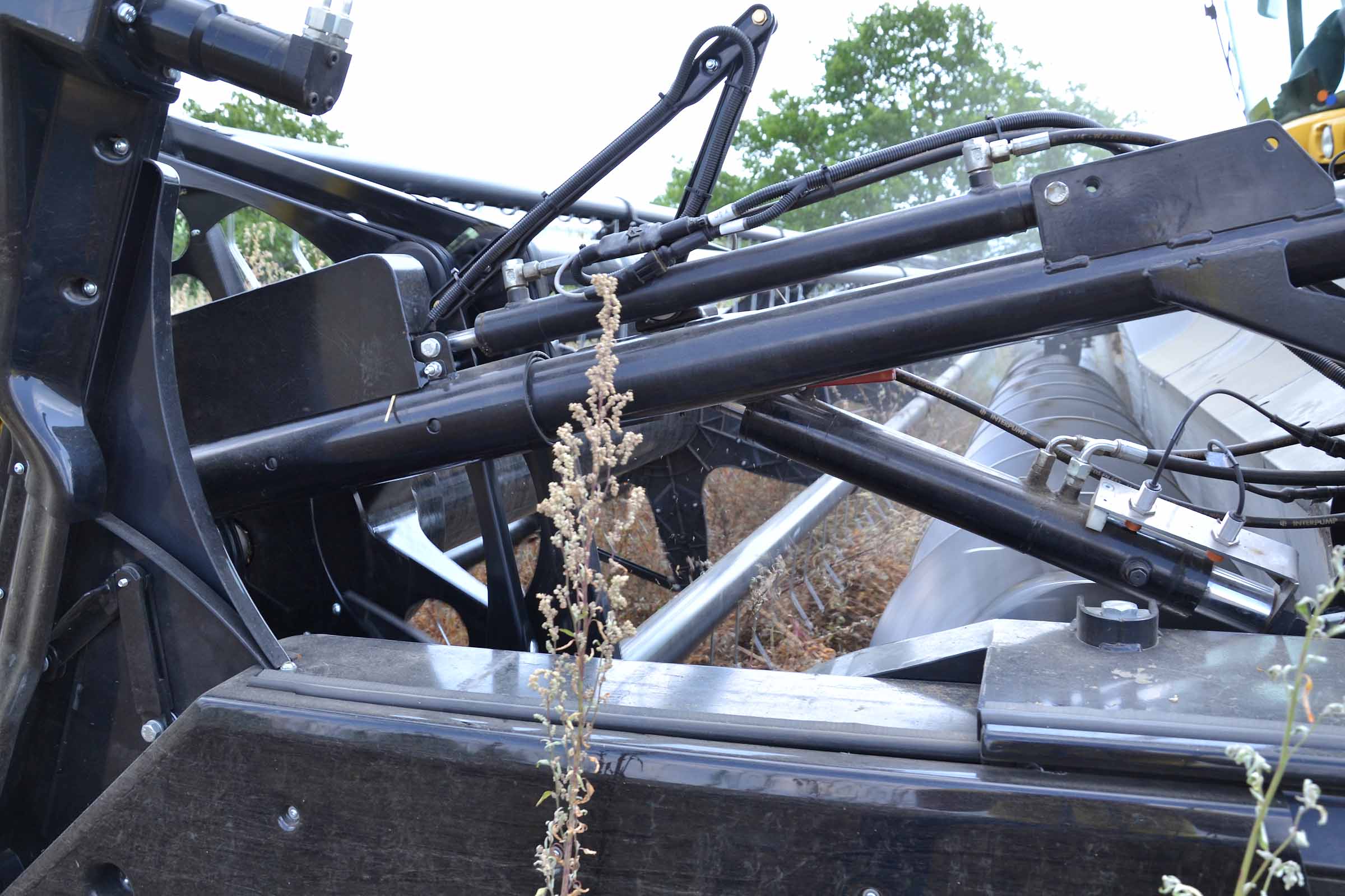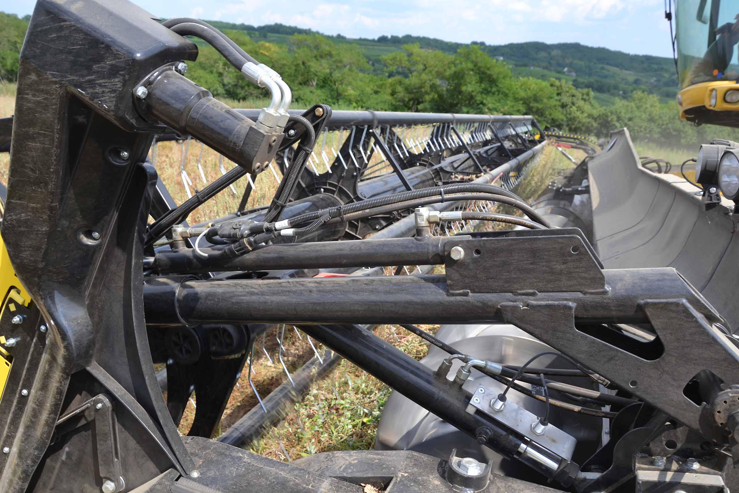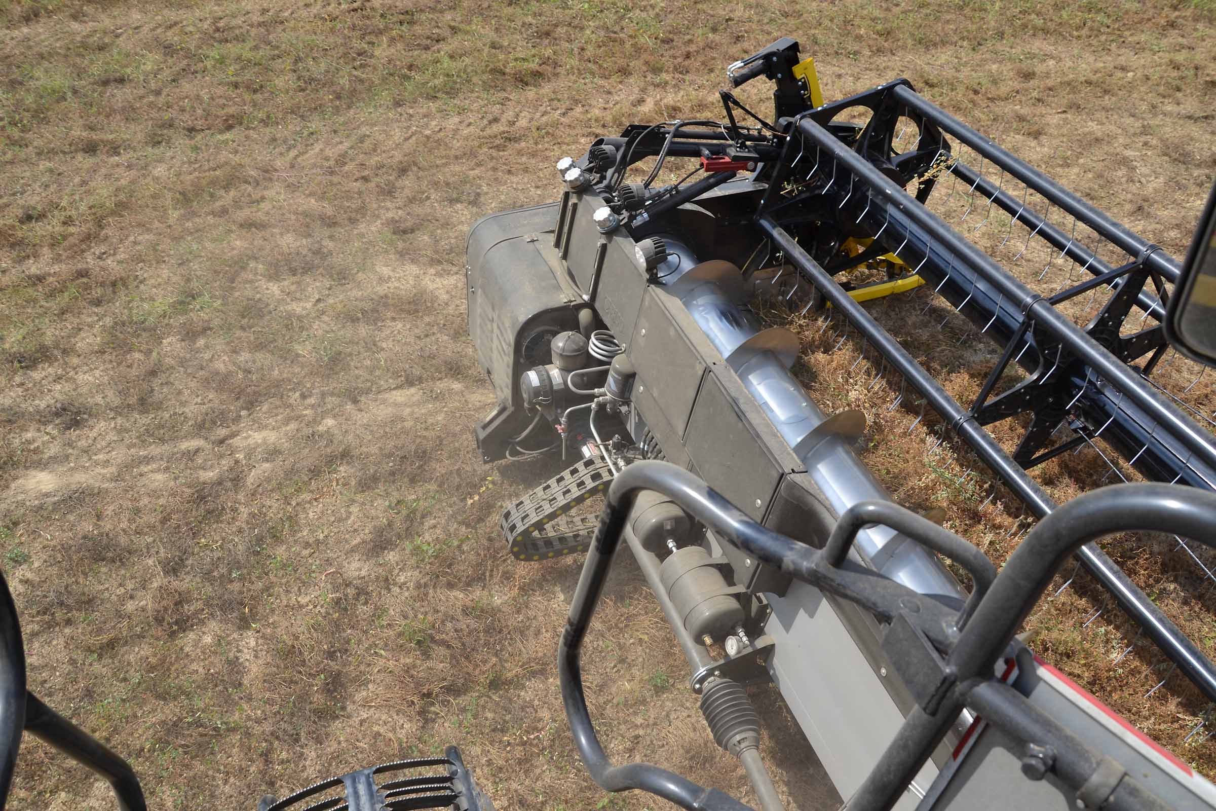In caso di necessità si può lavorare con l’aspo davanti alla barra falciante come nella foto. Su una normale testata flessibile, è solo una questione di tempo generare una interferenza tra denti dell’aspo e la lama di taglio. Grazie al nostro sistema di Anti Collisione la barra di taglio 3D previene questo evento.