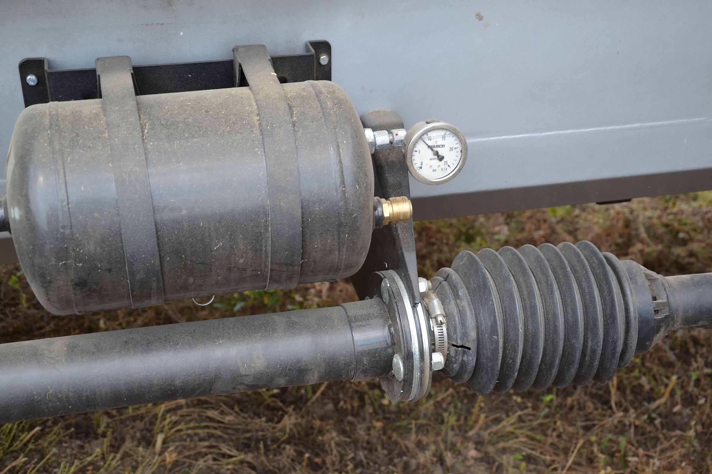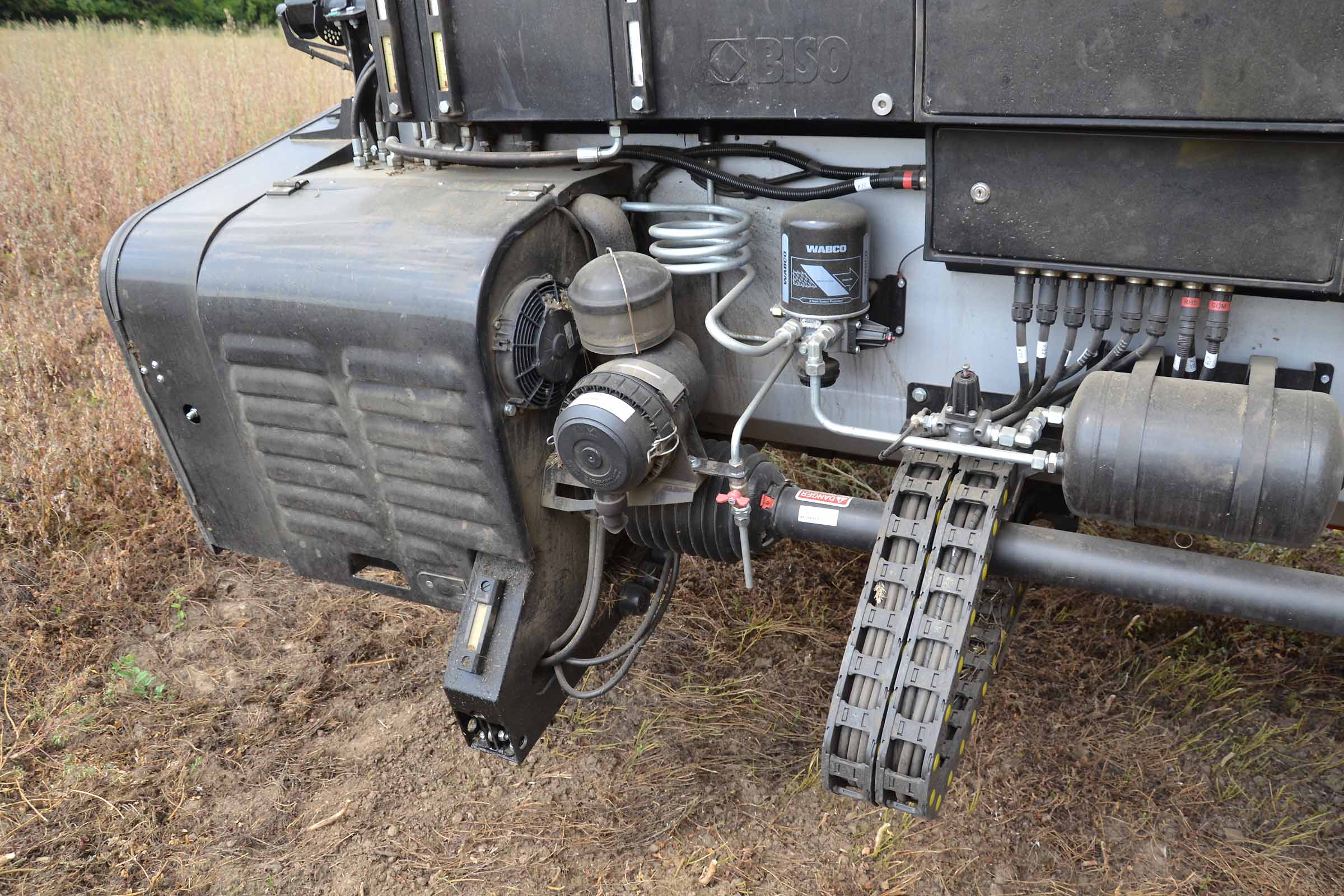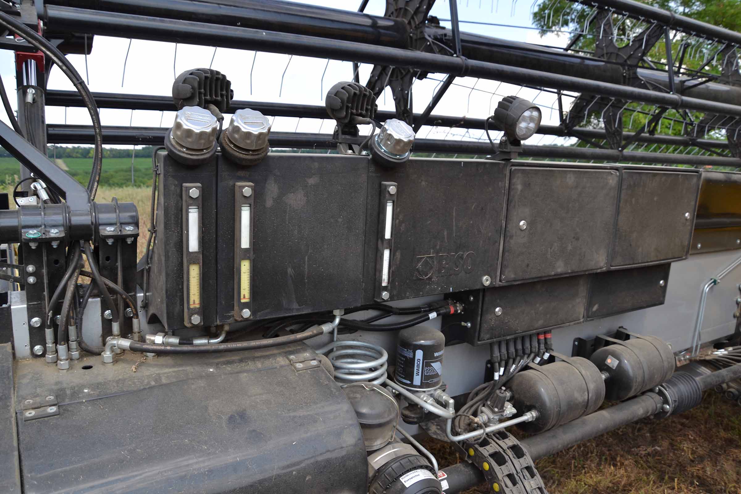 Il sistema ad aria compressa regola in modo indipendente la sospensione dei singoli parallelogrammi della barra falciante. Il compressore d'aria è azionato dall'albero cardanico della testata.