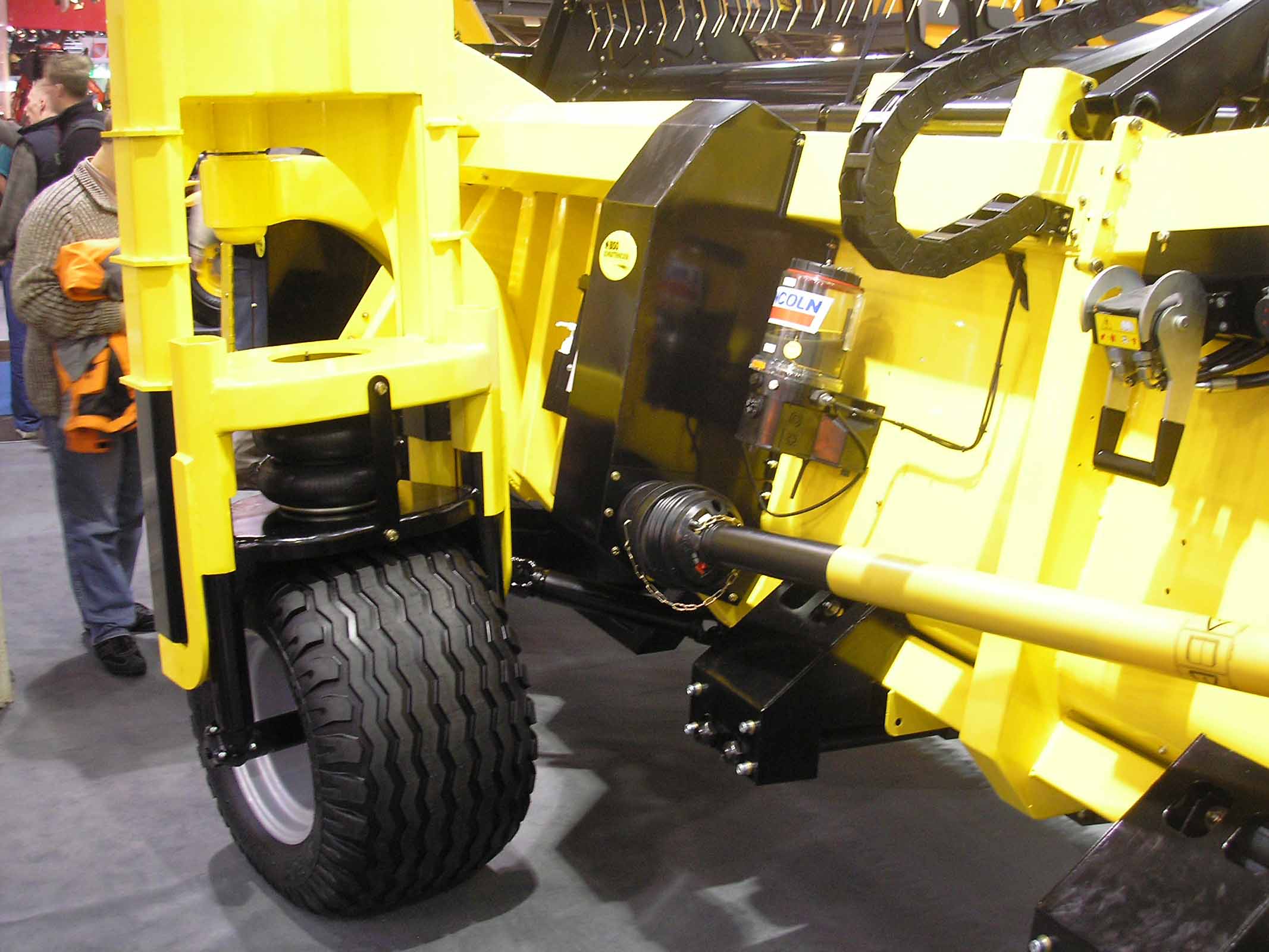 Unique design of the support wheels of the header with air suspension. The BISO stand at Agritechnica 2007. Look at the drive of the auger in the left 1/3 of the header.